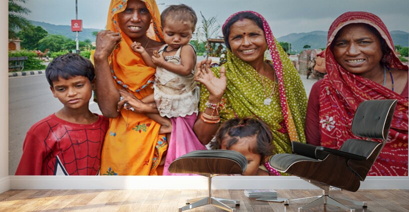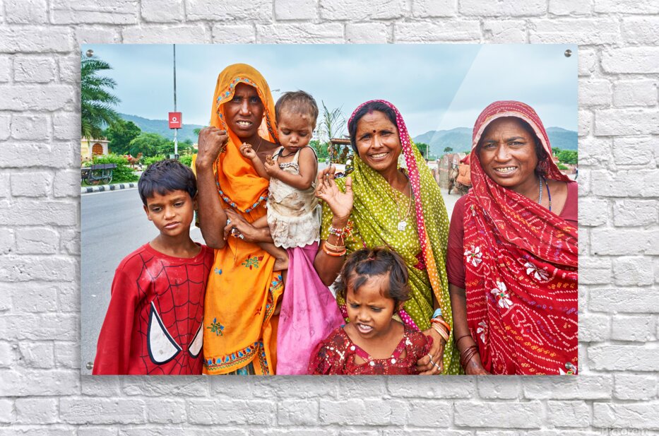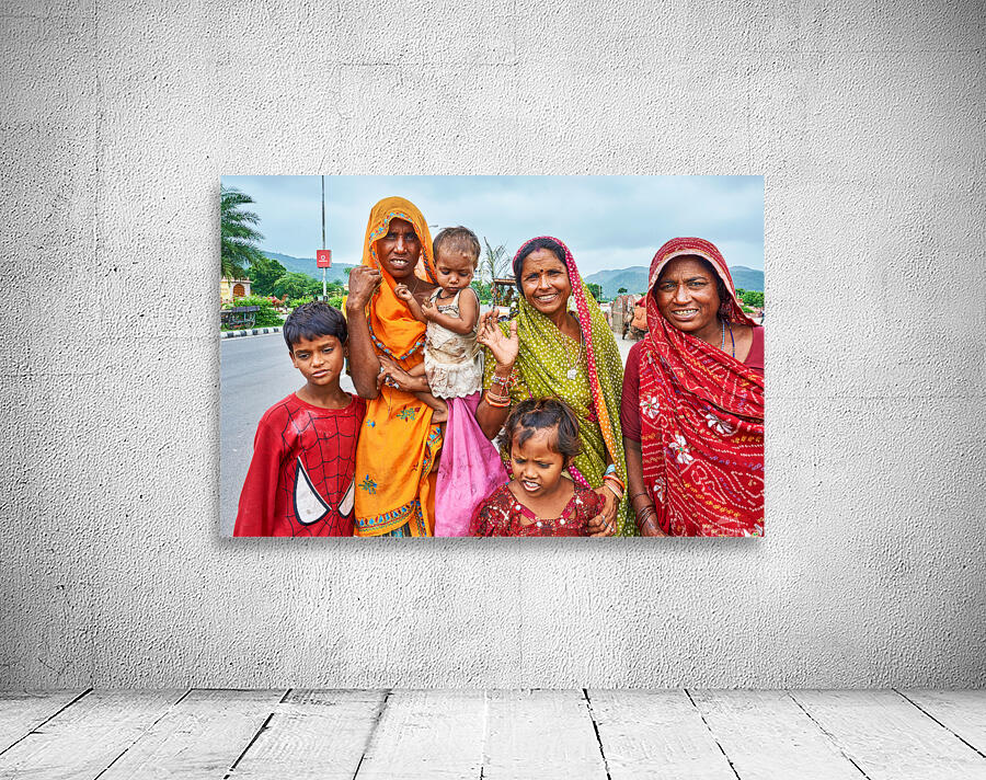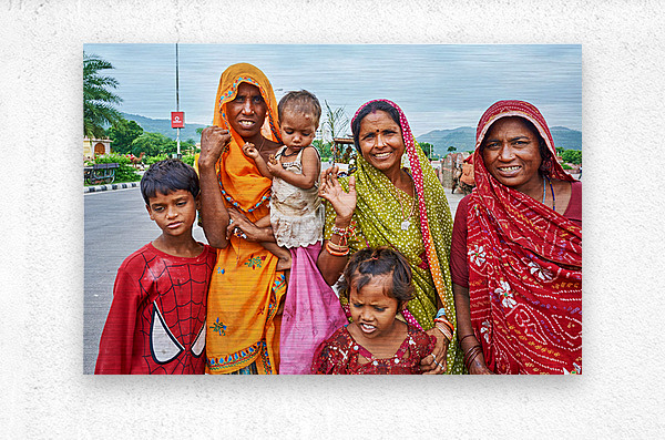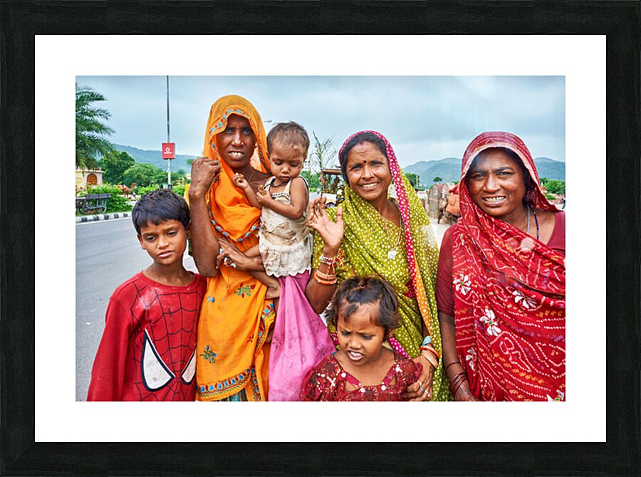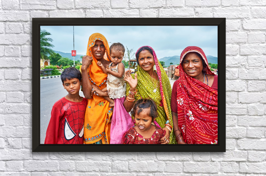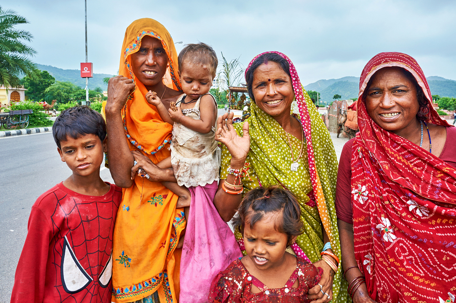Women and children dressed in colorful clothes stand together in Amber Rajasthan. They share smiles while enjoying their time outdoors.