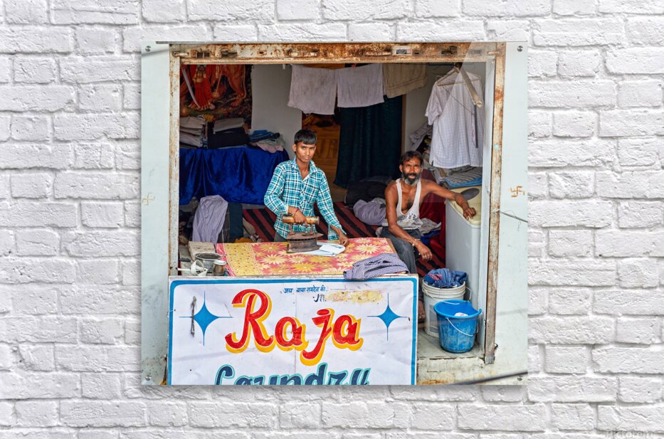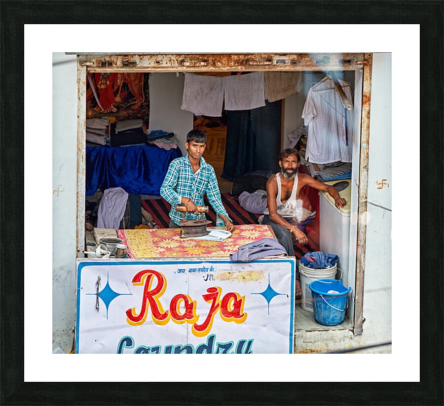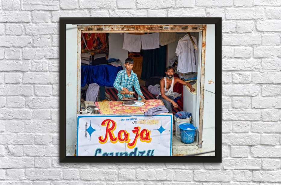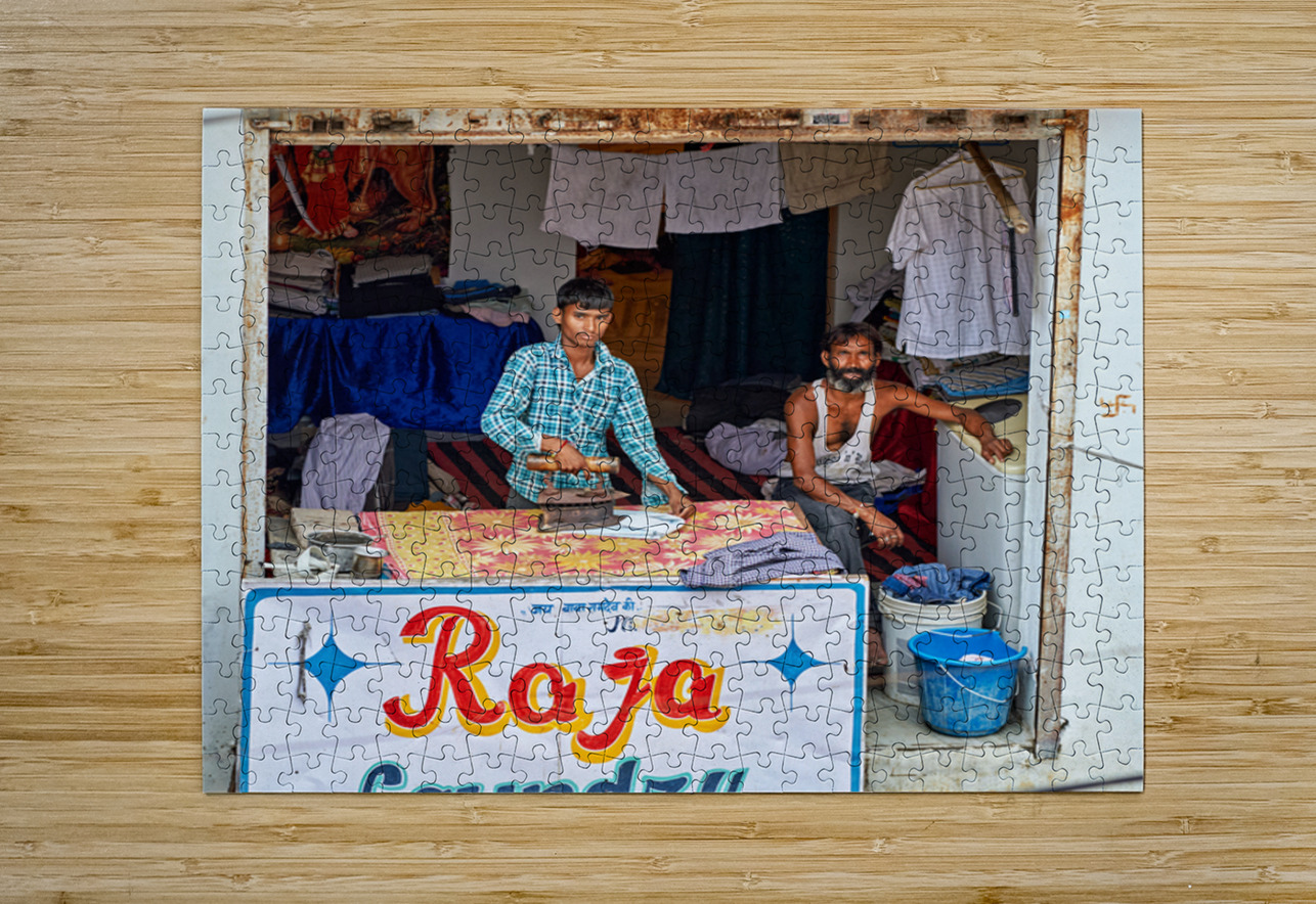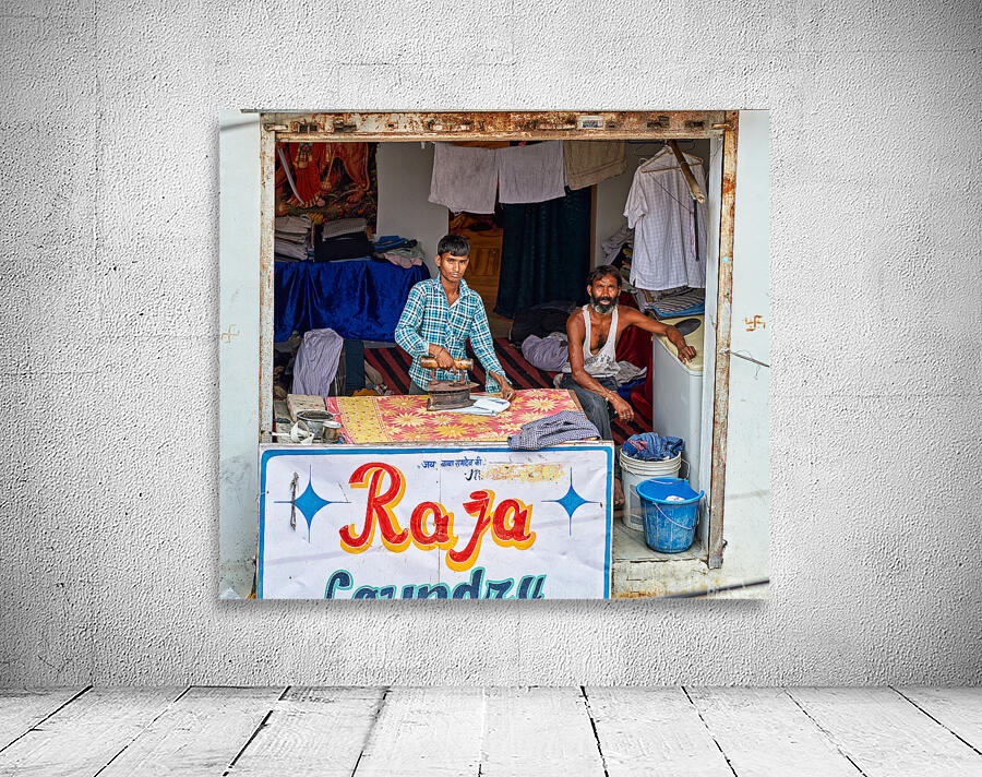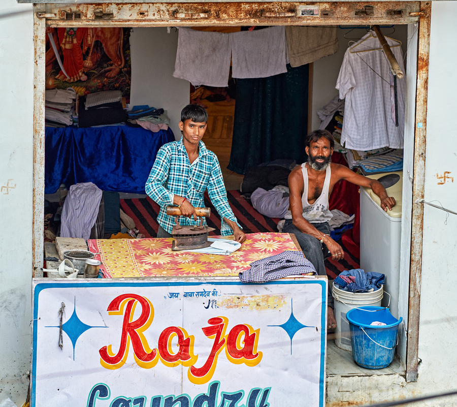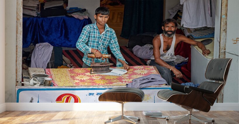 Two men are ironing clothes in a shop in Bundi Rajasthan. One man is actively using an iron while the other observes.