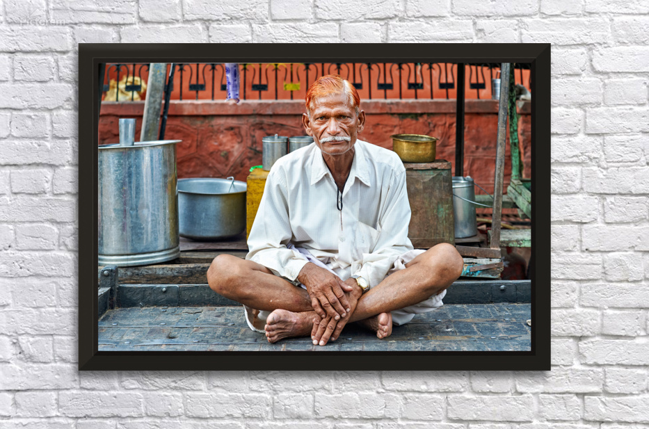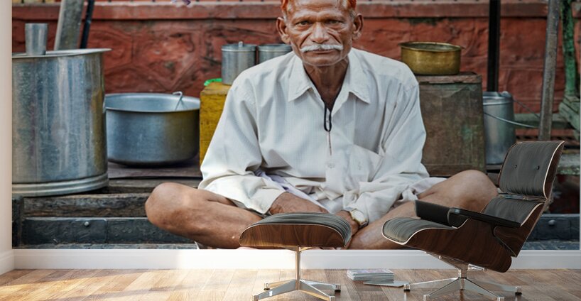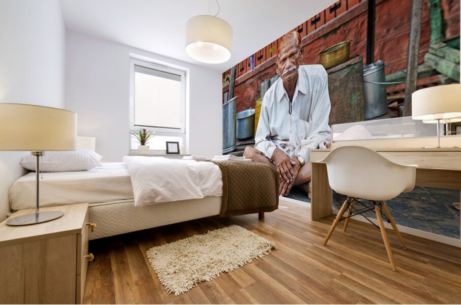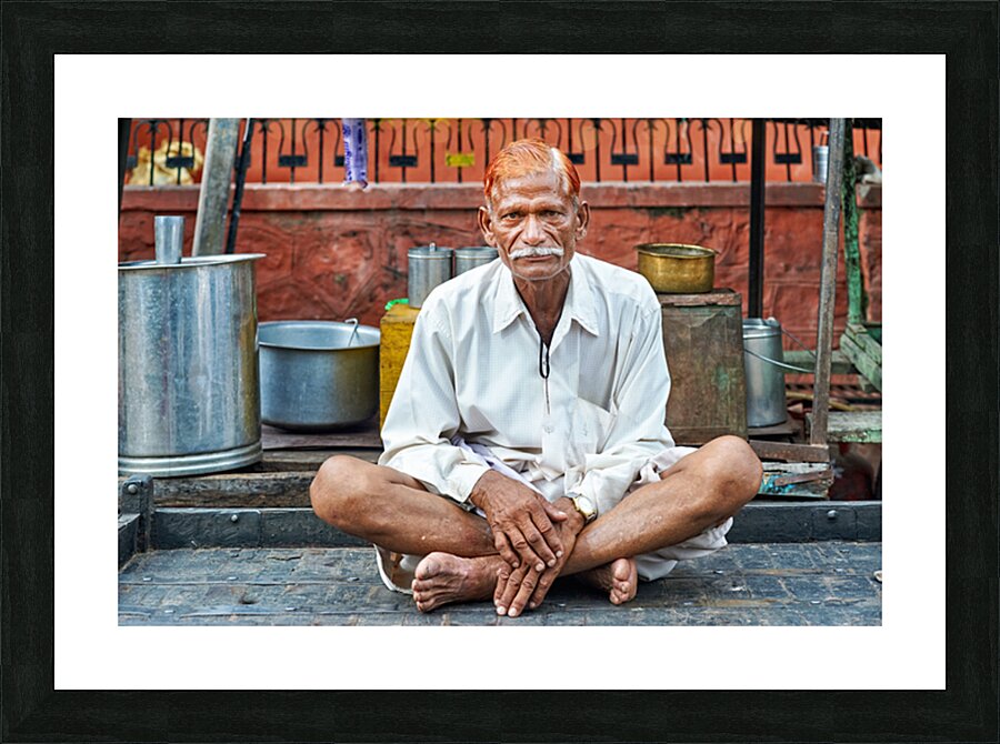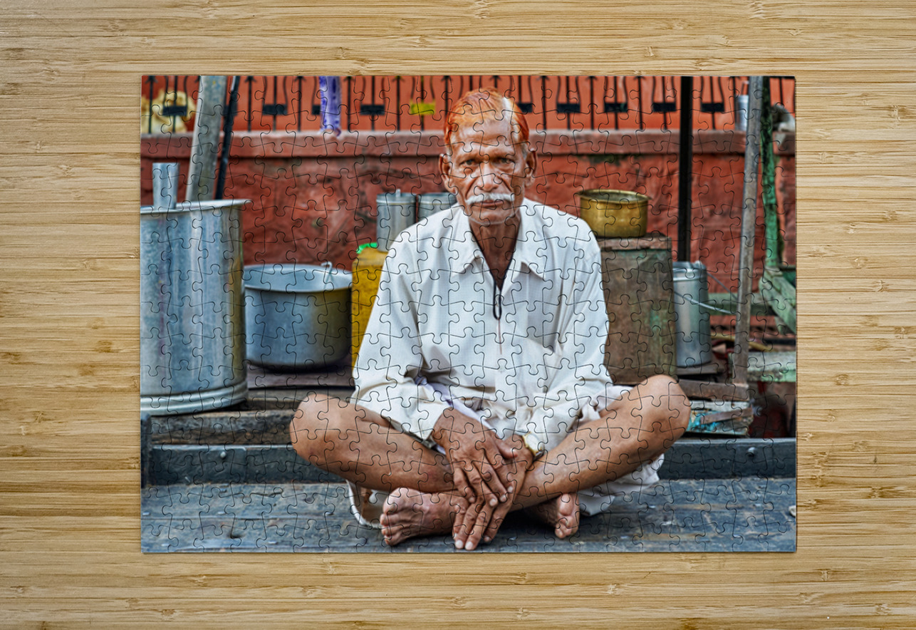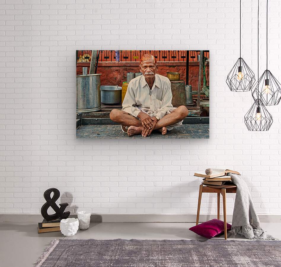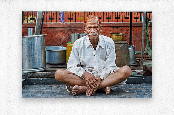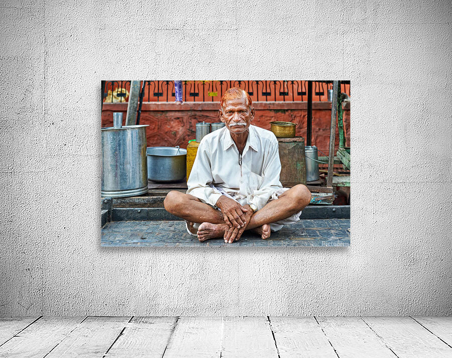 An old man sits on a platform in Bundi Rajasthan. He is dressed in simple clothes and has a calm demeanor while surrounded by everyday items.