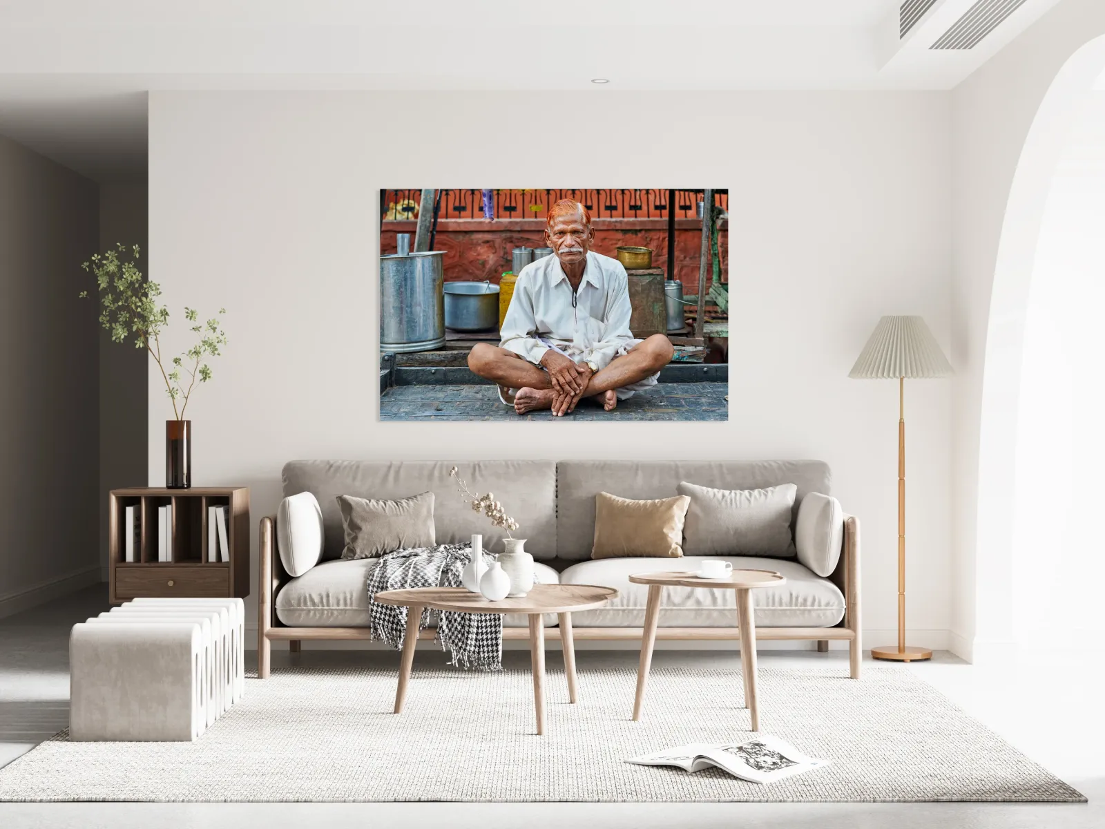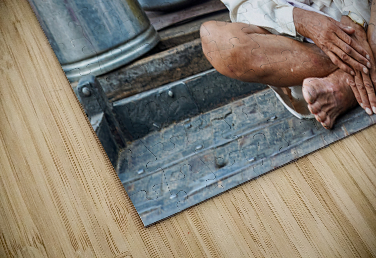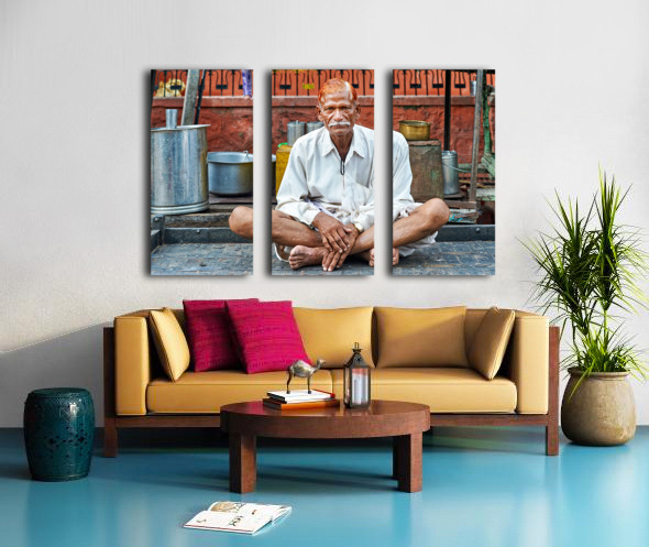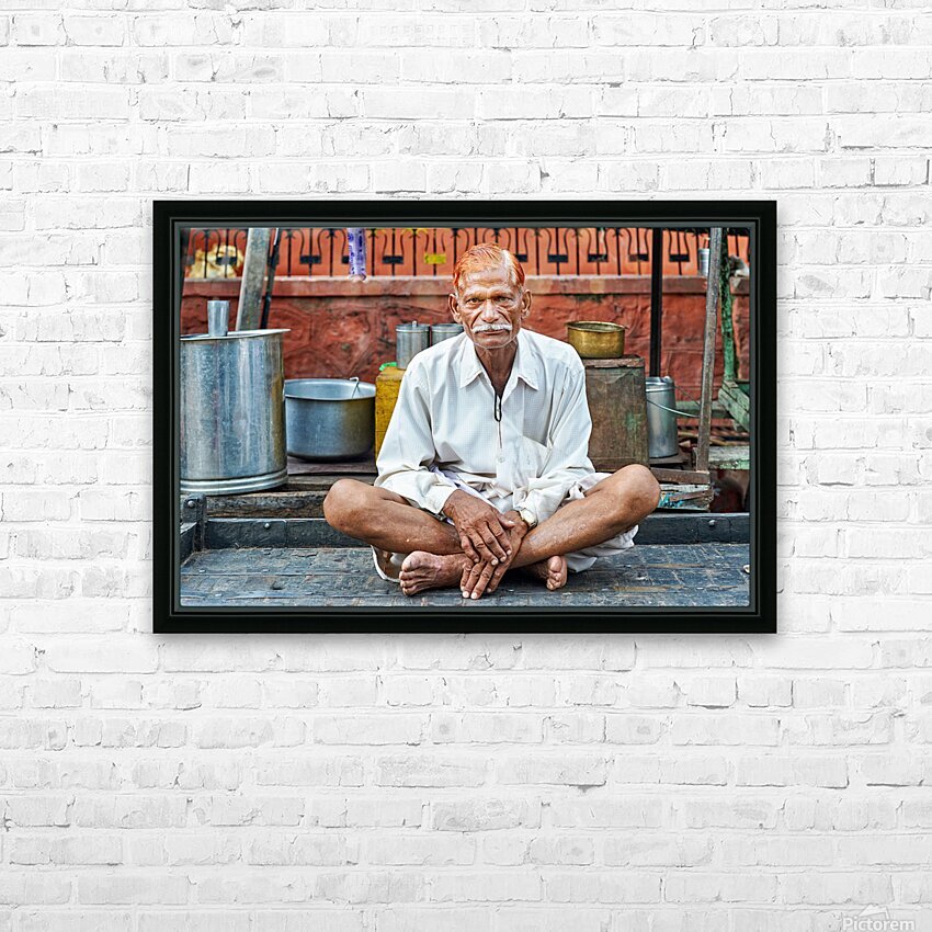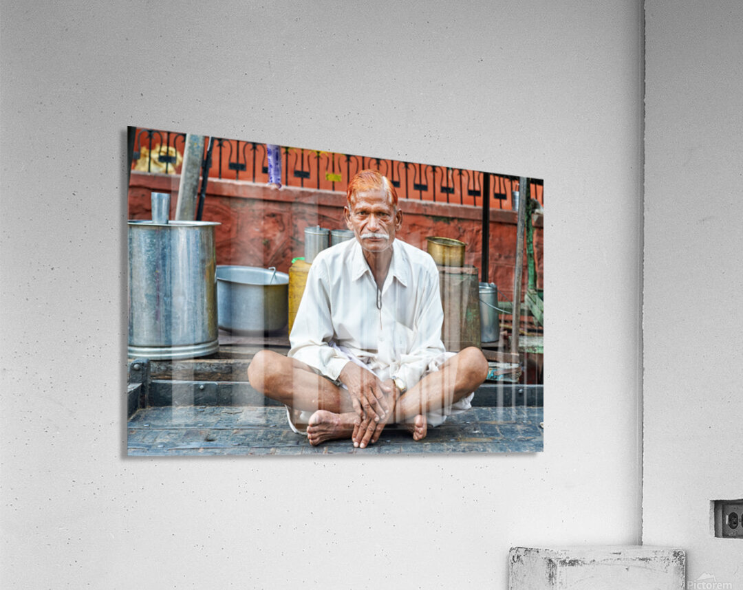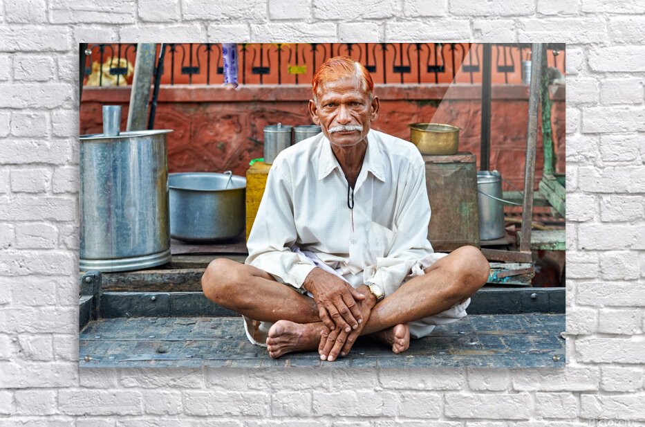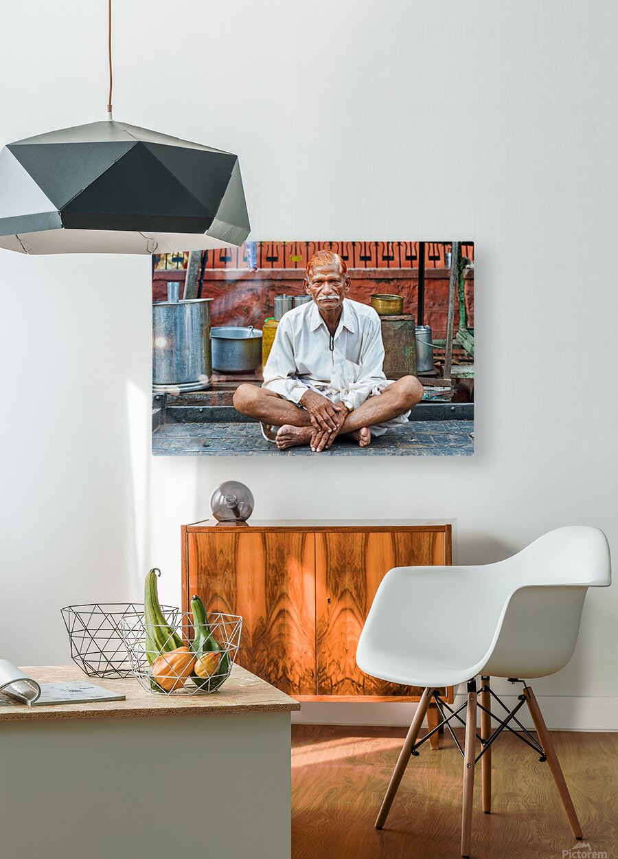 An old man sits on a platform in Bundi Rajasthan. He is dressed in simple clothes and has a calm demeanor while surrounded by everyday items.