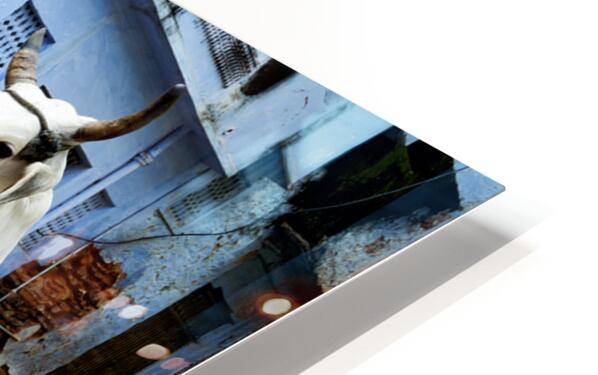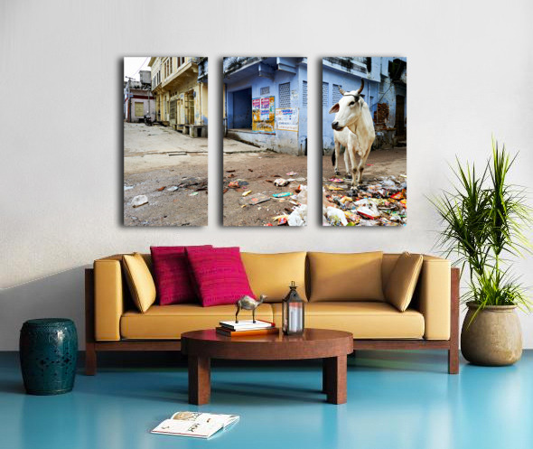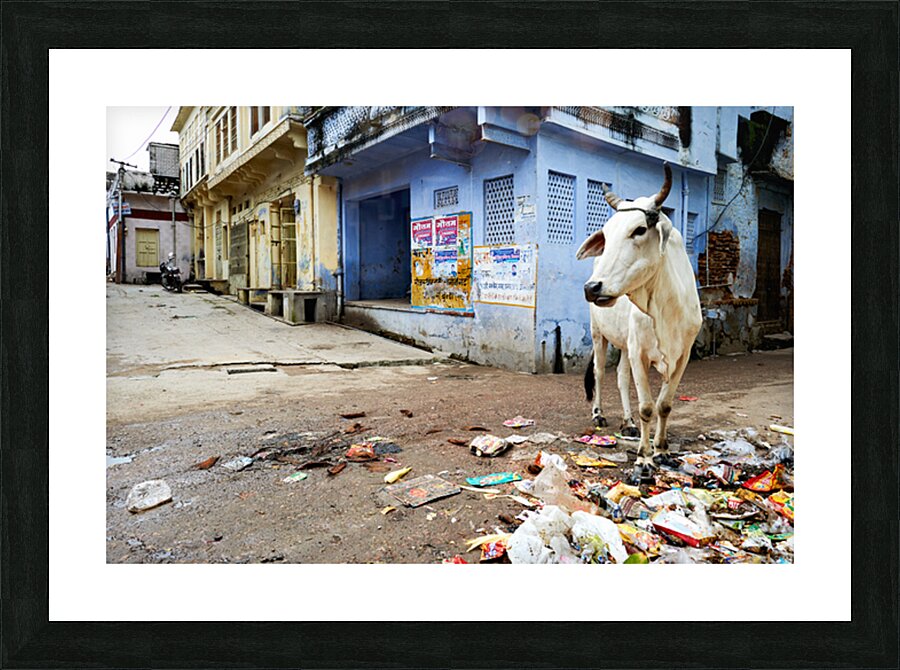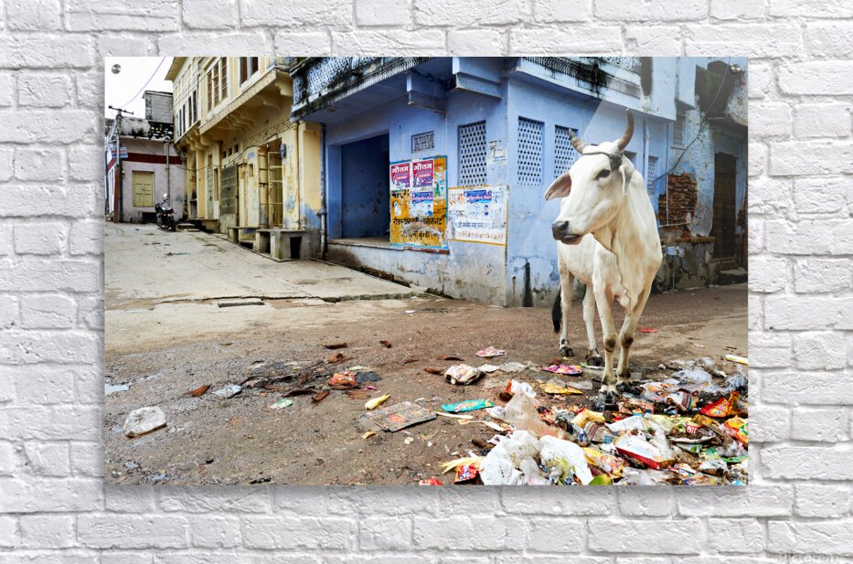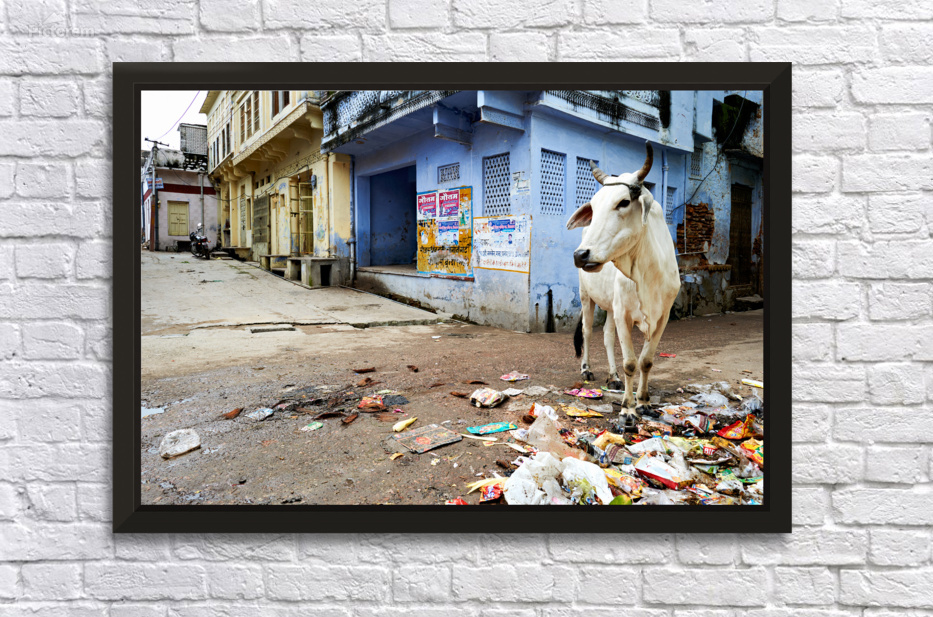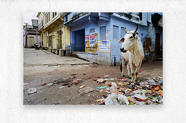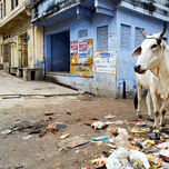 Cows walk in the streets of Bundi Rajasthan surrounded by litter and buildings. This scene shows daily life in this city.