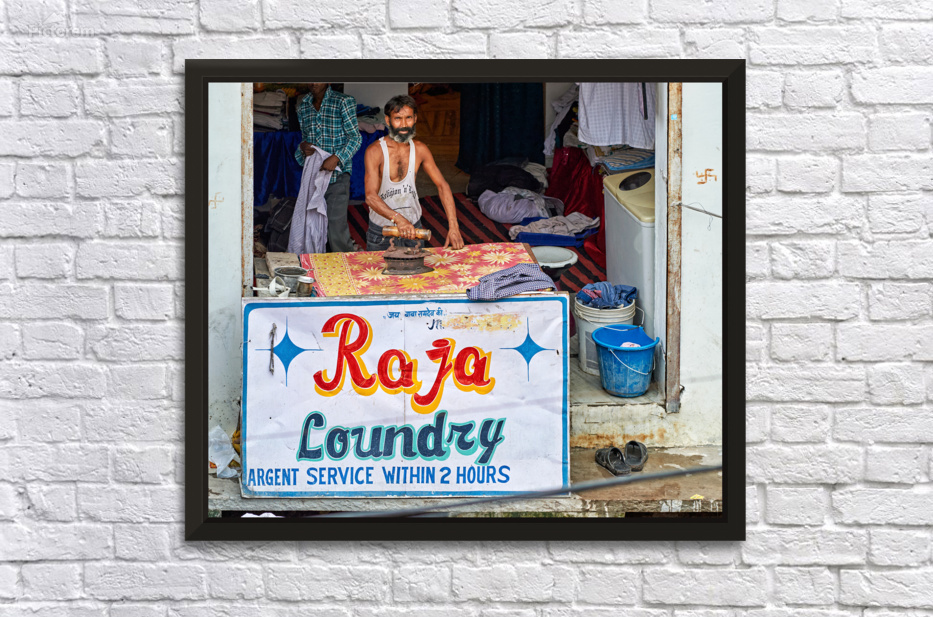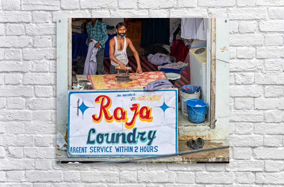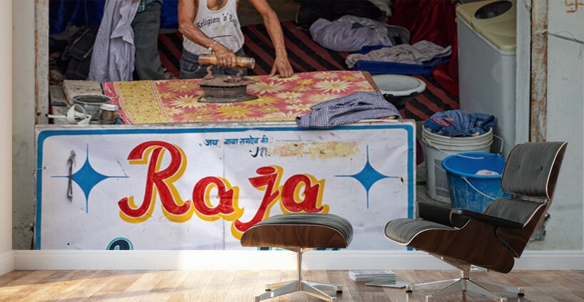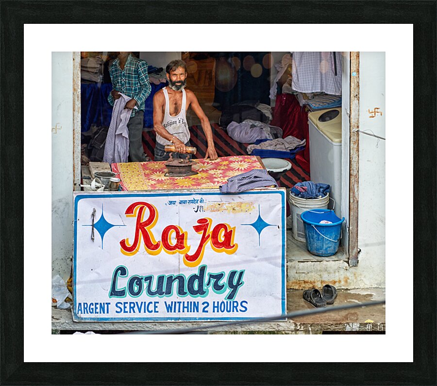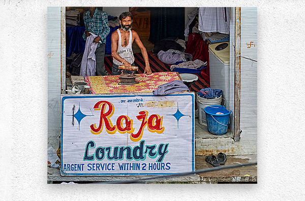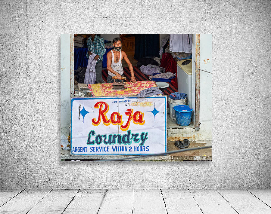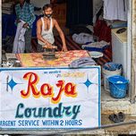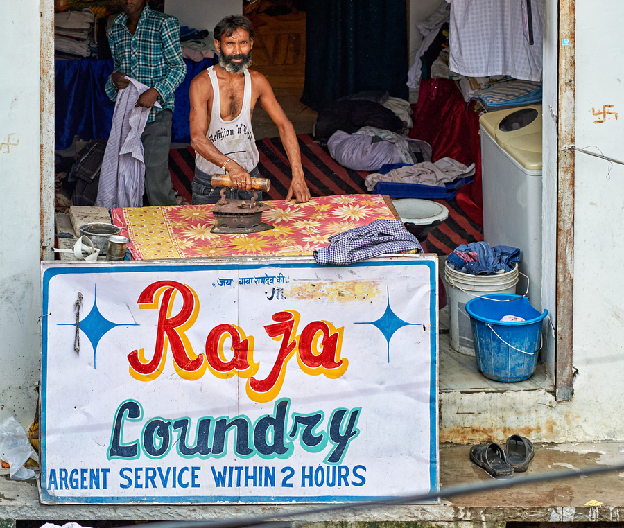 A man is ironing clothes at Raja Laundry in Bundi Rajasthan. The laundry is busy with clothes around him.