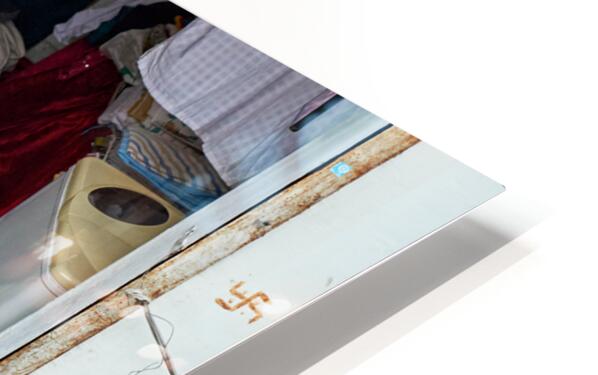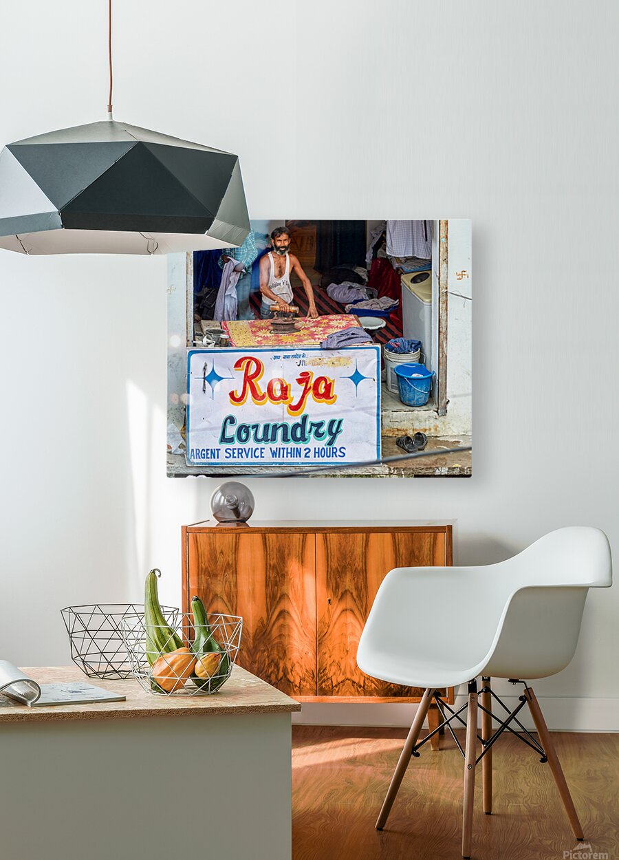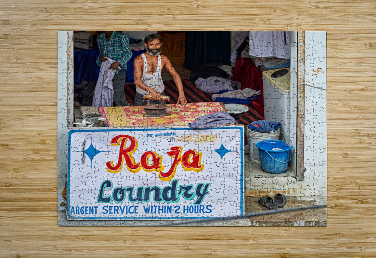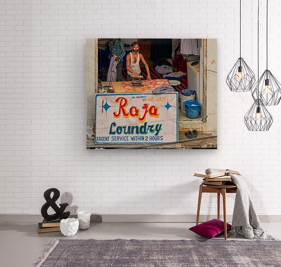 A man is ironing clothes at Raja Laundry in Bundi Rajasthan. The laundry is busy with clothes around him.
