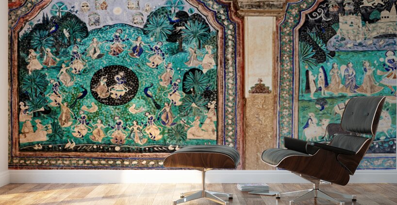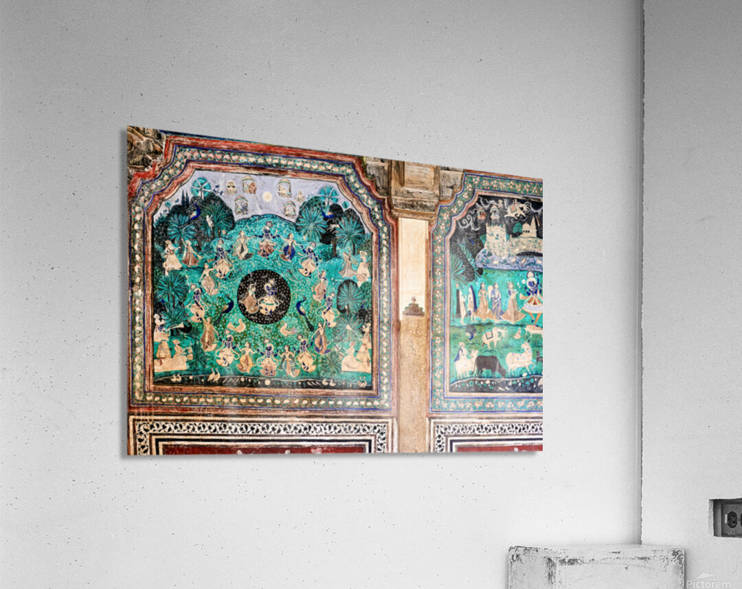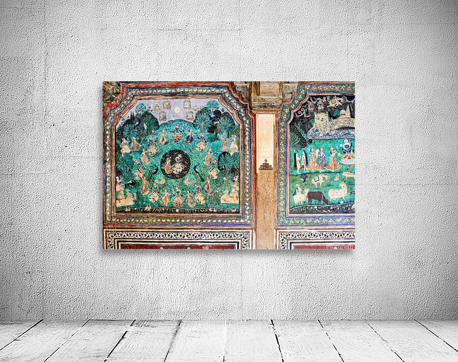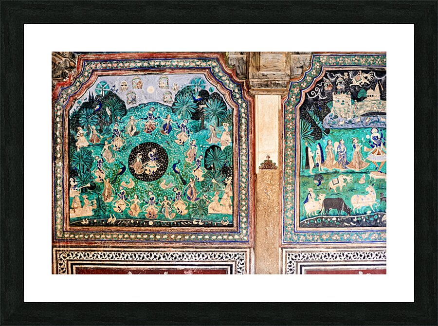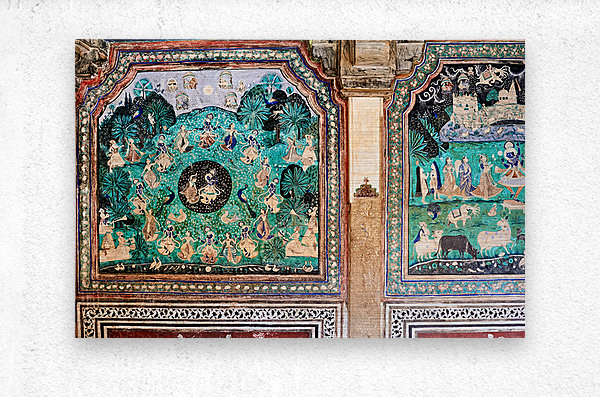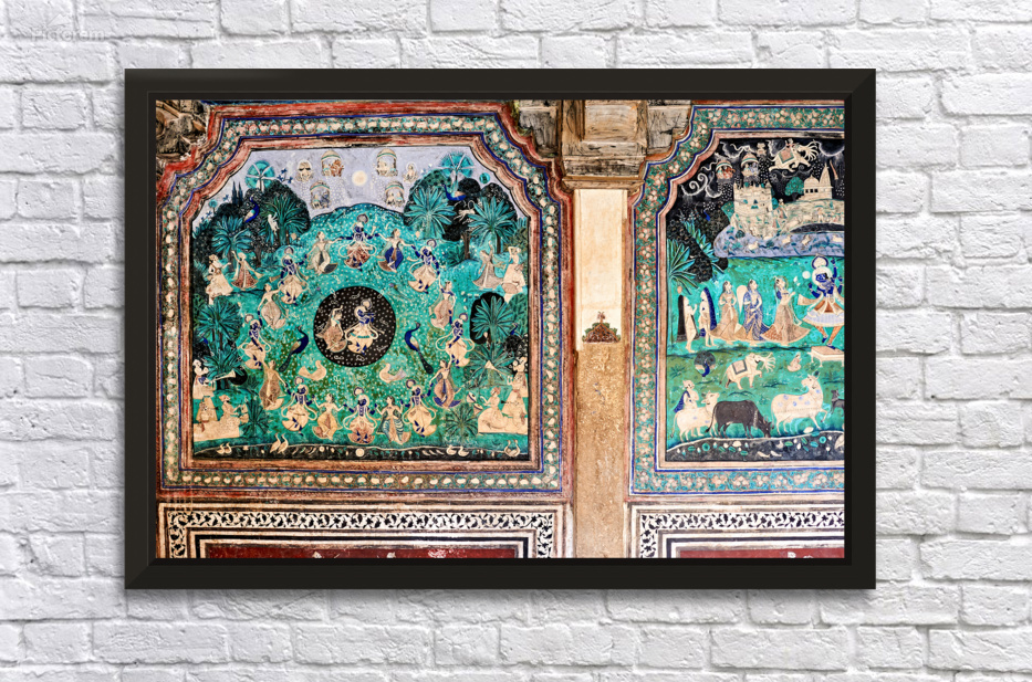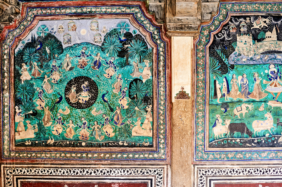 Colorful paintings and decorations cover the walls of Taragarh Fort showing scenes from local culture and history in Bundi Rajasthan.