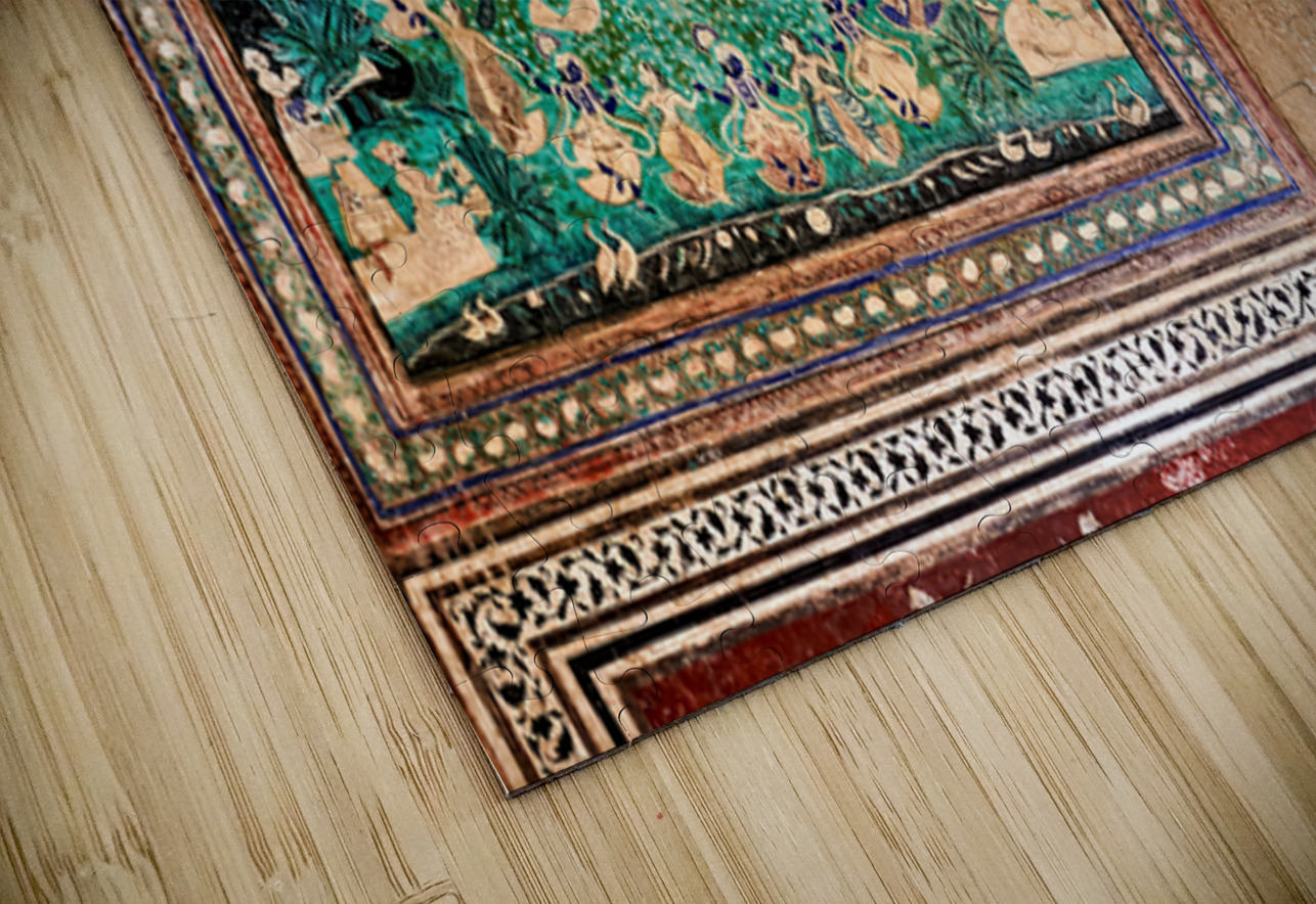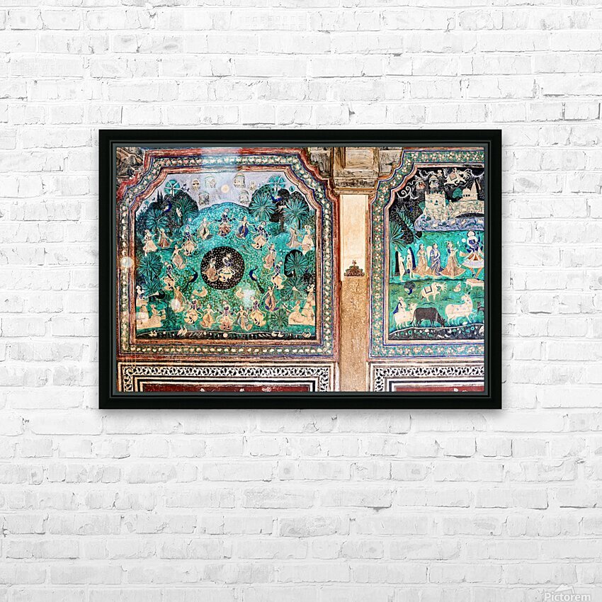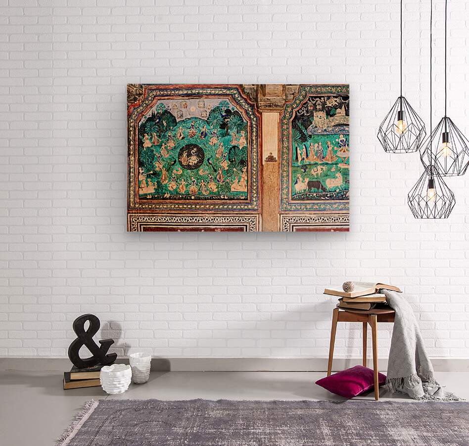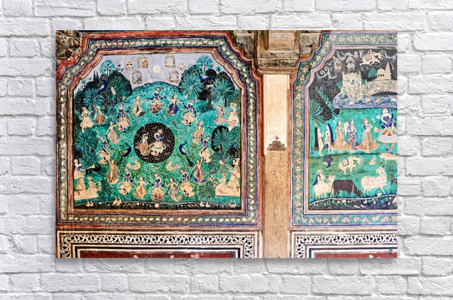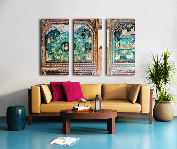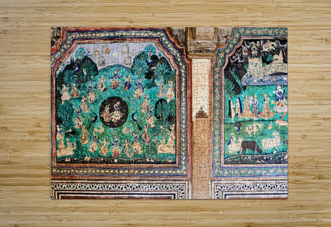 Colorful paintings and decorations cover the walls of Taragarh Fort showing scenes from local culture and history in Bundi Rajasthan.