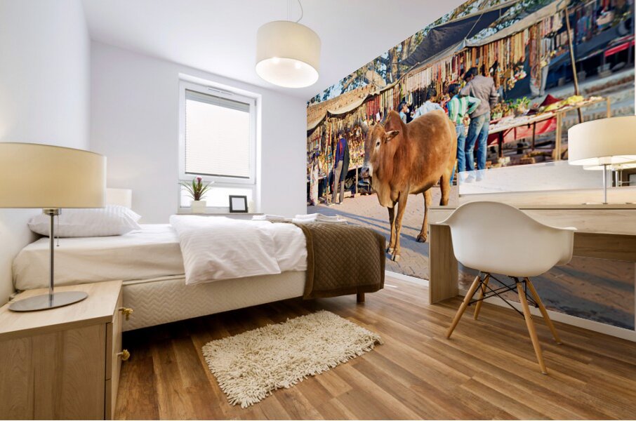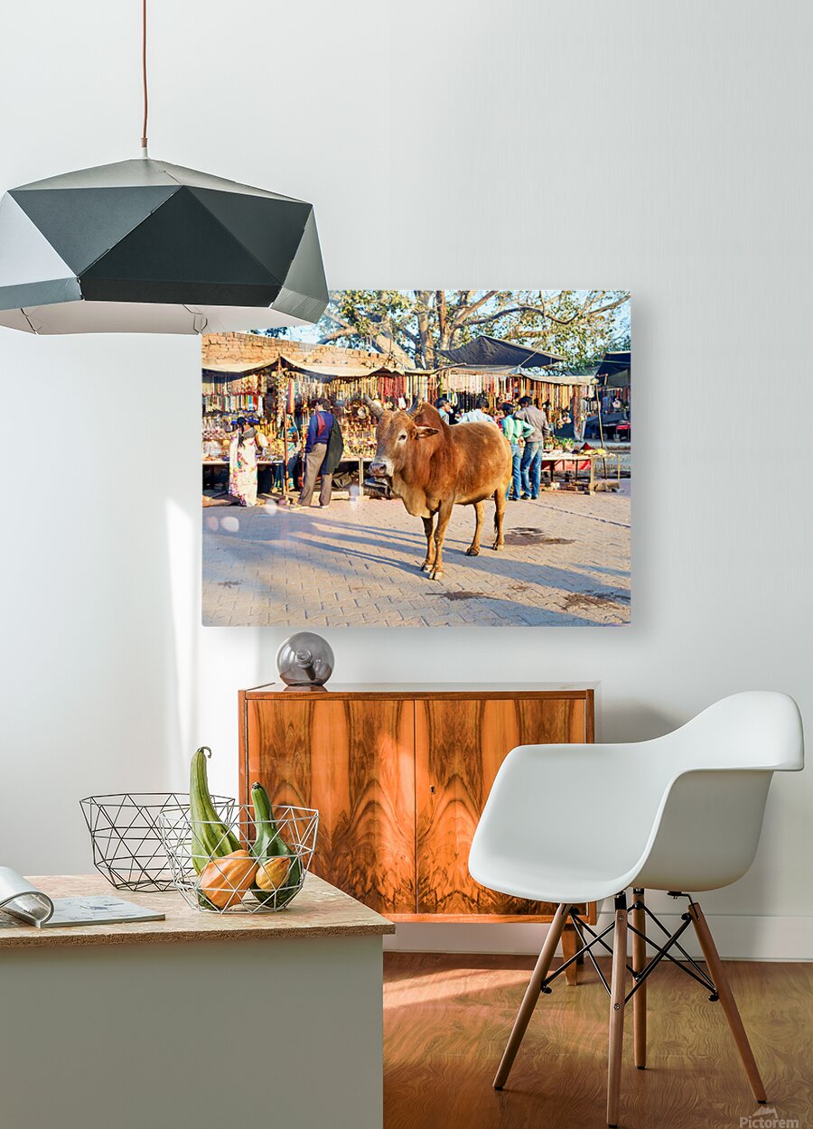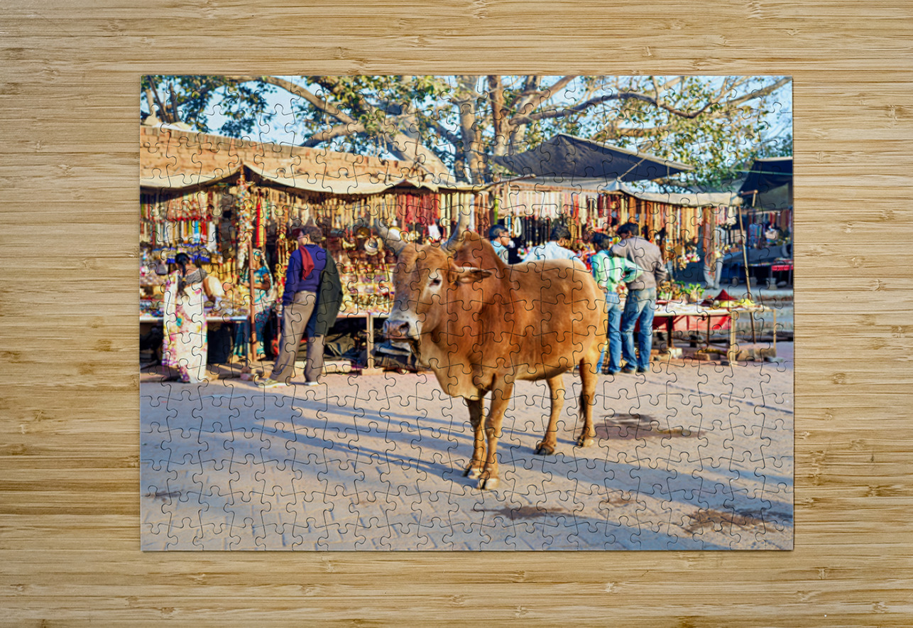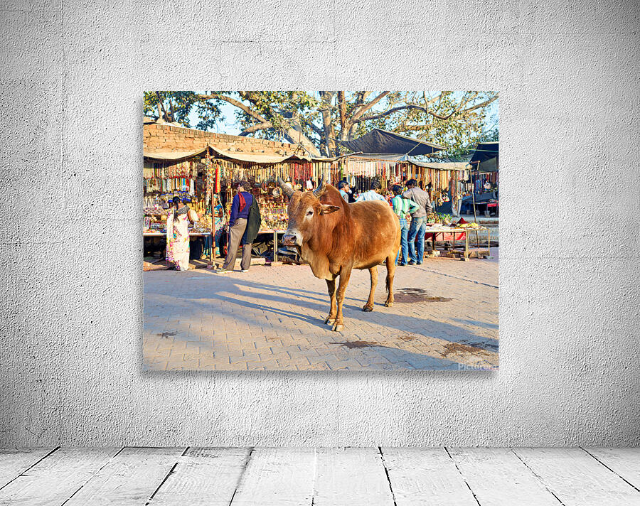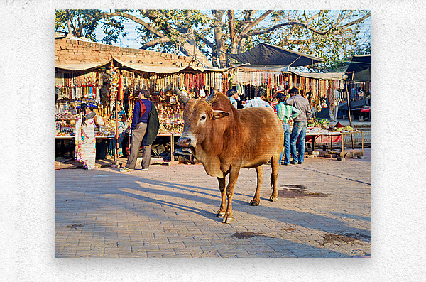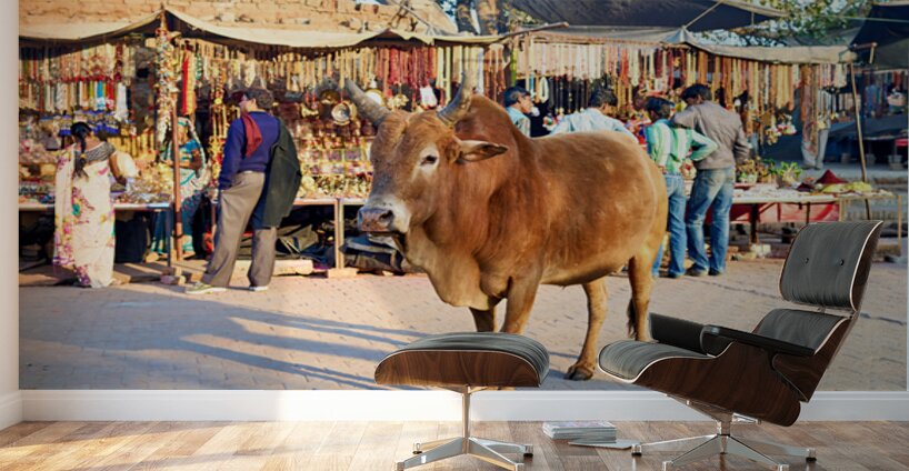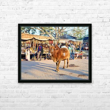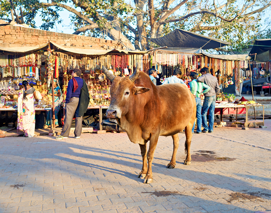 A cow stands in the middle of a market in Orchha. People shop for various items and browse the colorful stalls.