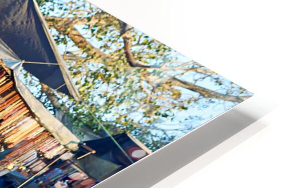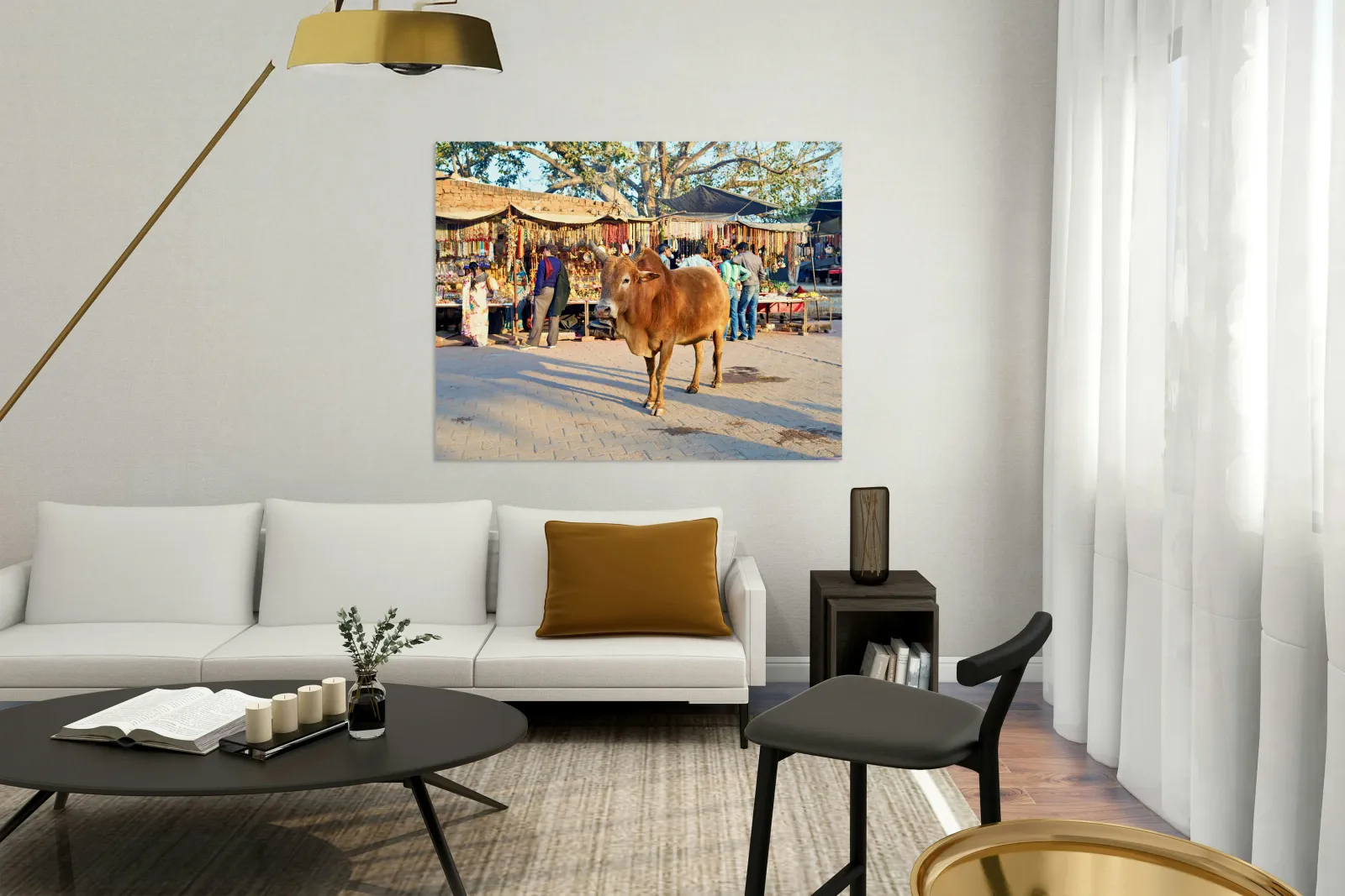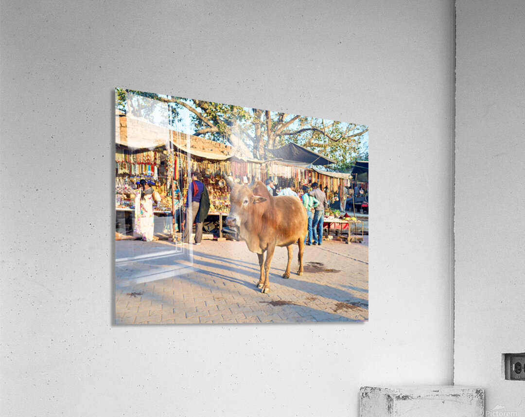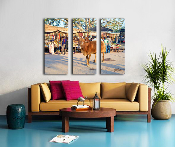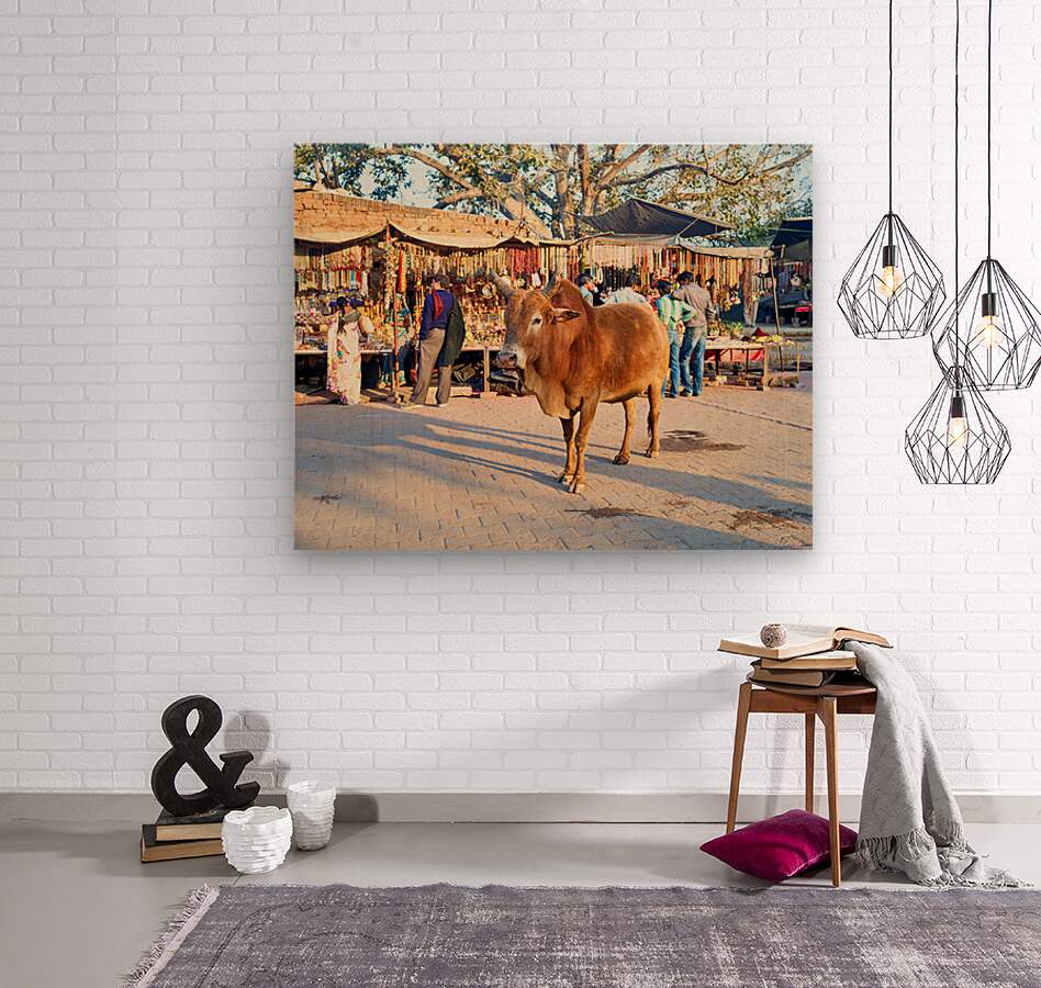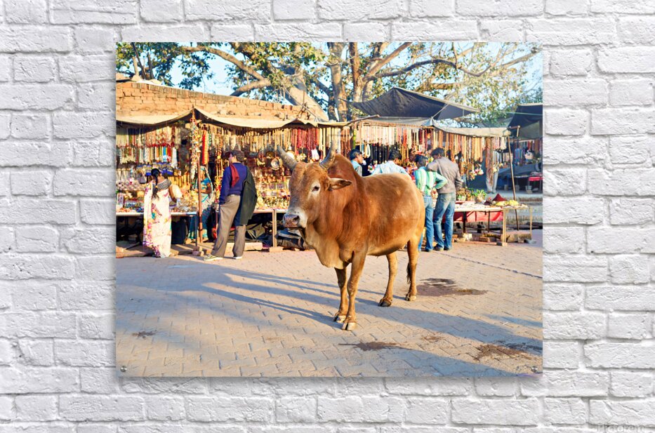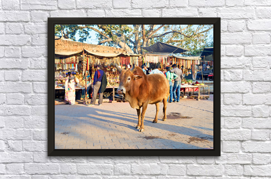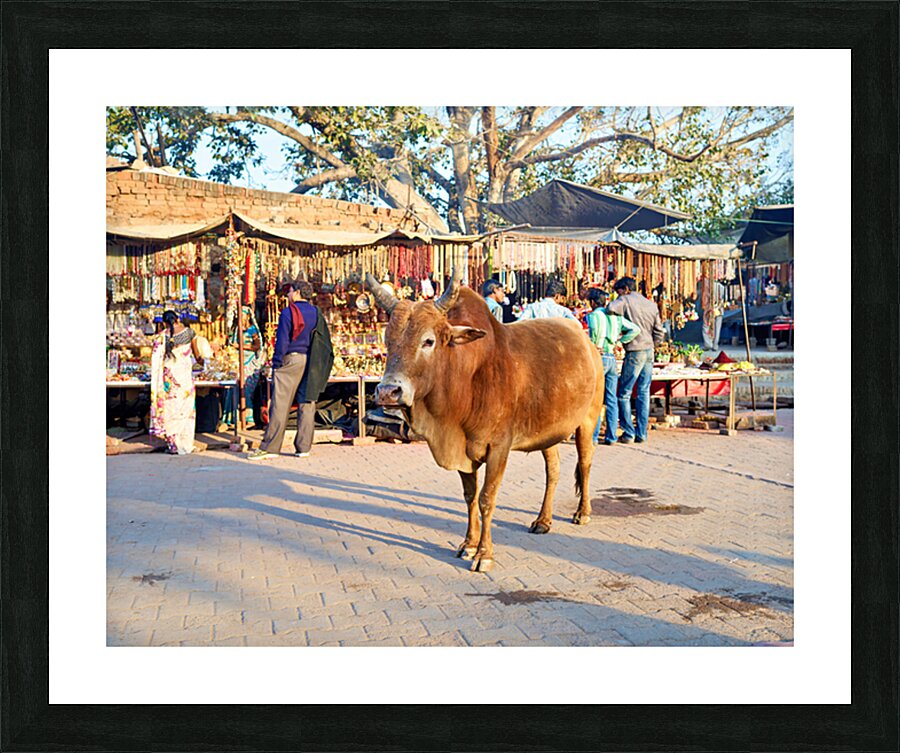 A cow stands in the middle of a market in Orchha. People shop for various items and browse the colorful stalls.