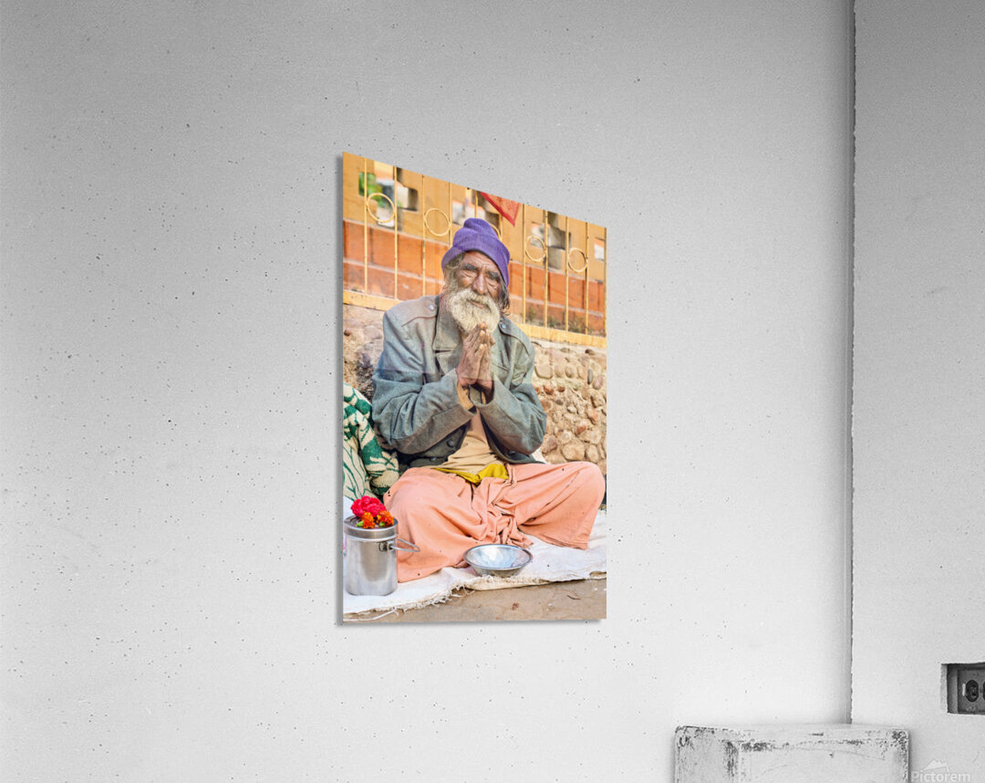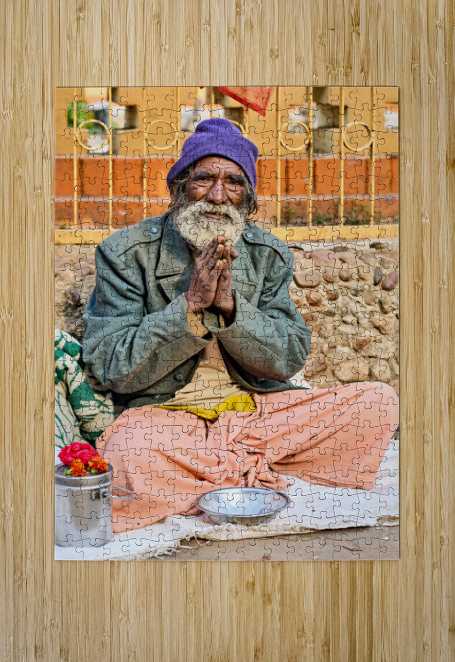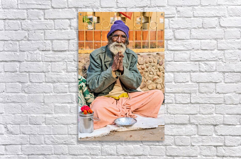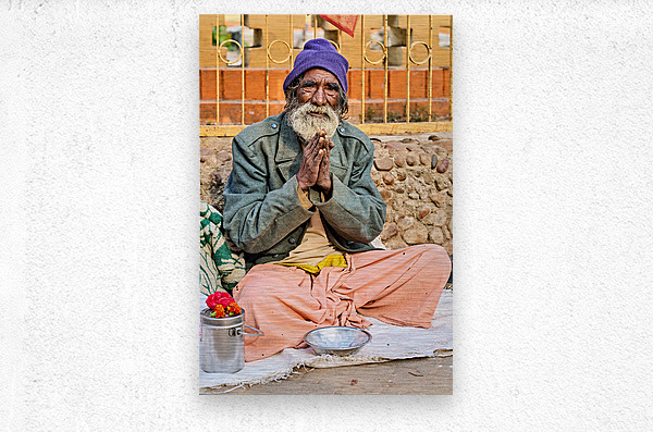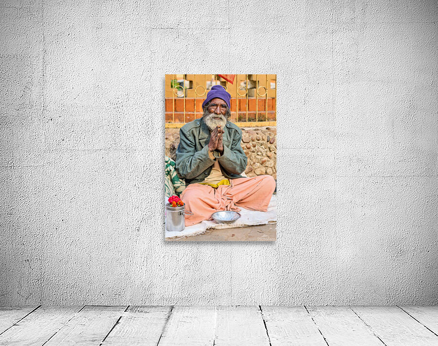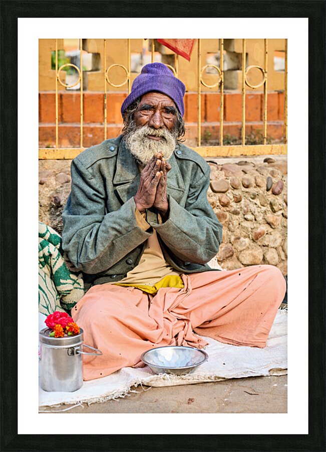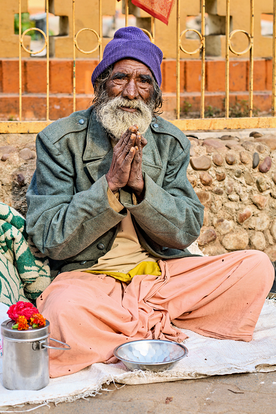 A man sits on the ground in Orchha Madhya Pradesh. He has a long beard and folded hands while surrounded by flowers and a bowl.