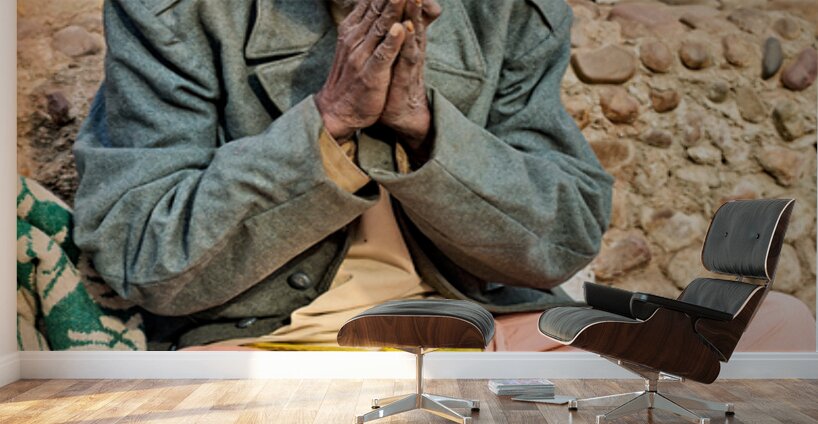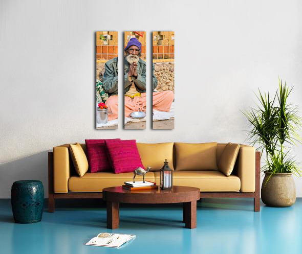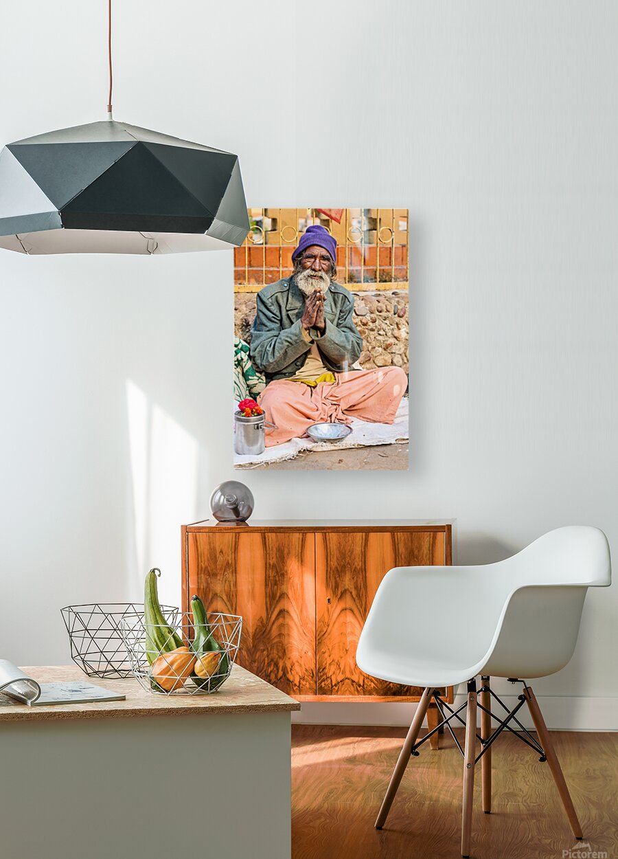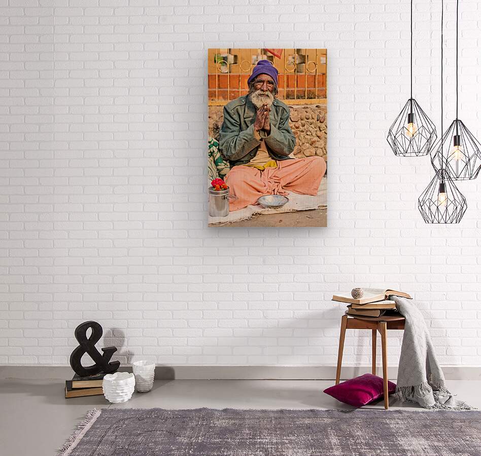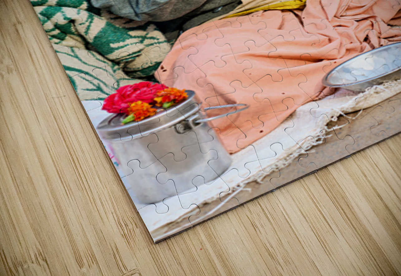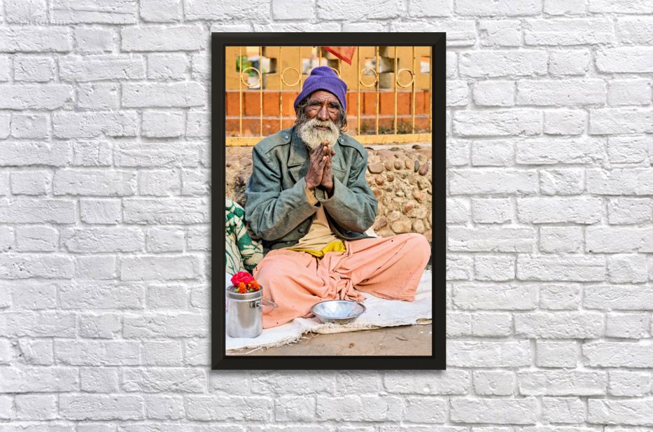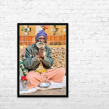 A man sits on the ground in Orchha Madhya Pradesh. He has a long beard and folded hands while surrounded by flowers and a bowl.