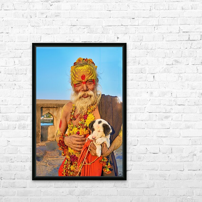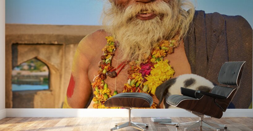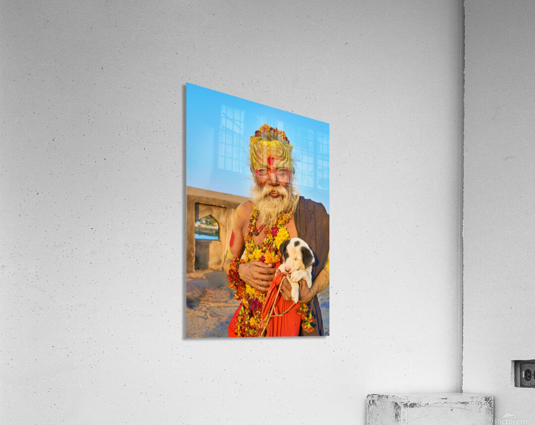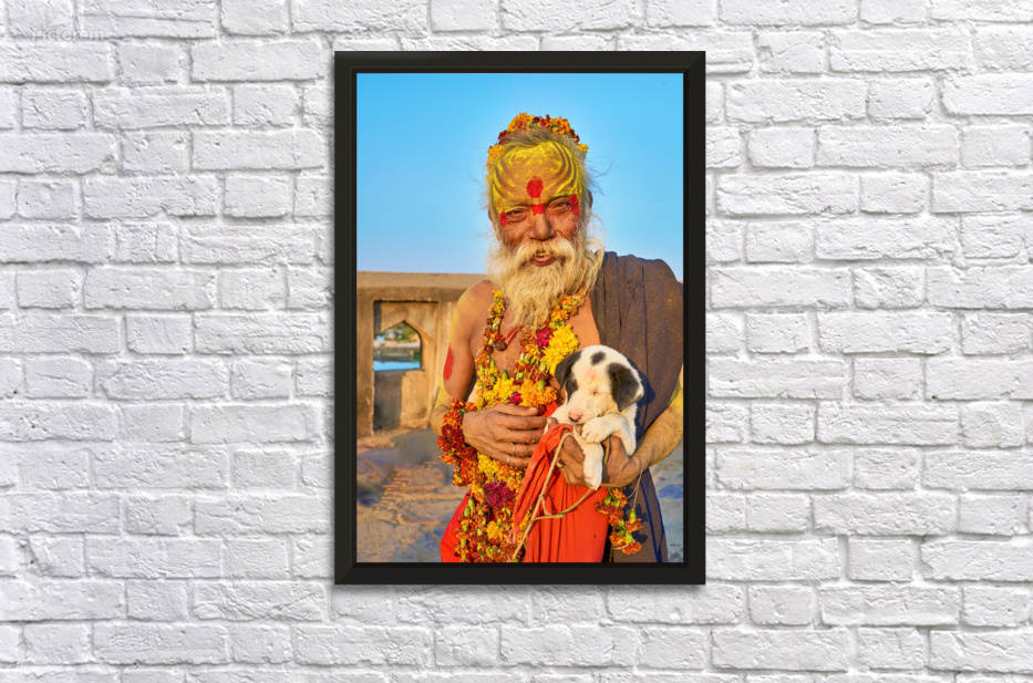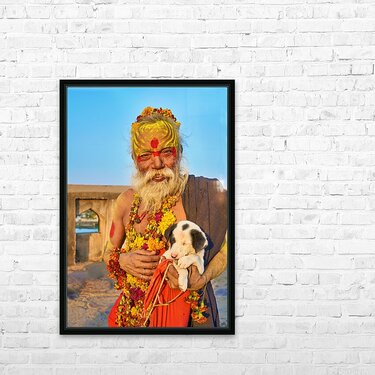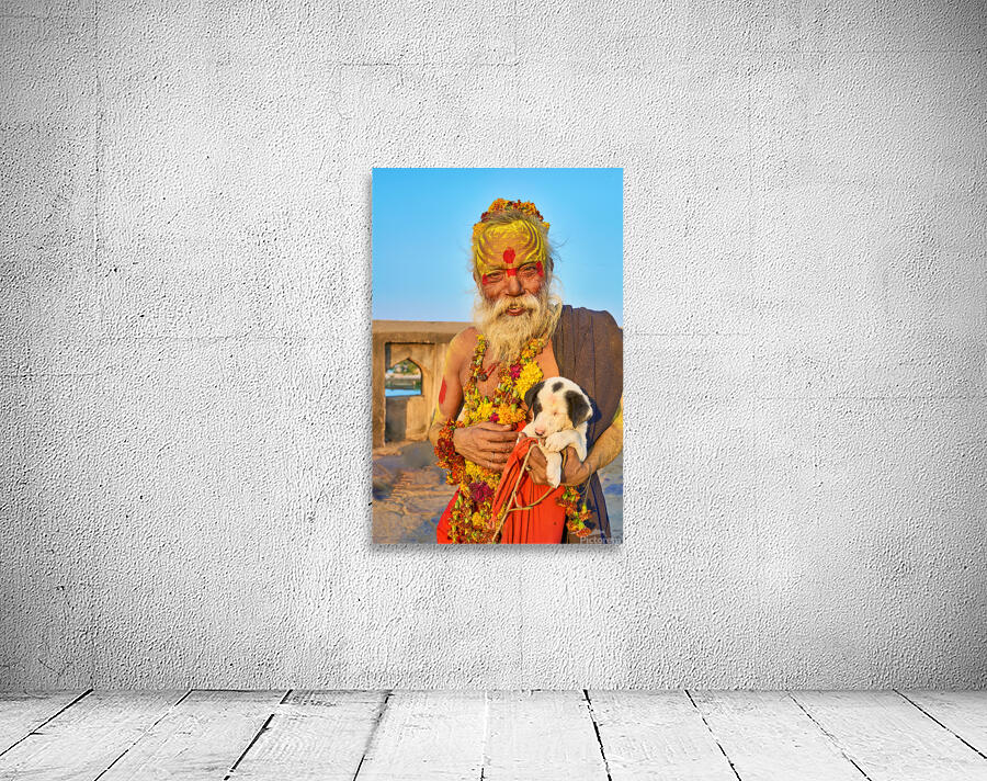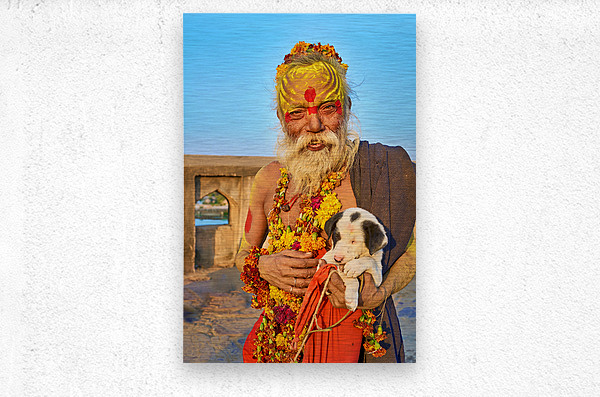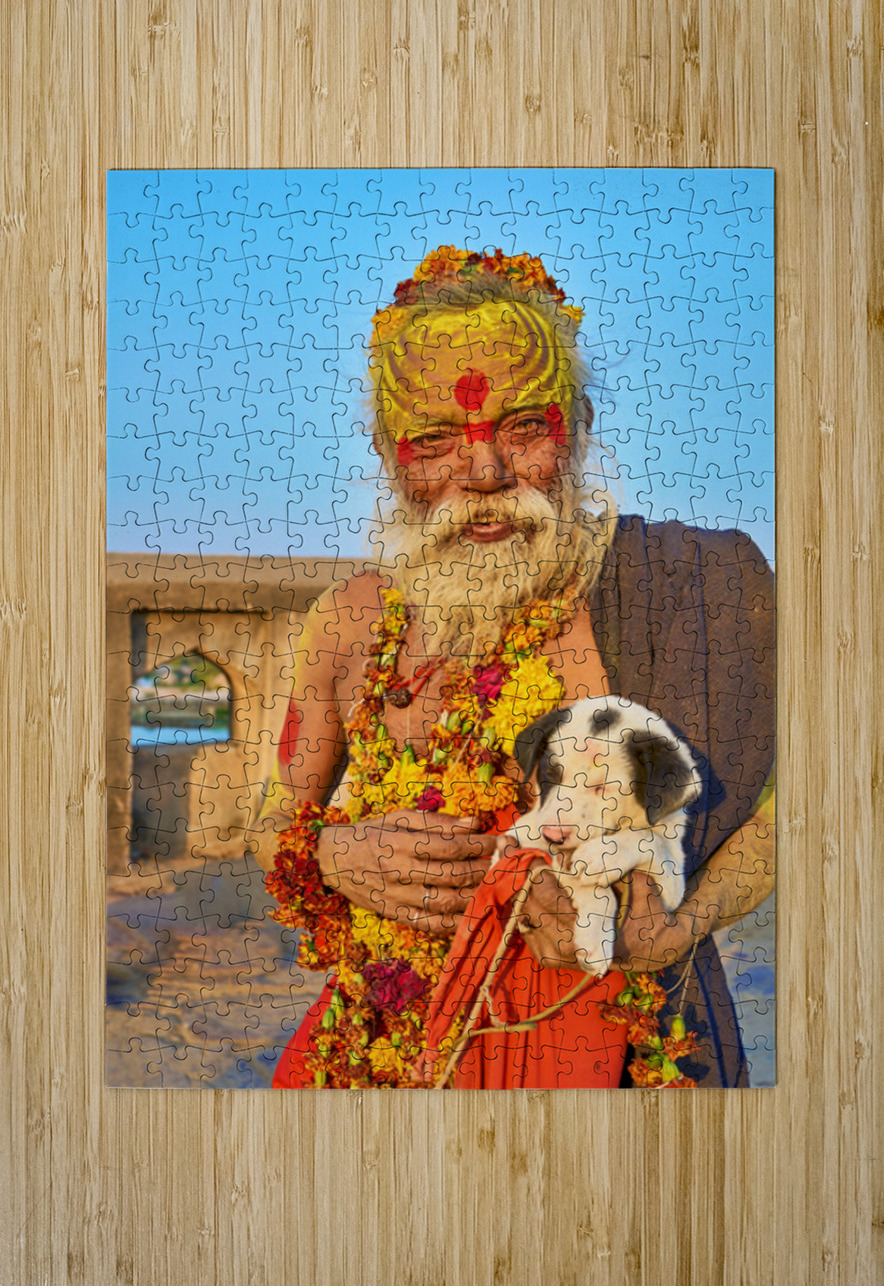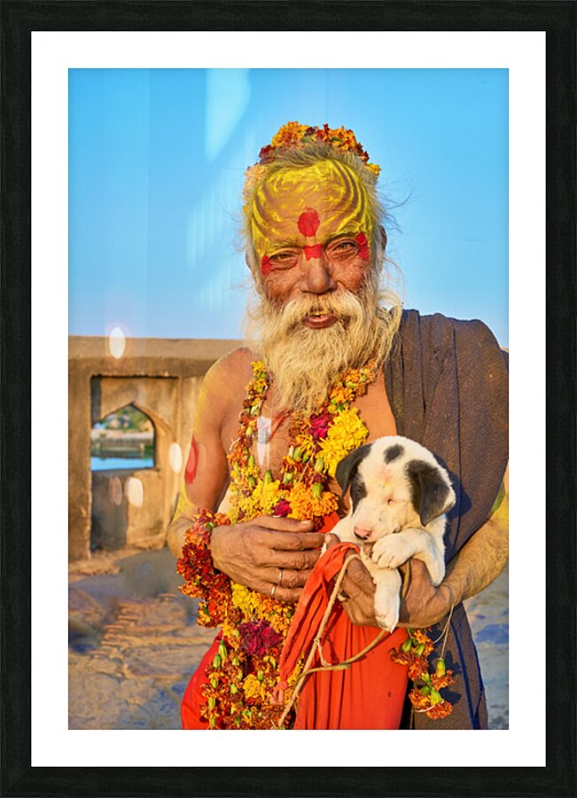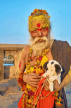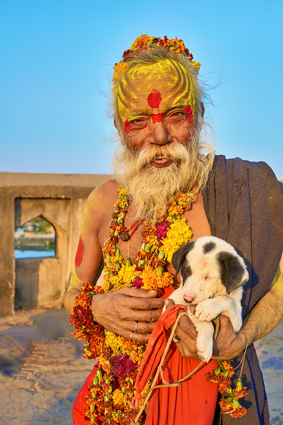 A sadhu holds a puppy while standing in Orchha Madhya Pradesh. The sun shines on them as they share a moment together.