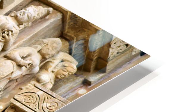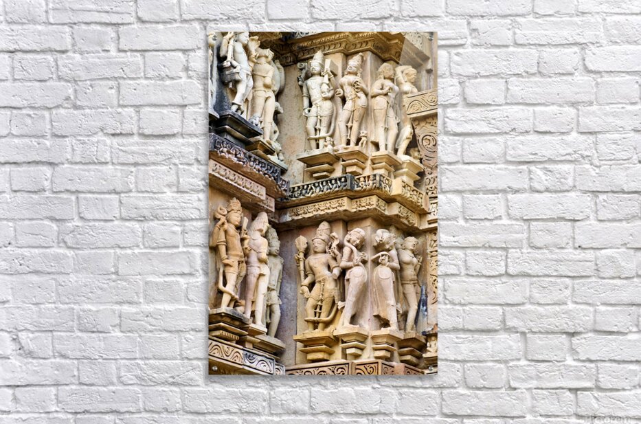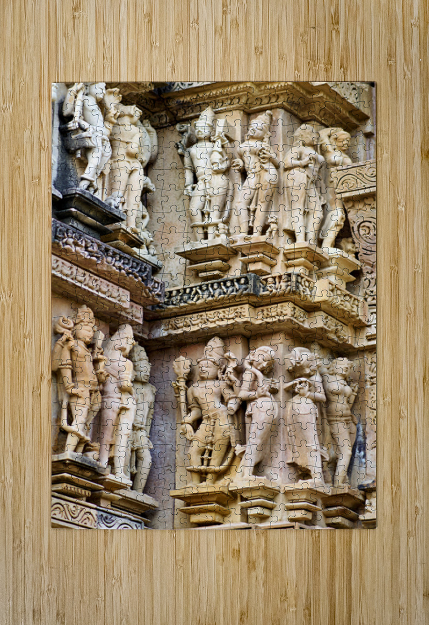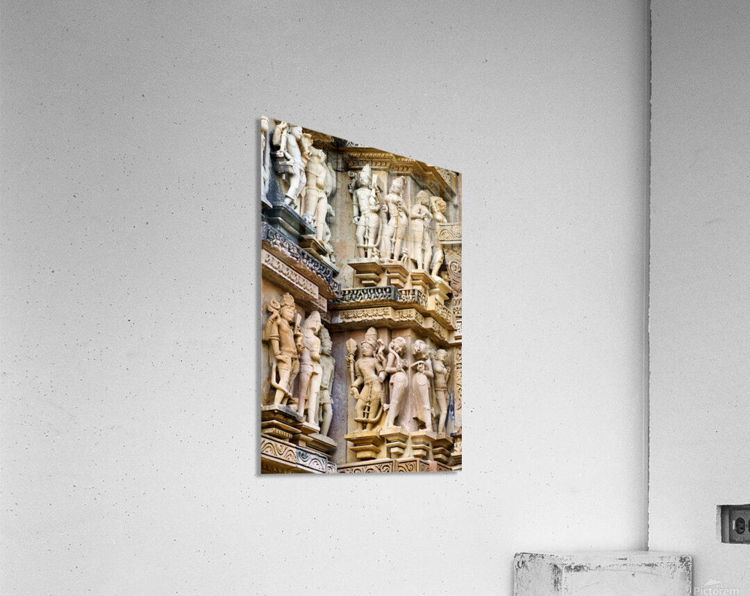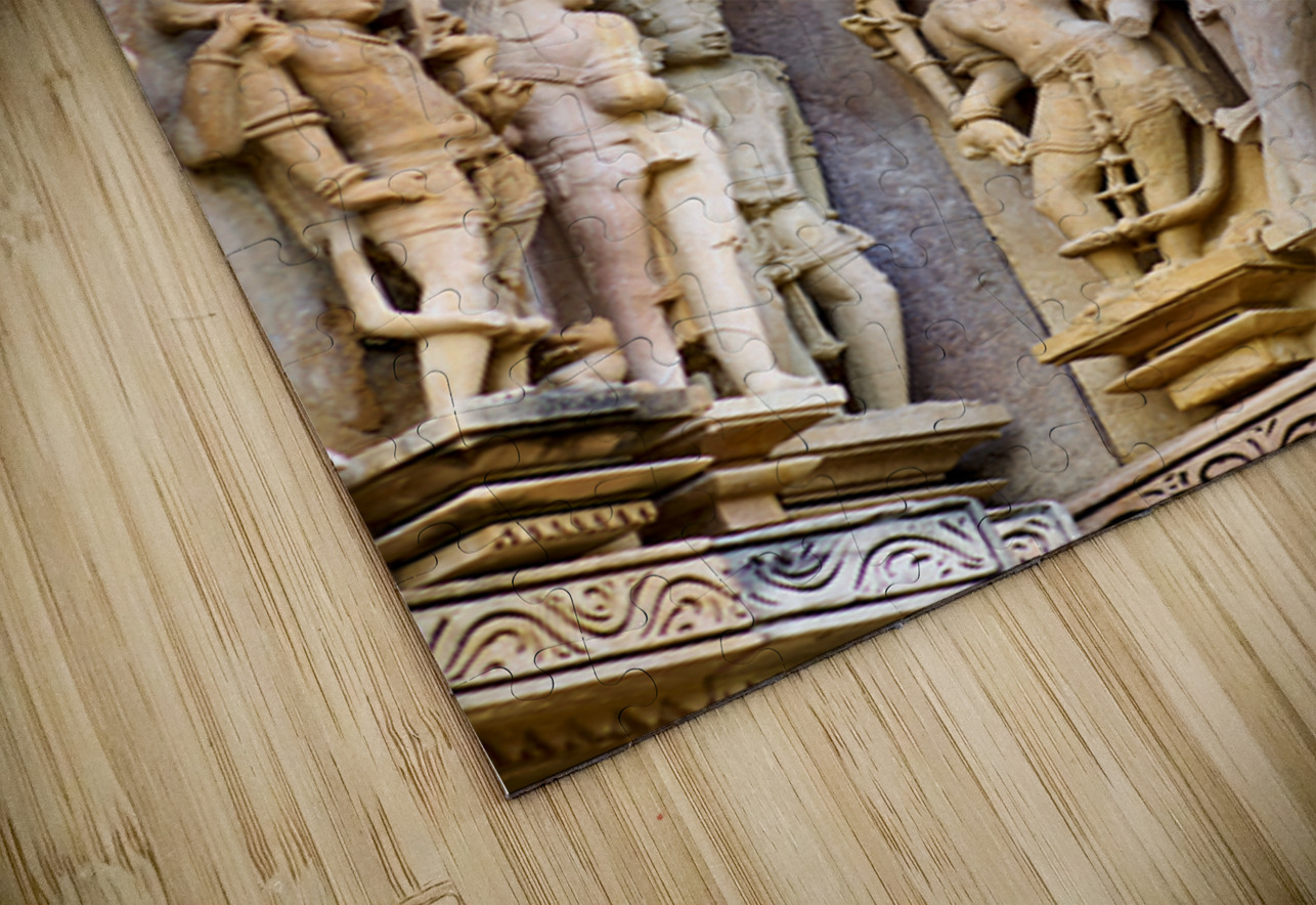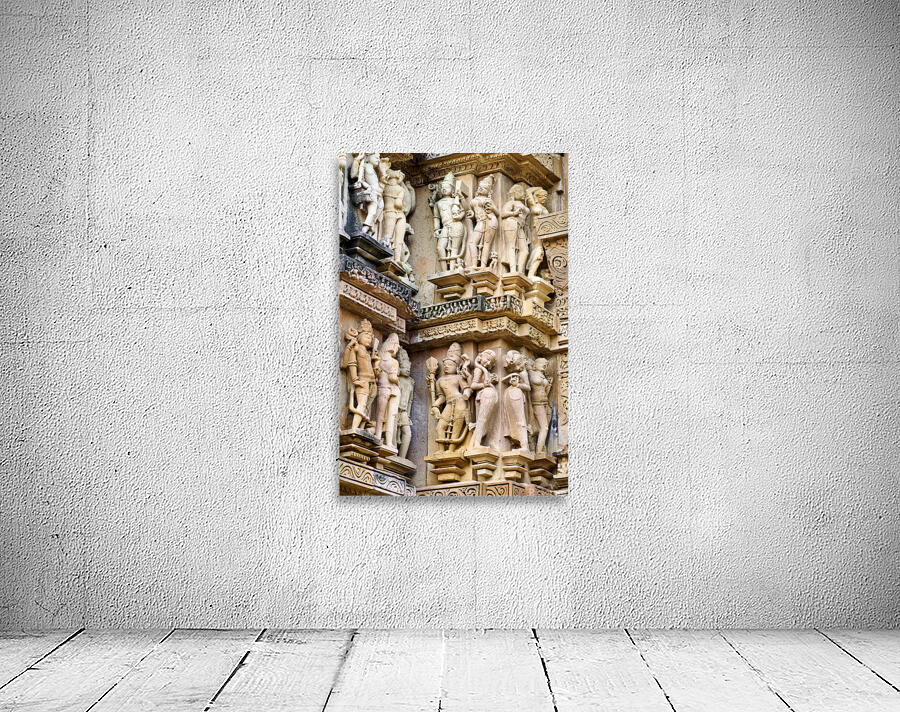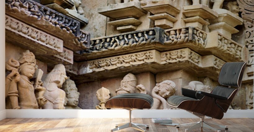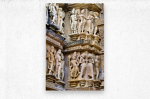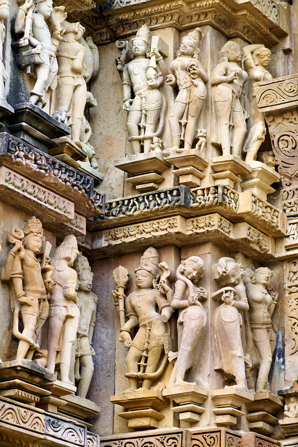 Visitors observe intricate stone carvings on Hindu temples in Khajuraho. The sculptures depict various scenes and figures from ancient times.