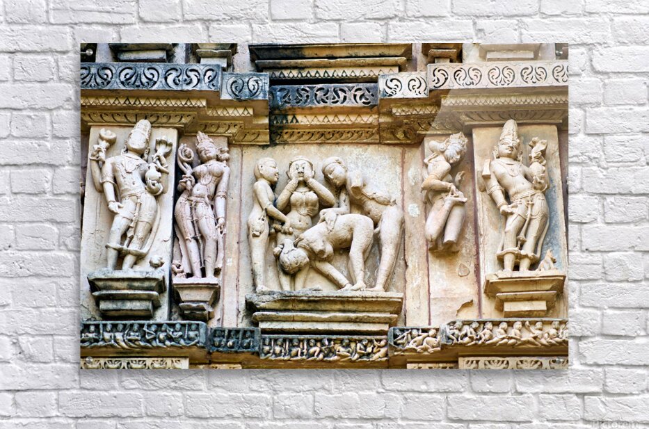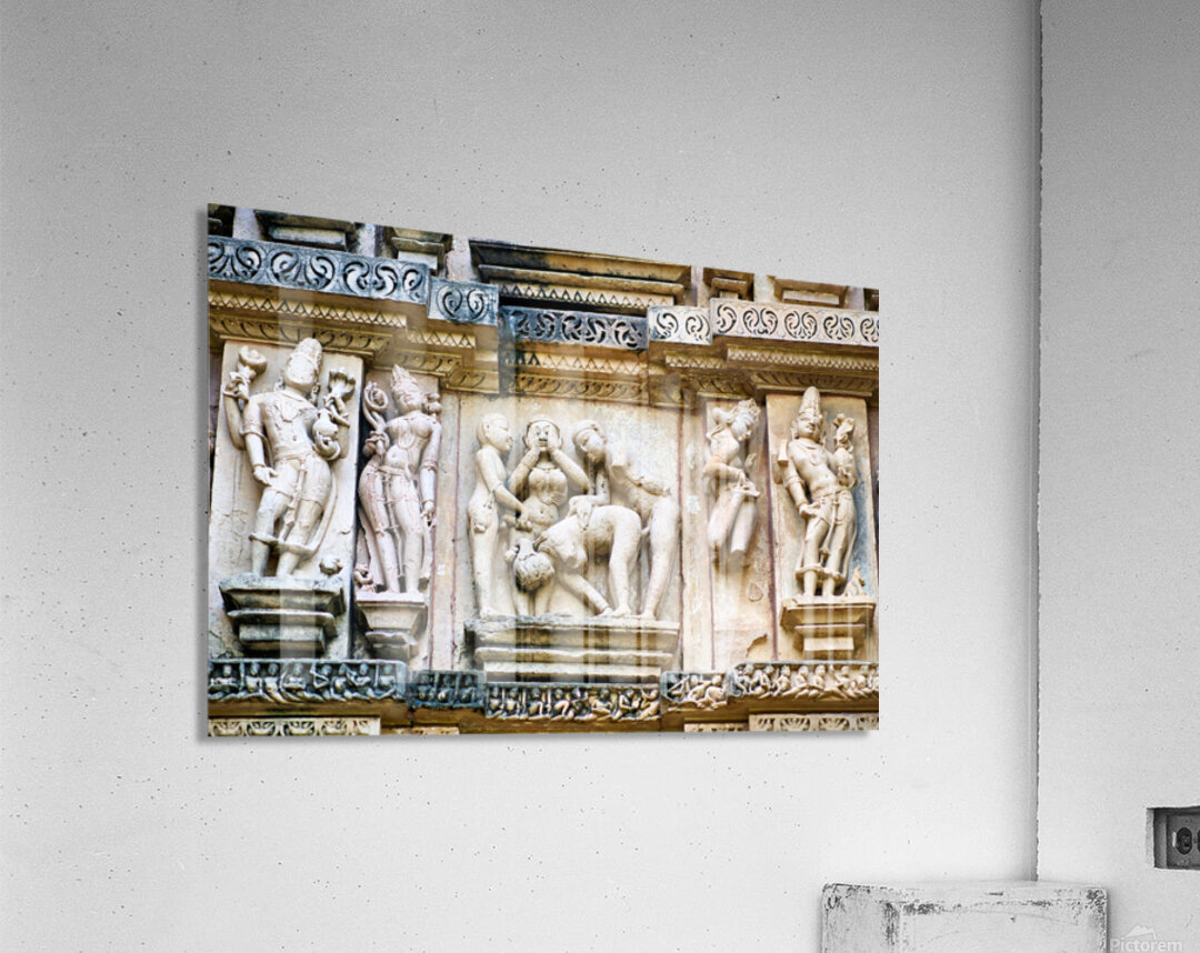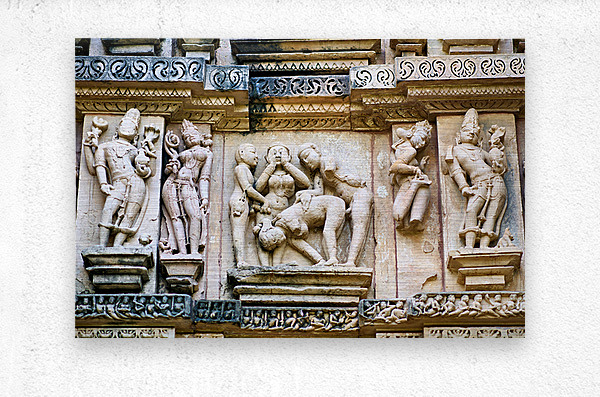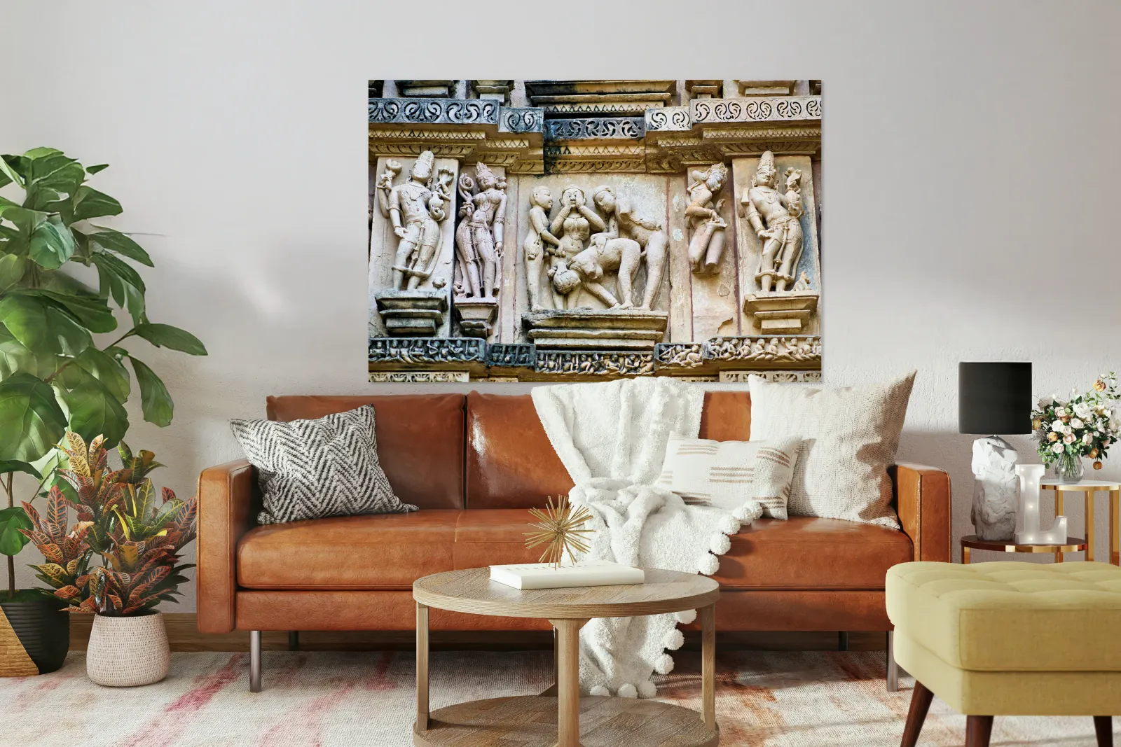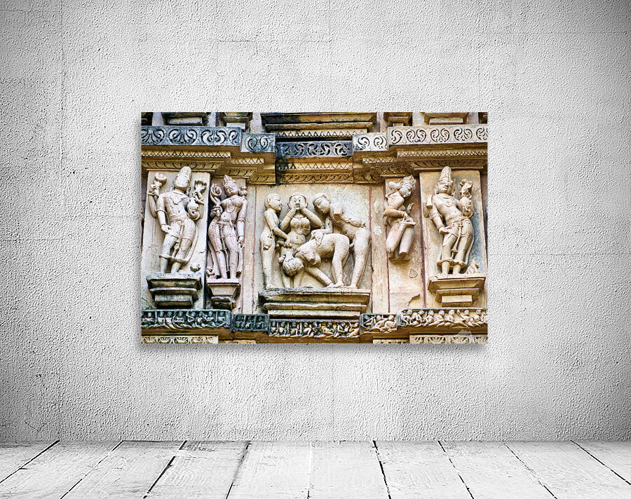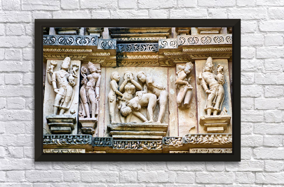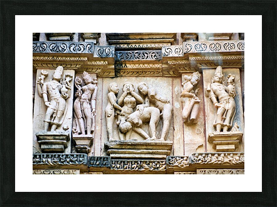 "Khajuraho temples showcase ancient sculptures in Madhya Pradesh" in a framed print.