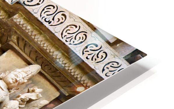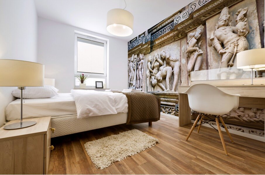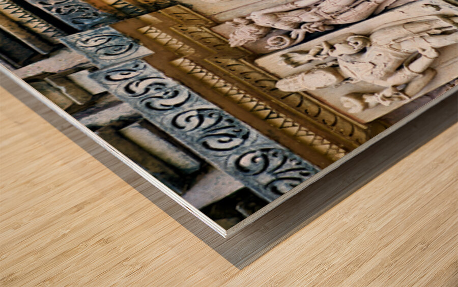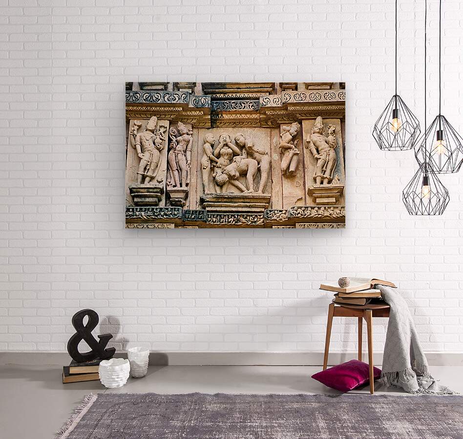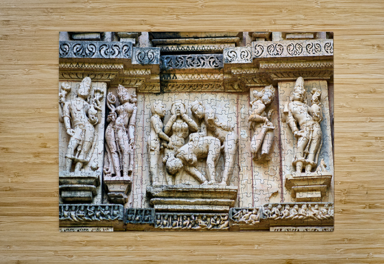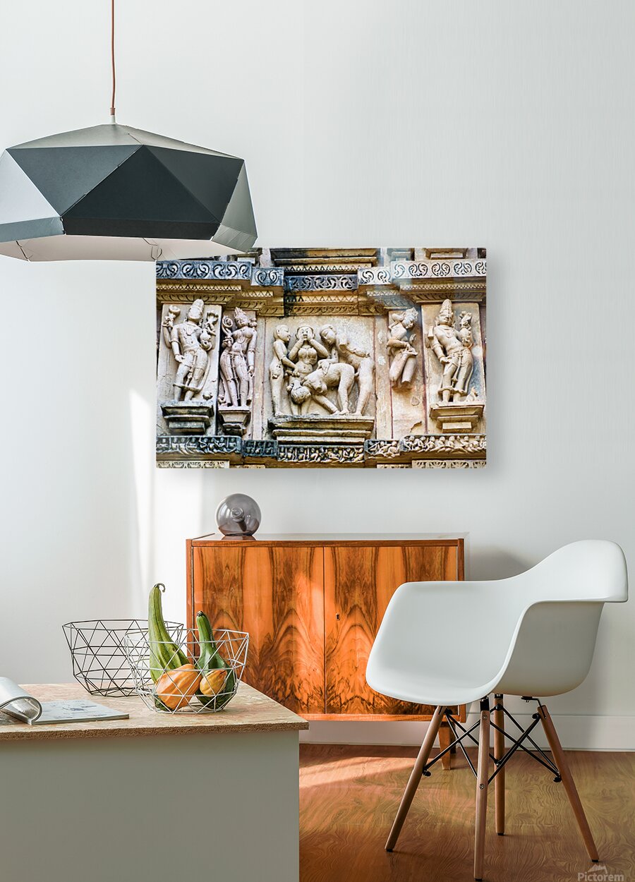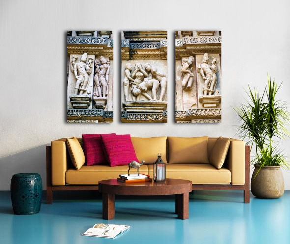 "Khajuraho temples showcase ancient sculptures in Madhya Pradesh" in a framed print.