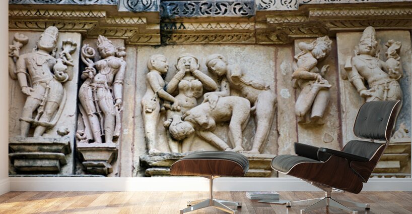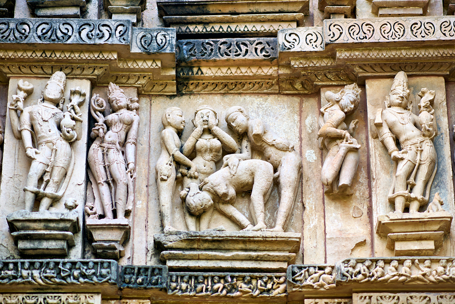 Visitors explore intricate carvings on the walls of Khajurahos temples in Madhya Pradesh showcasing themes of life and love during the day.