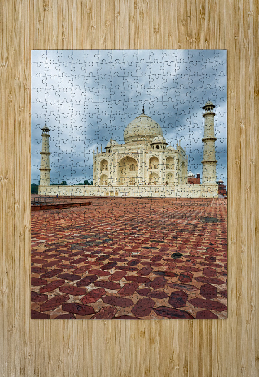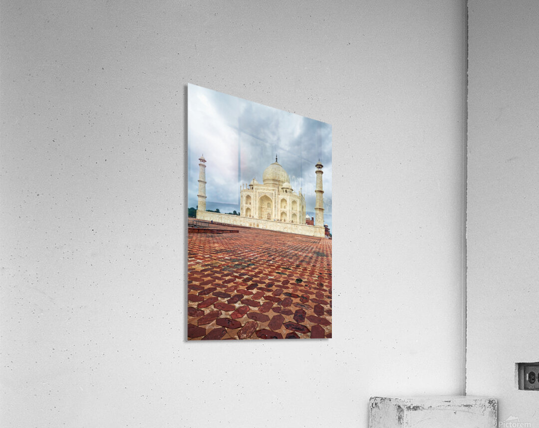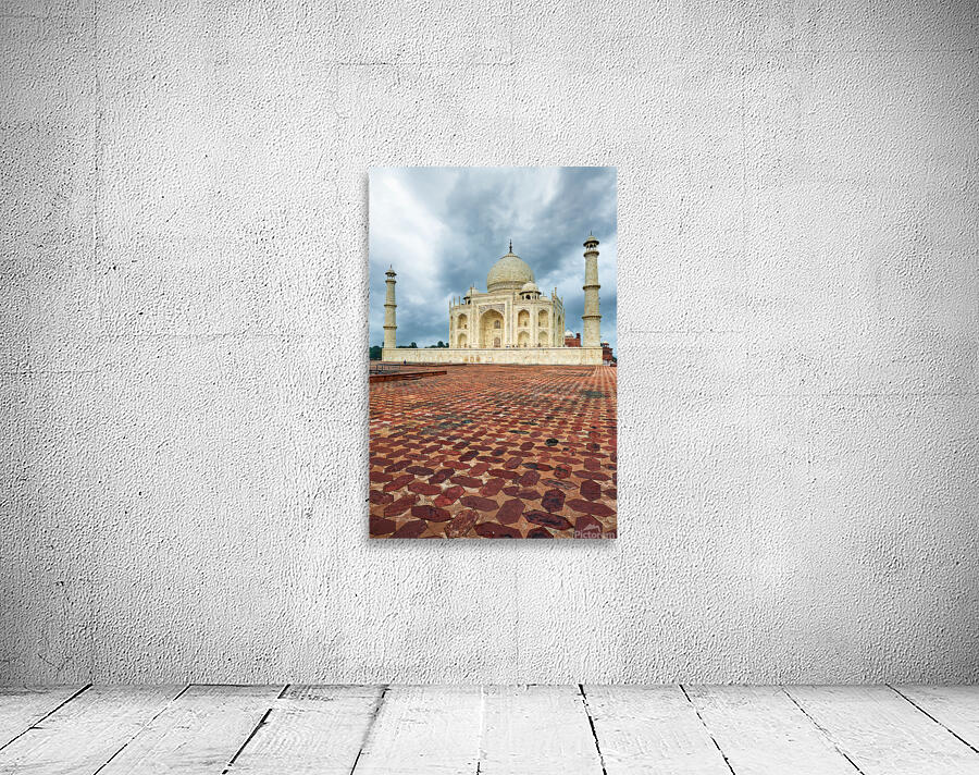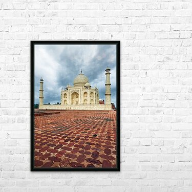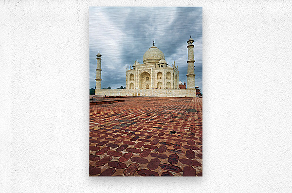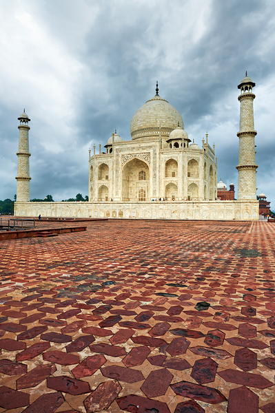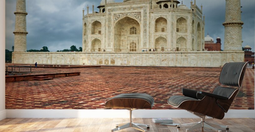 Tourists walk around the Taj Mahal Palace in Agra India under a cloudy sky. The scene shows the grand structure and its surroundings.