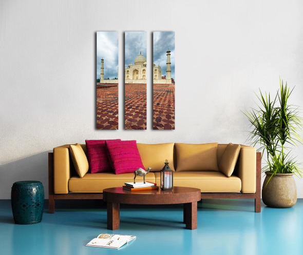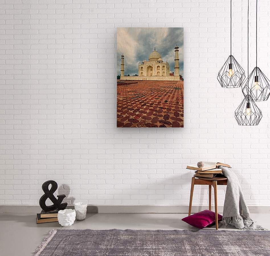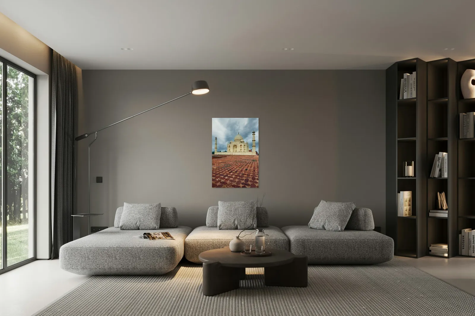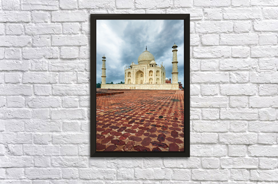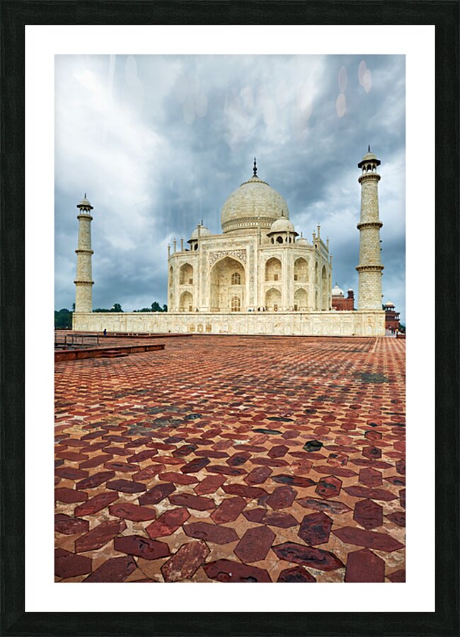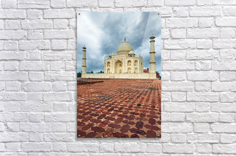 Tourists walk around the Taj Mahal Palace in Agra India under a cloudy sky. The scene shows the grand structure and its surroundings.
