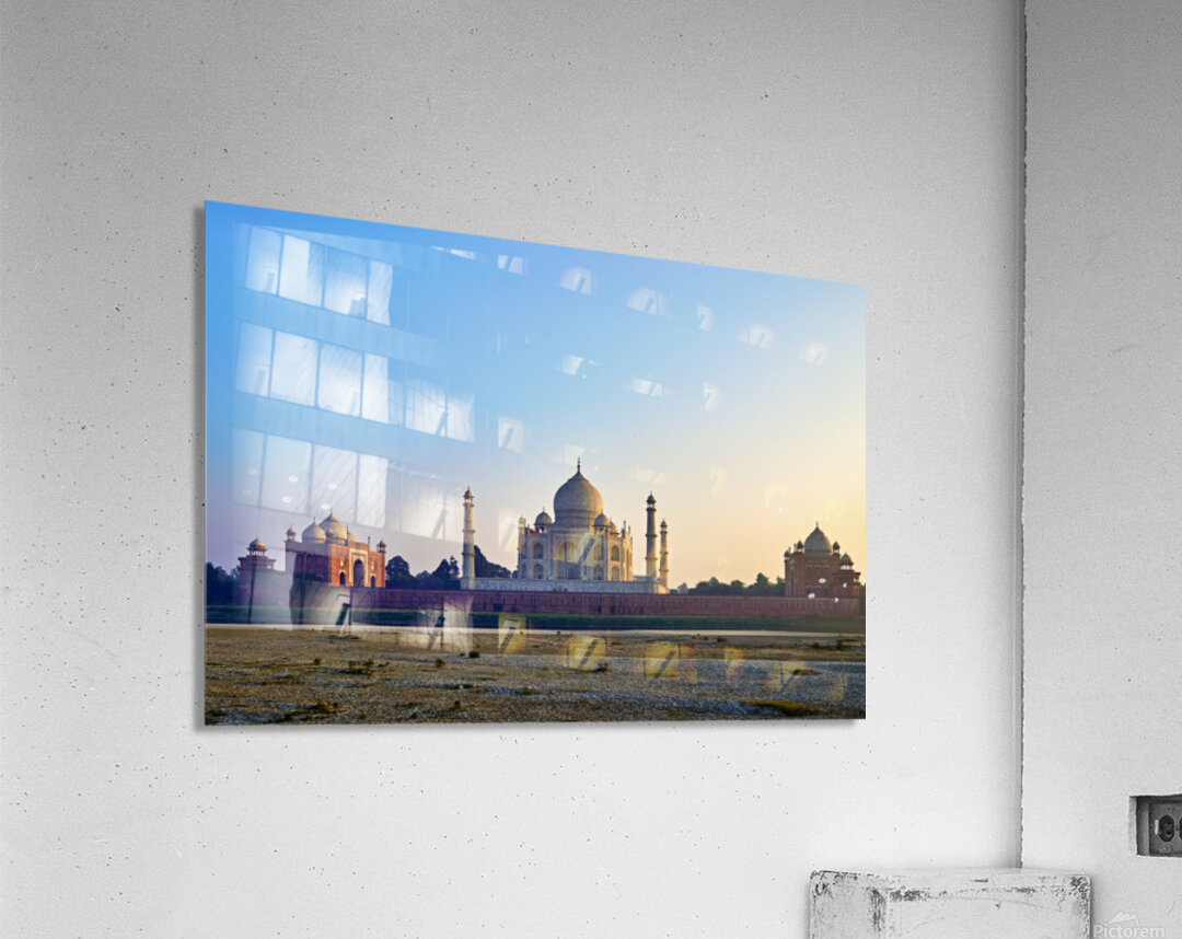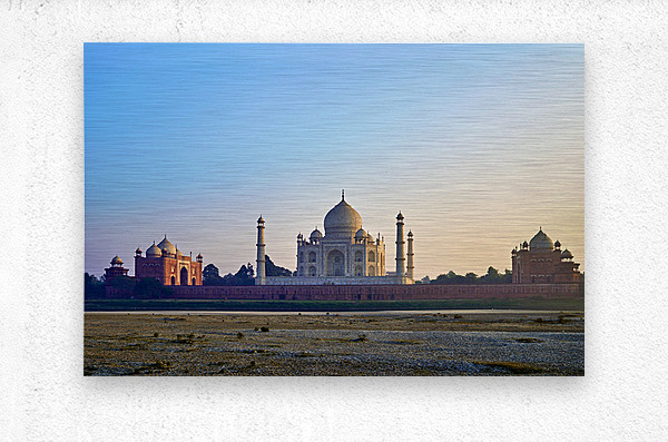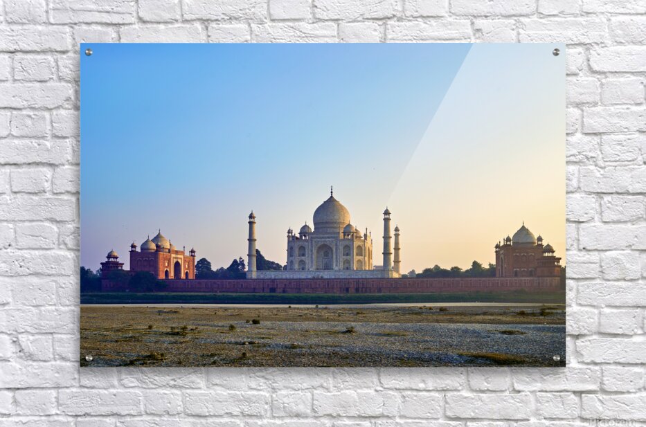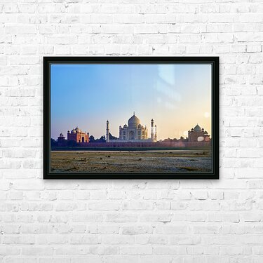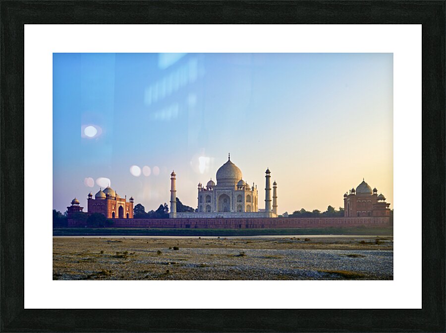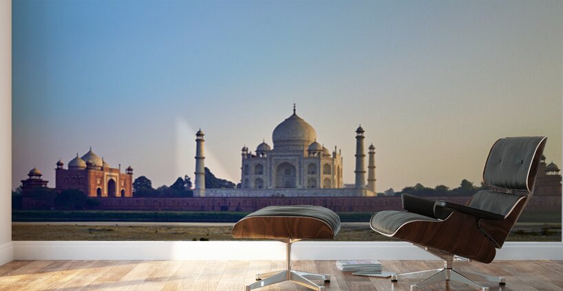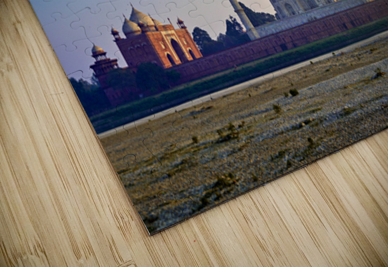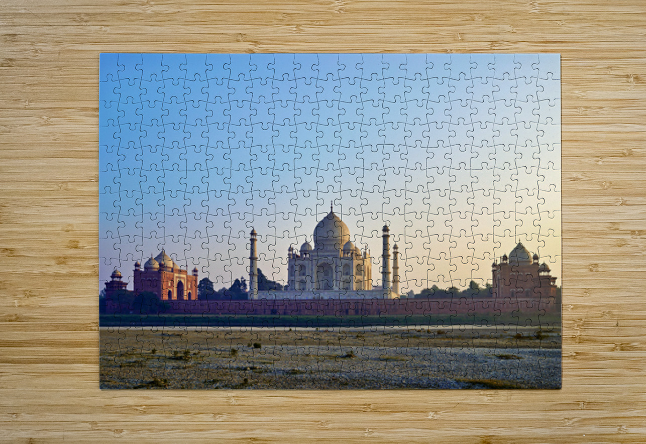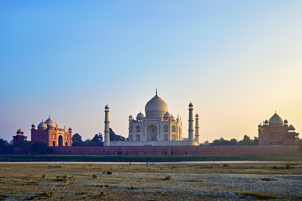 Visitors view the Taj Mahal Palace in Agra as the sun sets casting warm colors over the historic site and surrounding landscape.