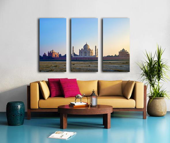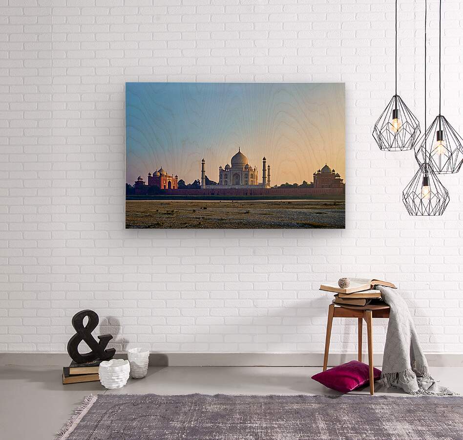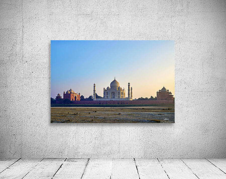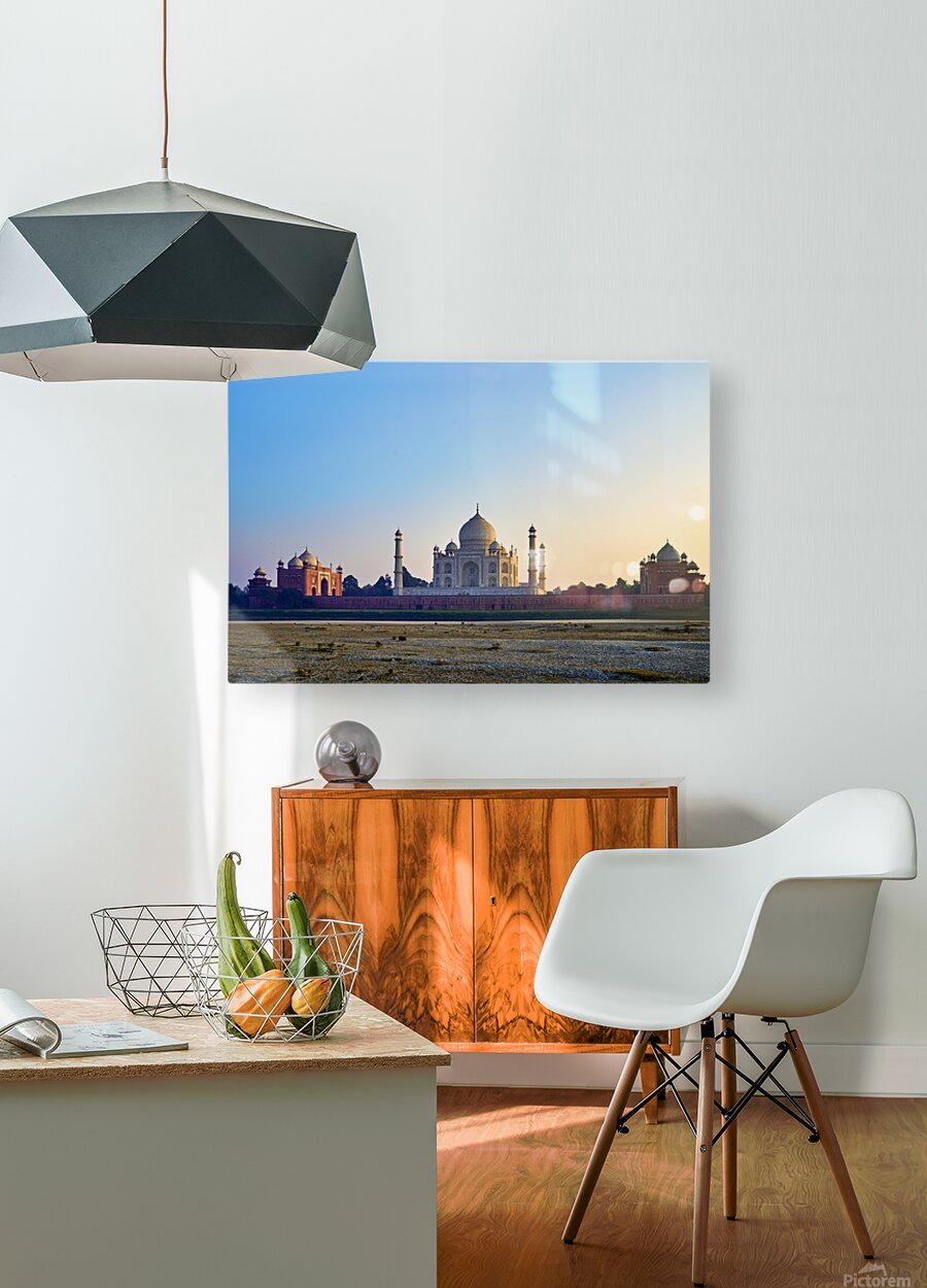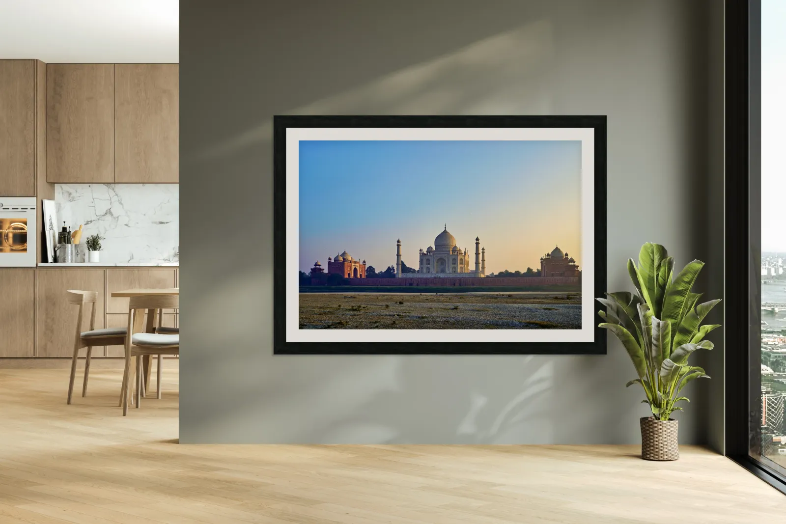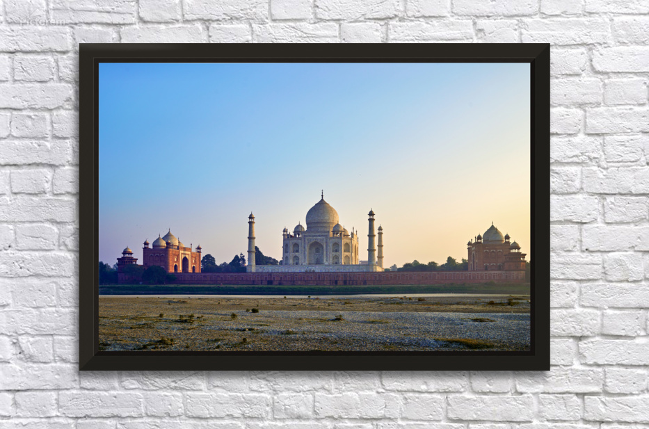 Visitors view the Taj Mahal Palace in Agra as the sun sets casting warm colors over the historic site and surrounding landscape.