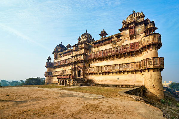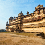 Visitors explore the historic fort complex in Orchha Madhya Pradesh with its unique structure and lasting legacy during a sunny day.