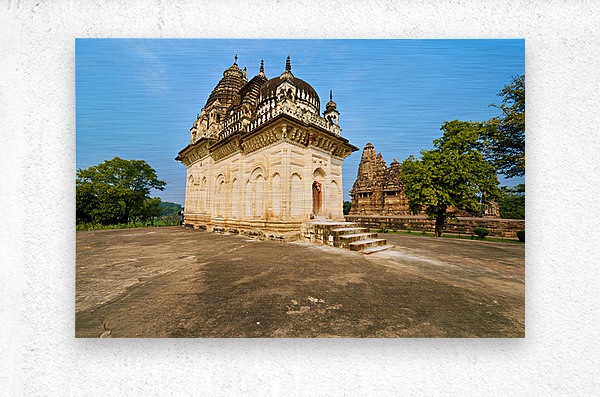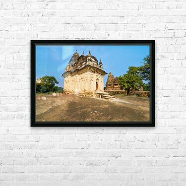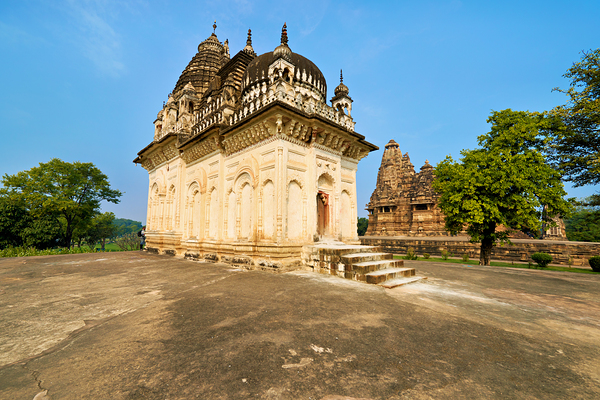 Hindu temples in Khajuraho Madhya Pradesh with detailed carvings and sculptures depicting various themes and stories.