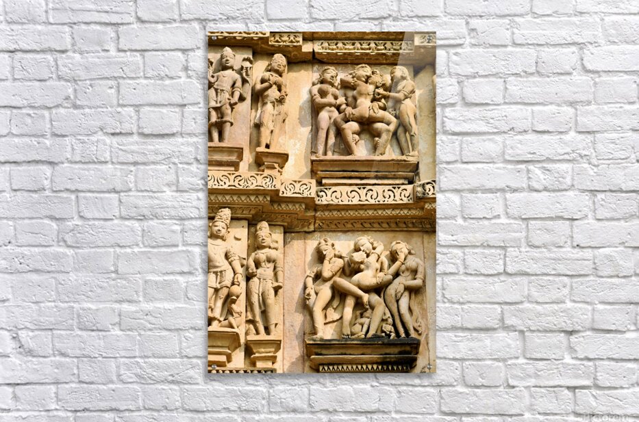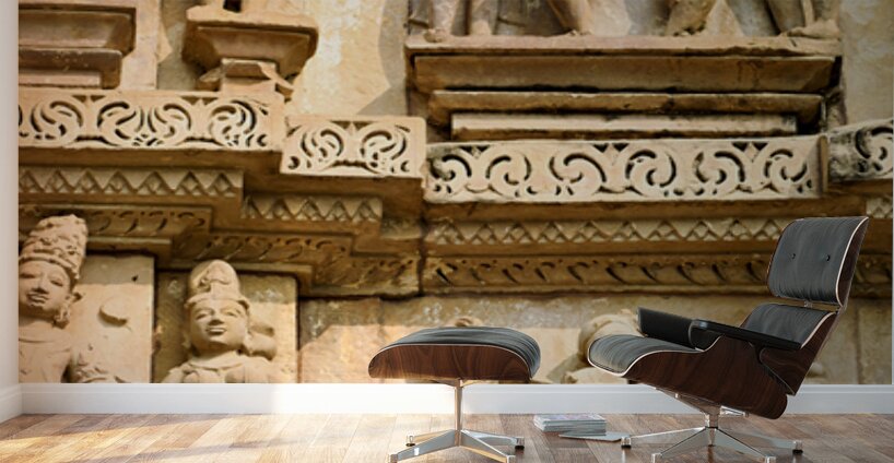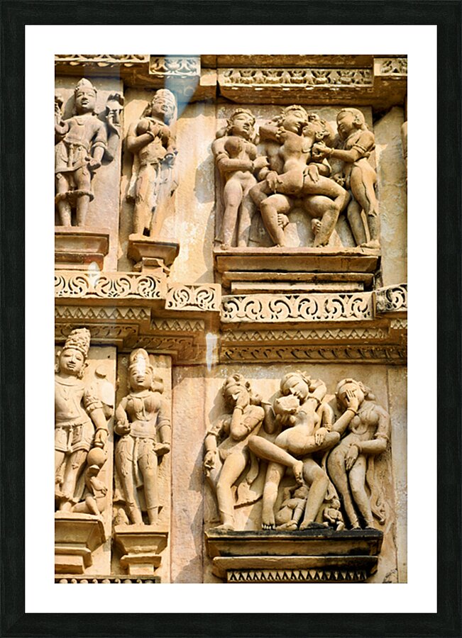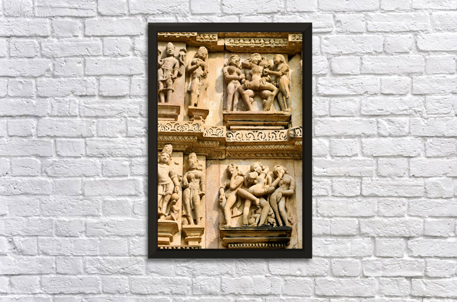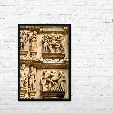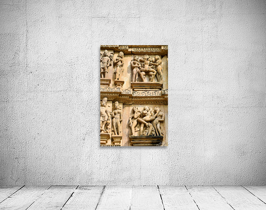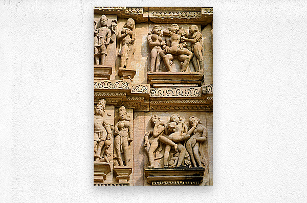 Carvings on the walls at Khajuraho illustrate human forms in various actions. These are sacred Hindu temples in Madhya Pradesh India.