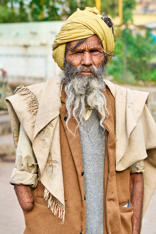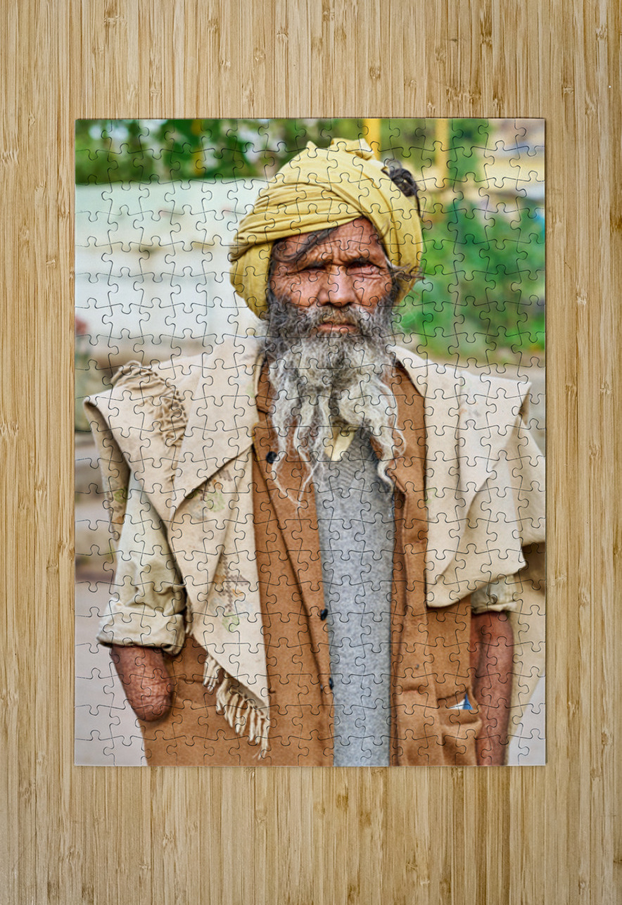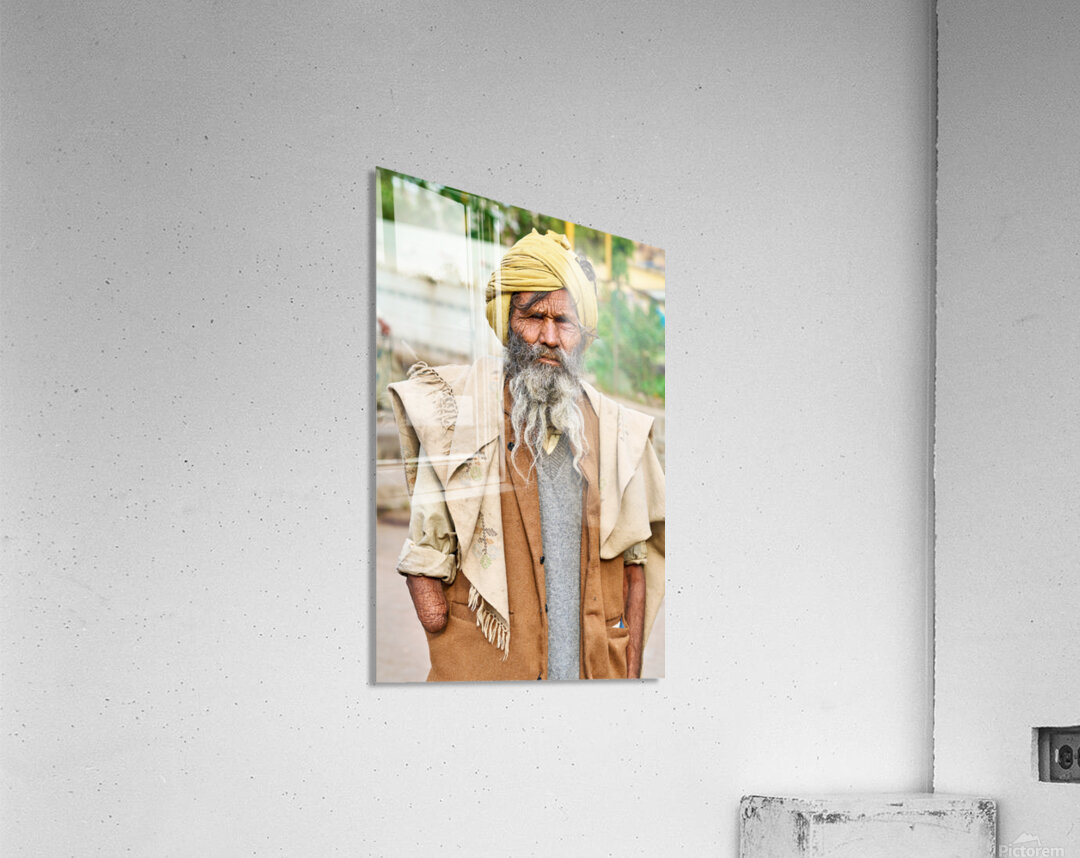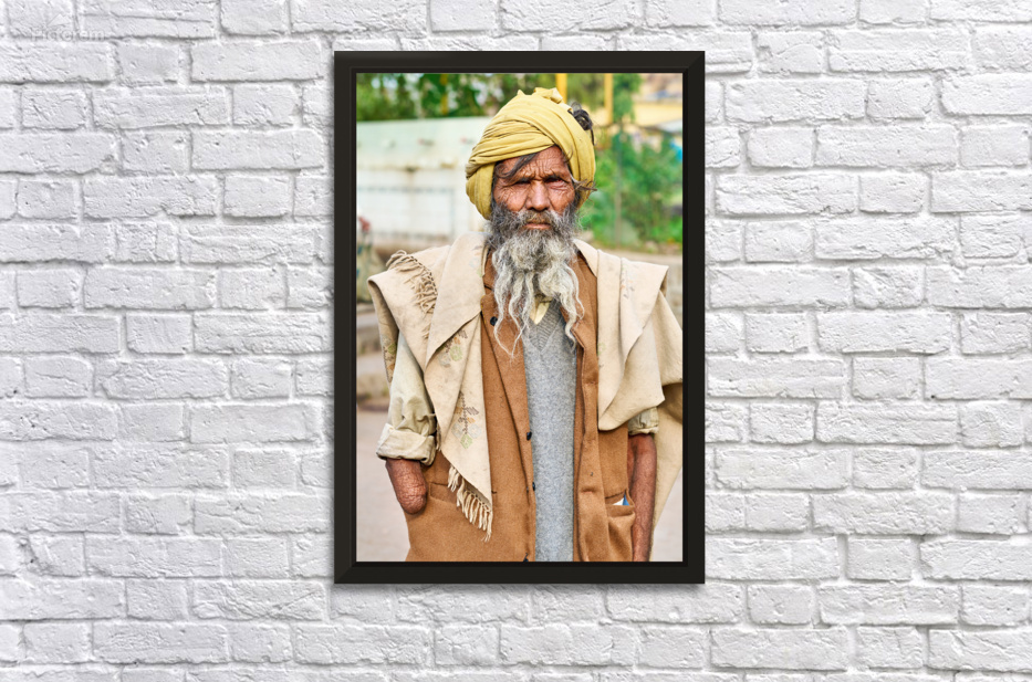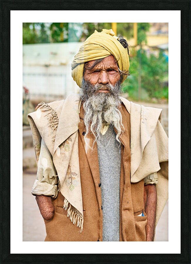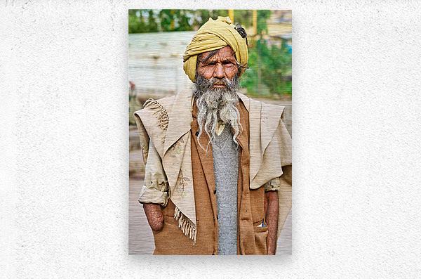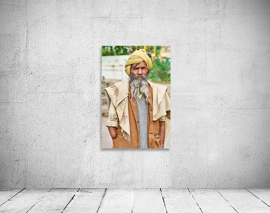 A man standing quietly in Orchha Madhya Pradesh India wearing traditional clothing and a yellow turban.