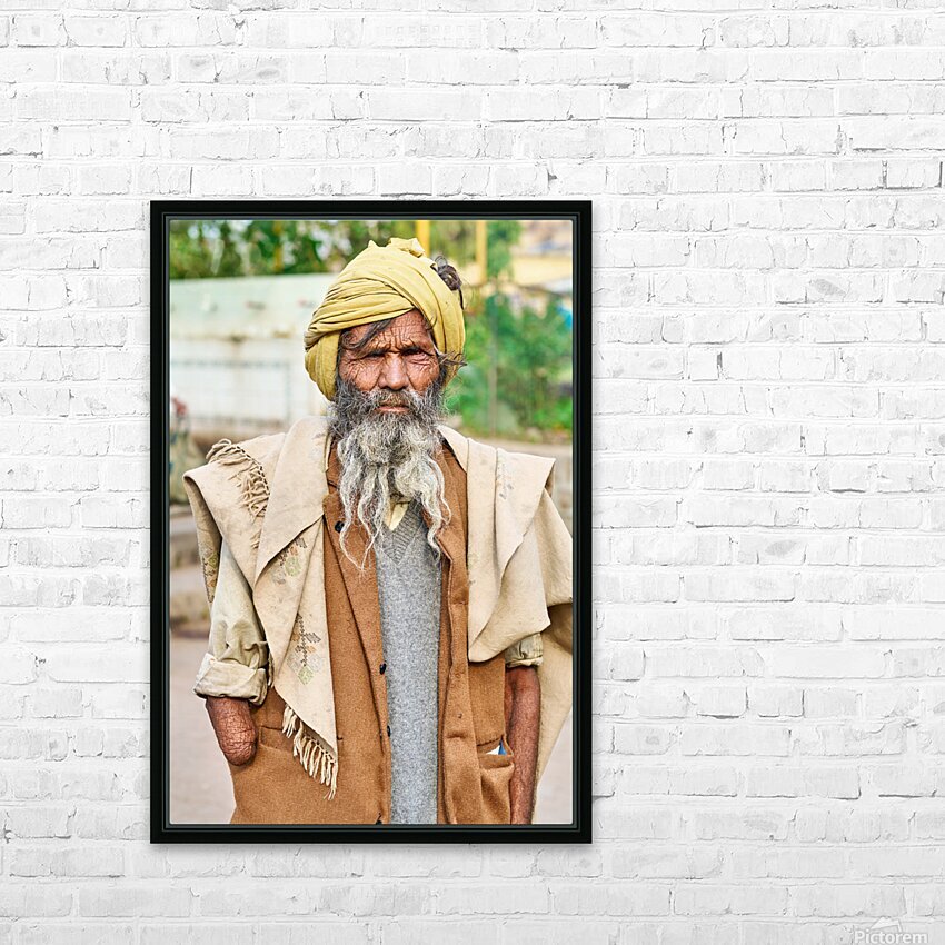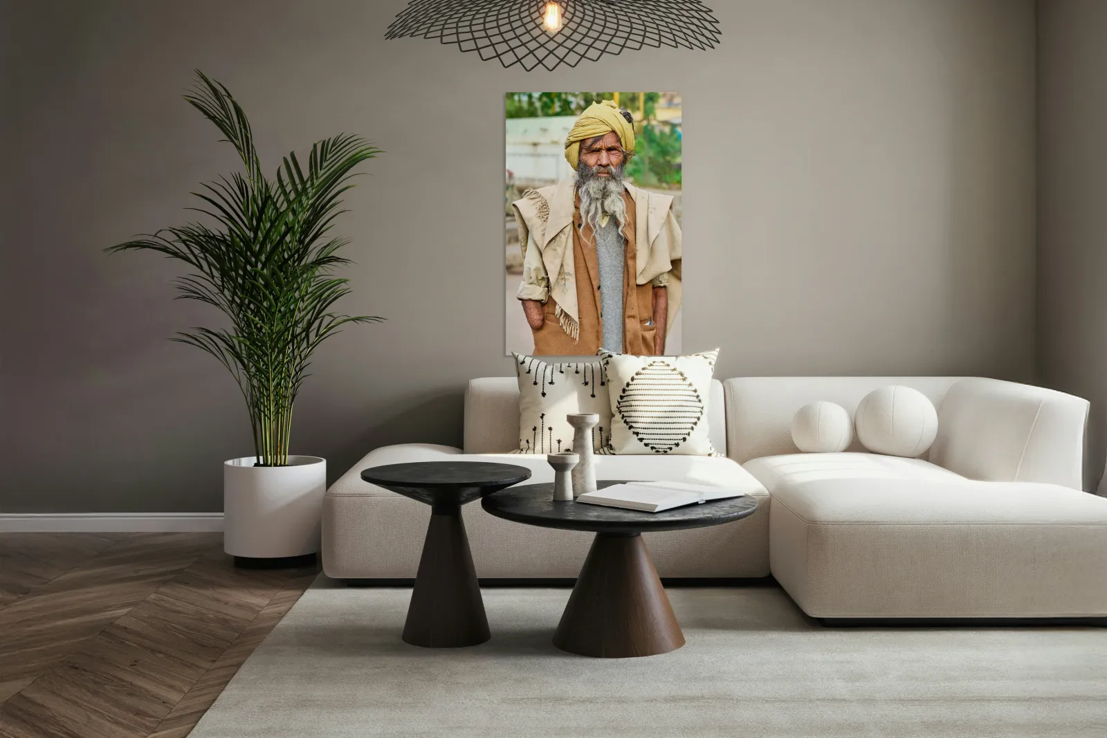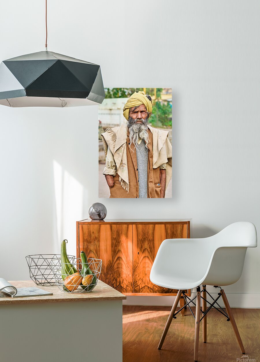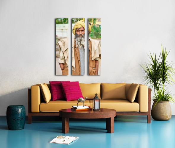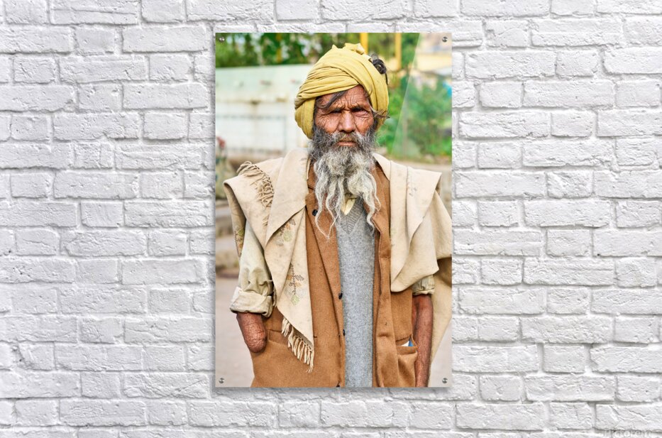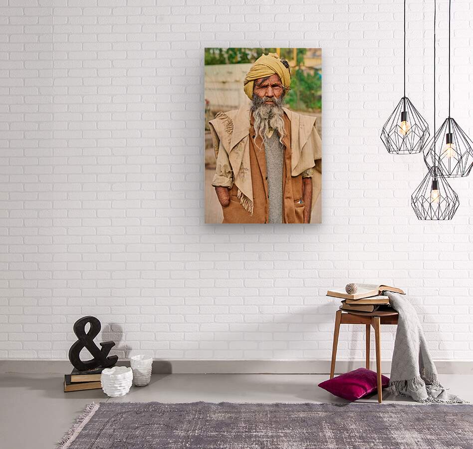 A man standing quietly in Orchha Madhya Pradesh India wearing traditional clothing and a yellow turban.
