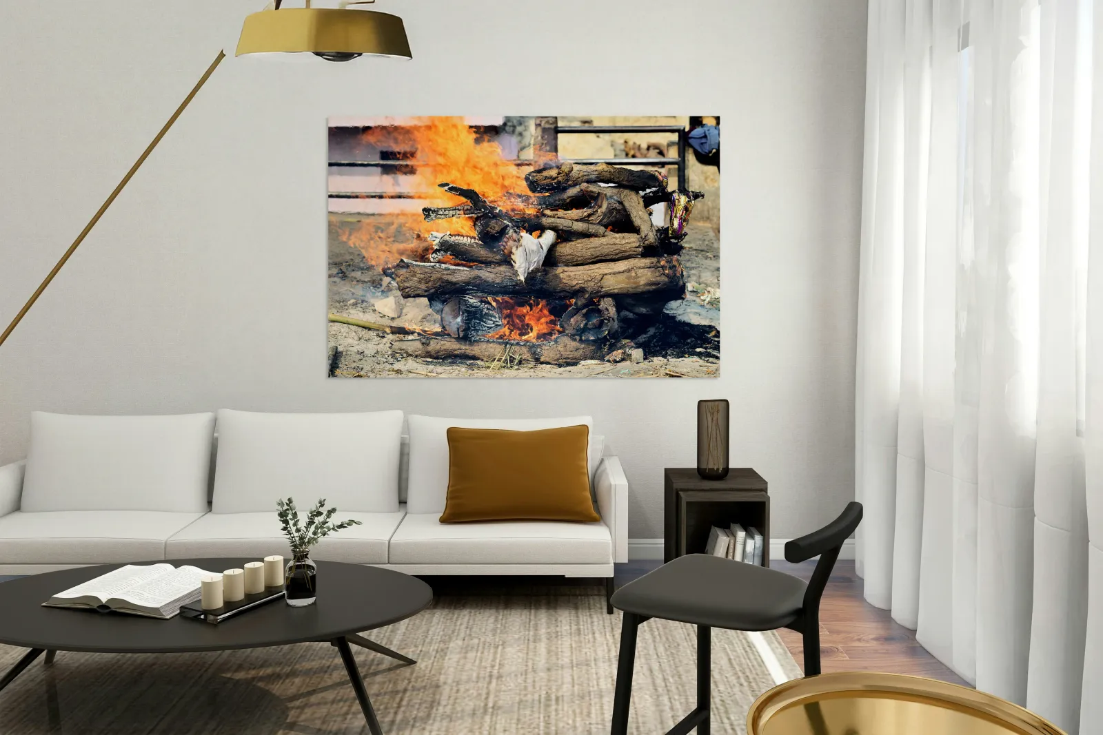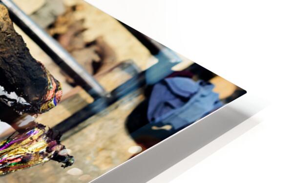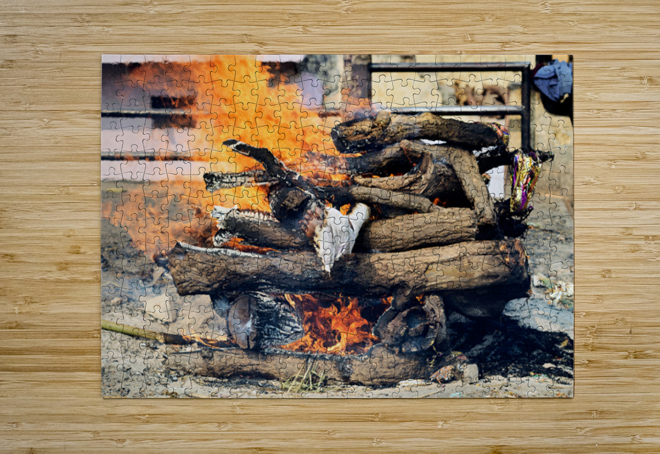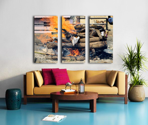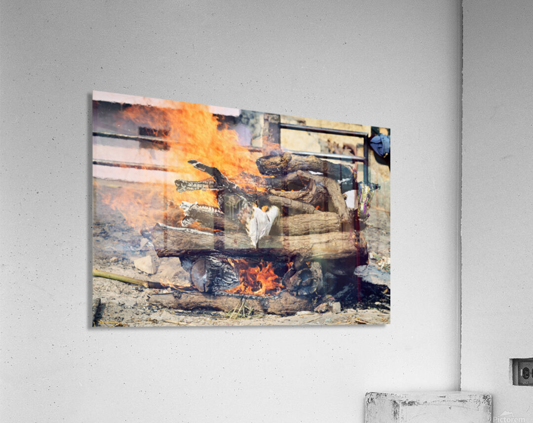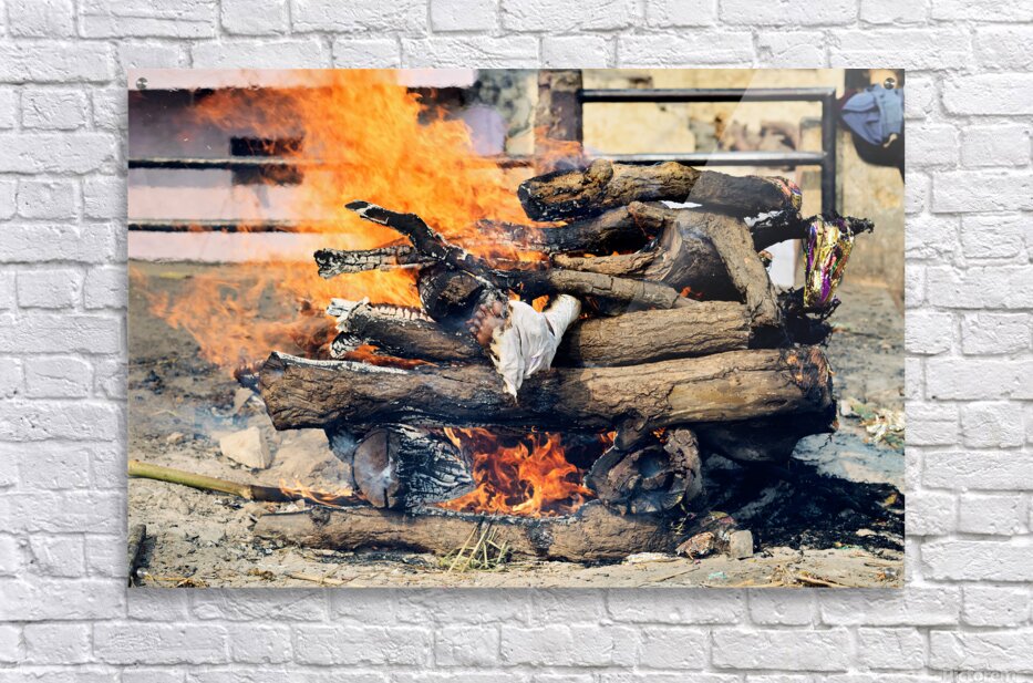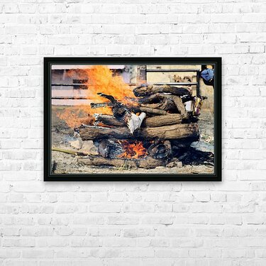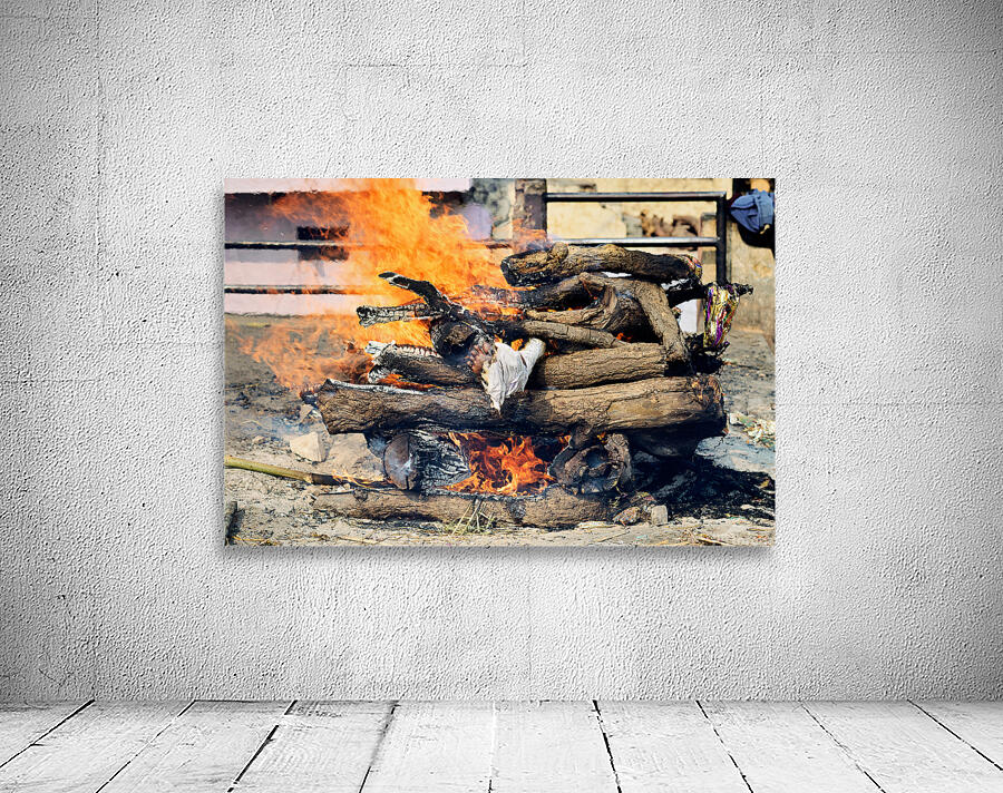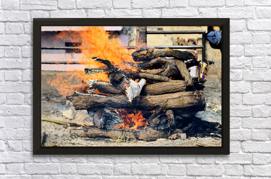 "Cremation rite by the Ganges River in Varanasi" in a framed print.