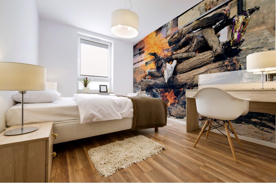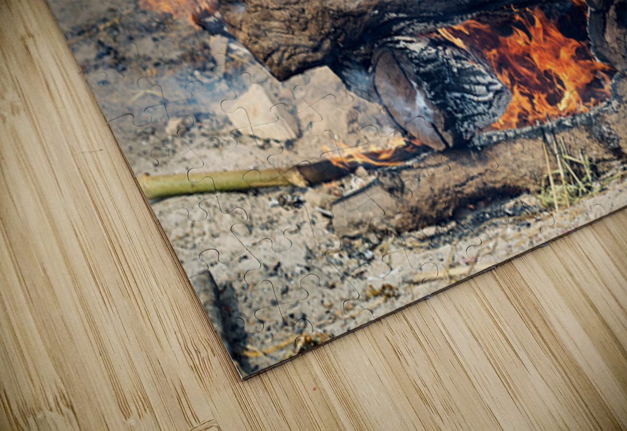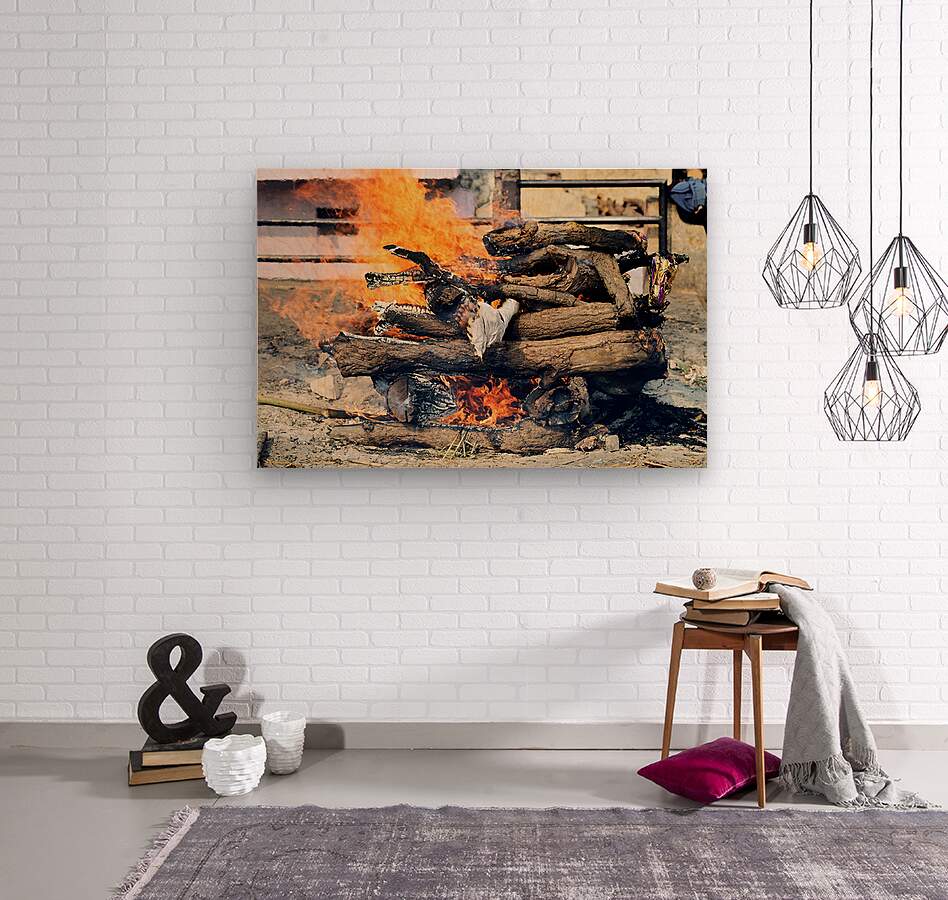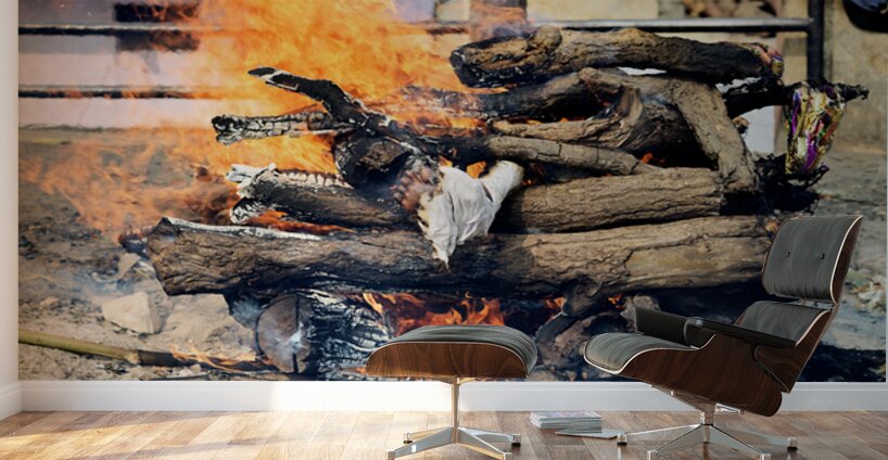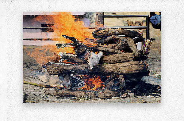 Hindu cremation is taking place along the banks of the Ganges River in Varanasi Uttar Pradesh. Flames engulf wooden logs during the ritual.