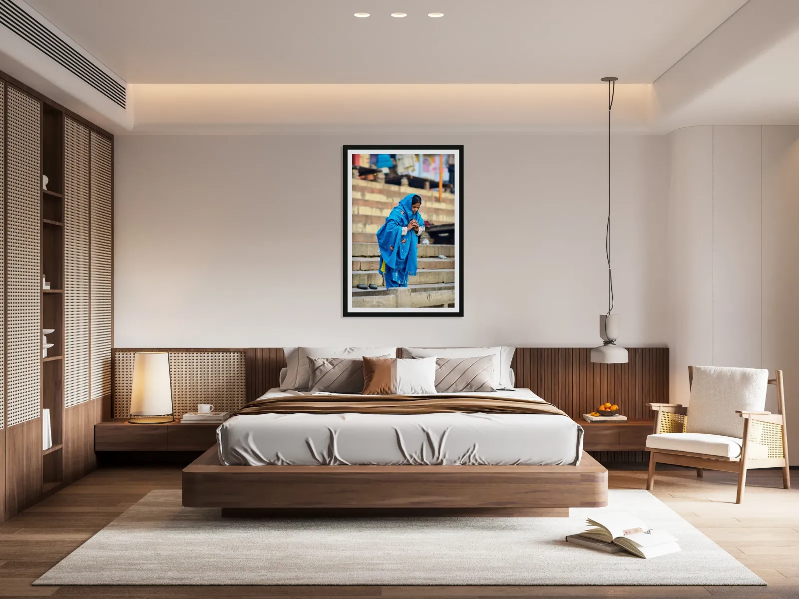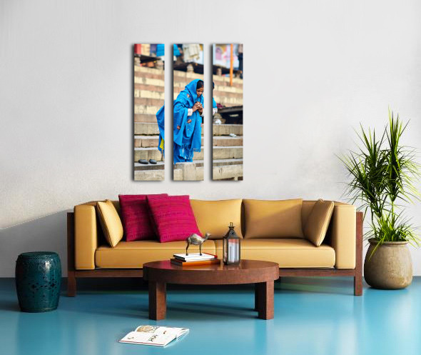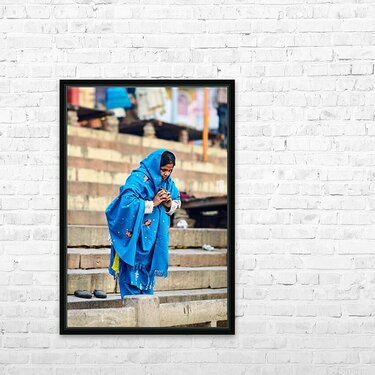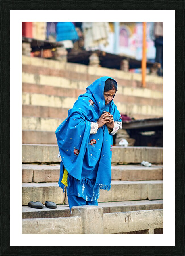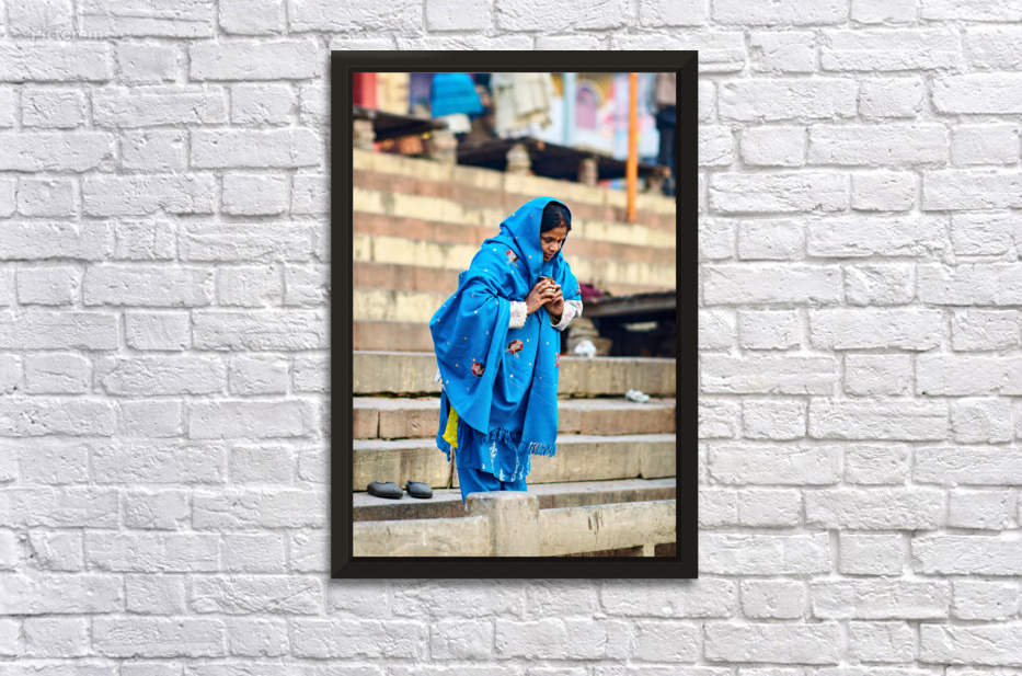 "Woman praying by the Ganges in Varanasi during morning hours" in a framed print.