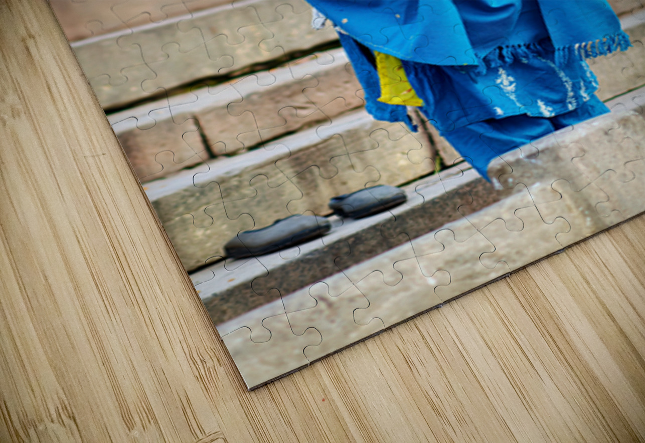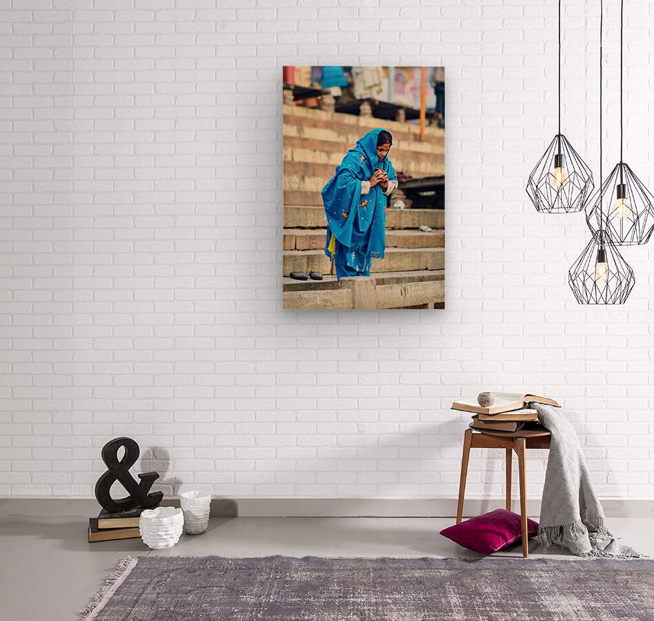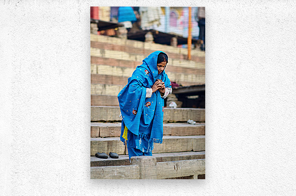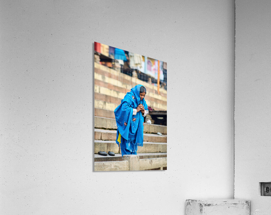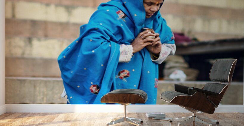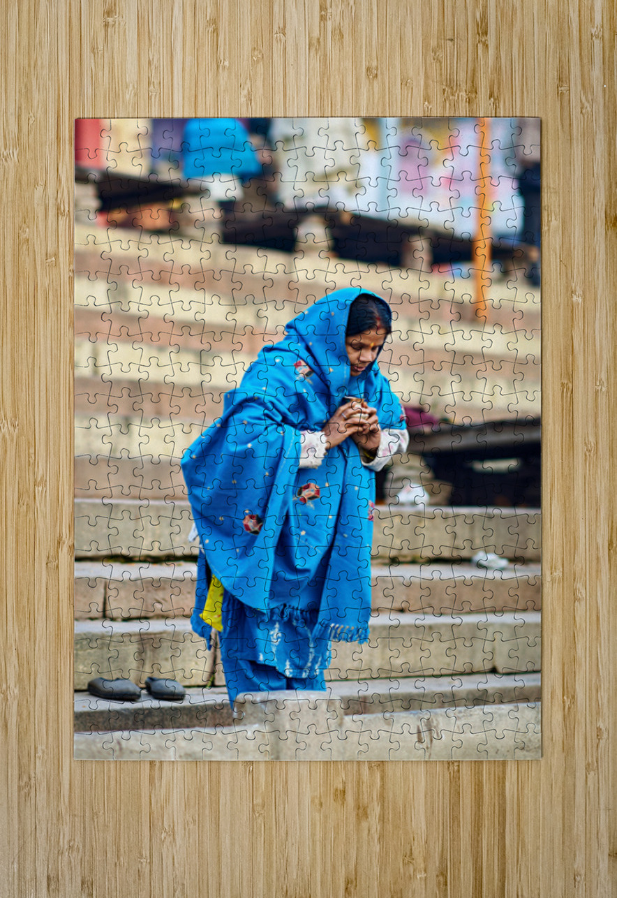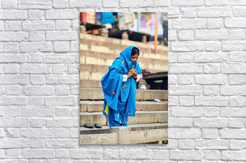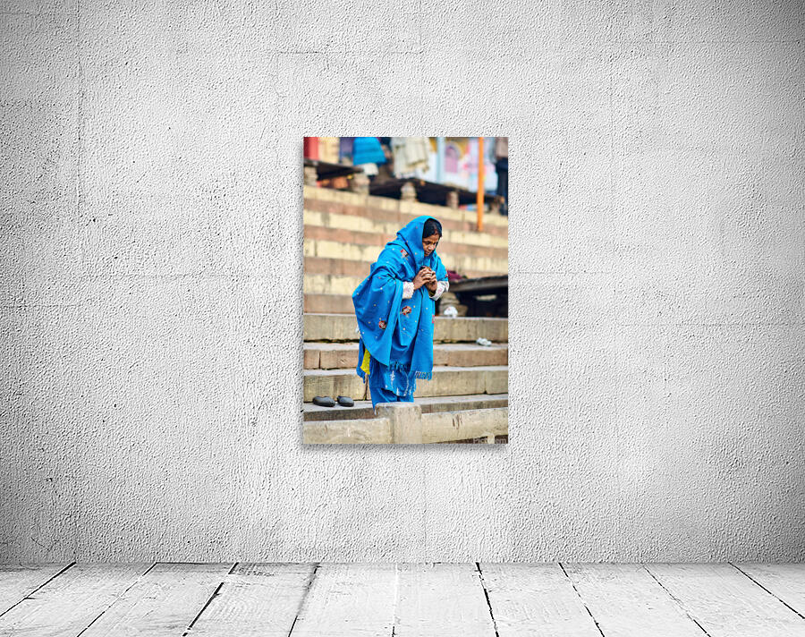 A woman dressed in a blue shawl prays at the steps by the Ganges River in Varanasi. The morning light reflects on her devotion and surroundings.
