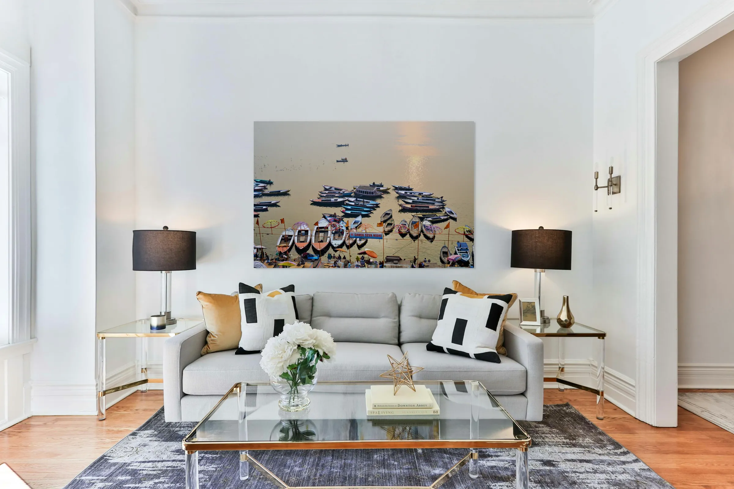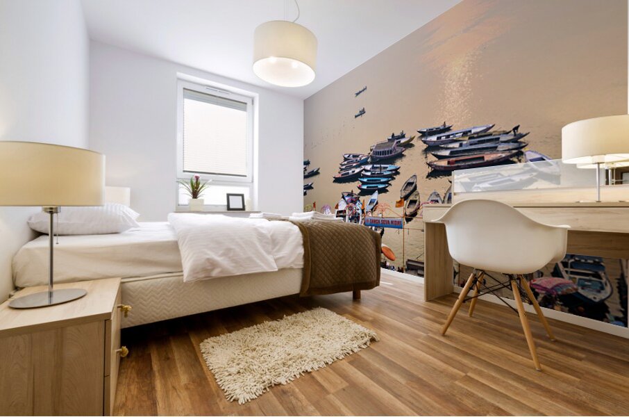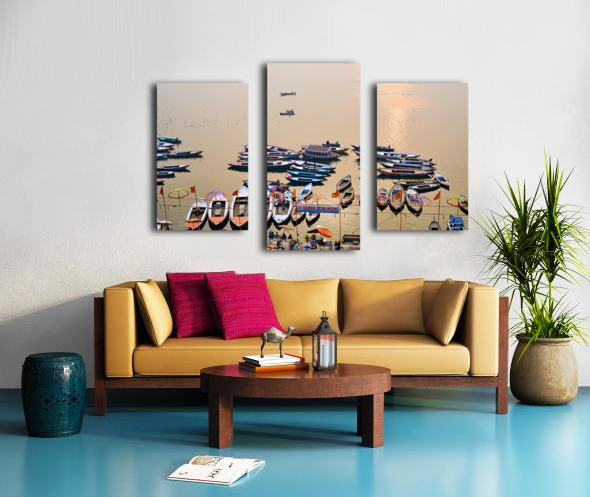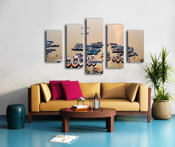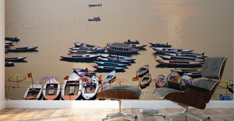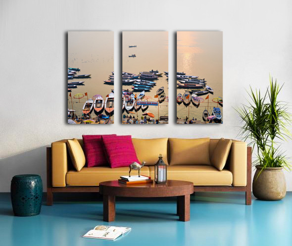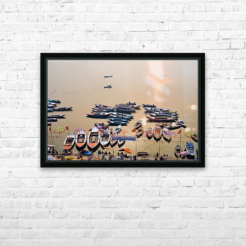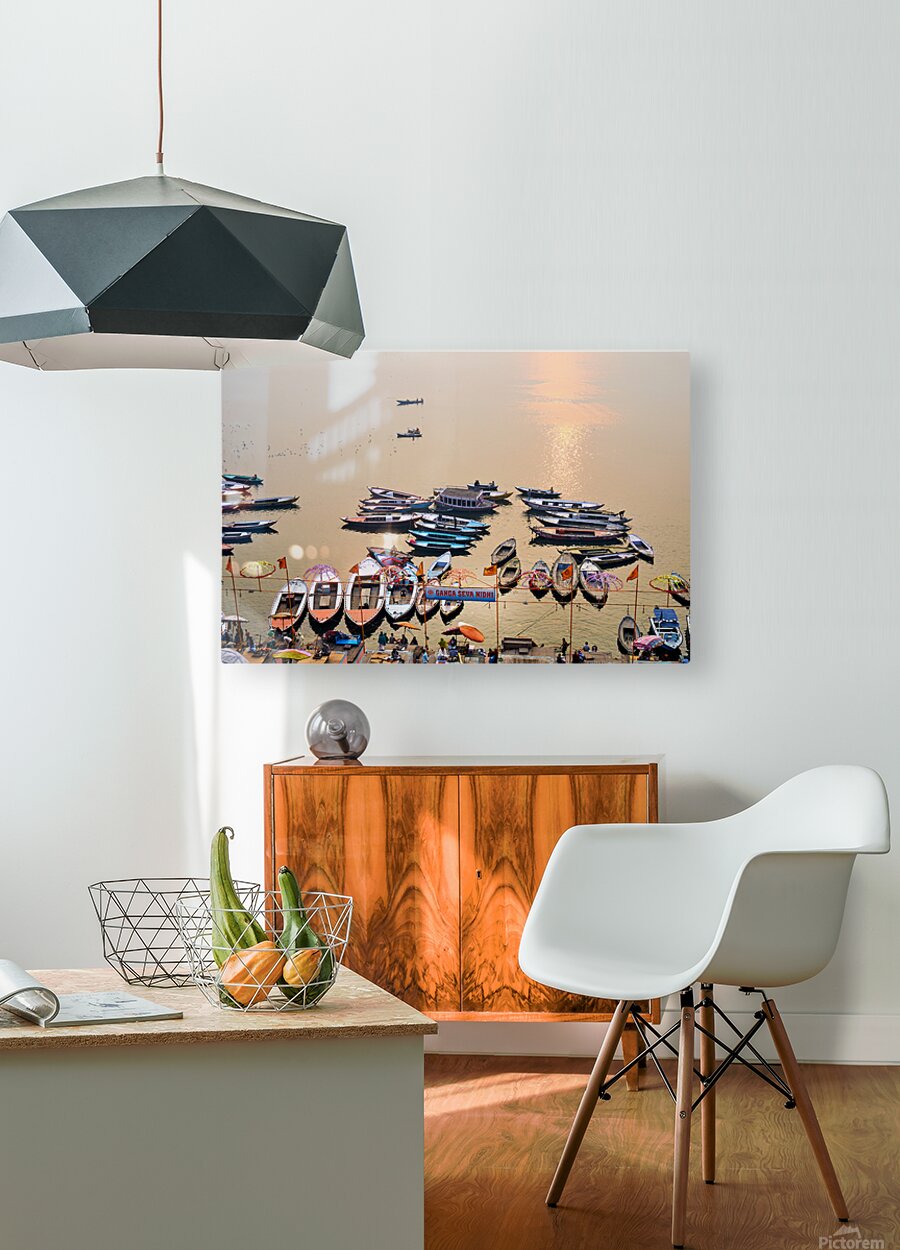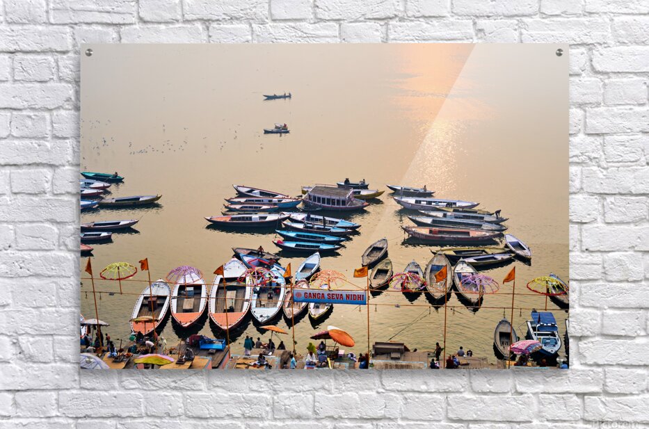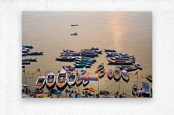 ABOUT THIS ARTWORK: SUNRISE AT GANGES RIVER IN VARANASI WITH BOATS AND ACTIVITIES