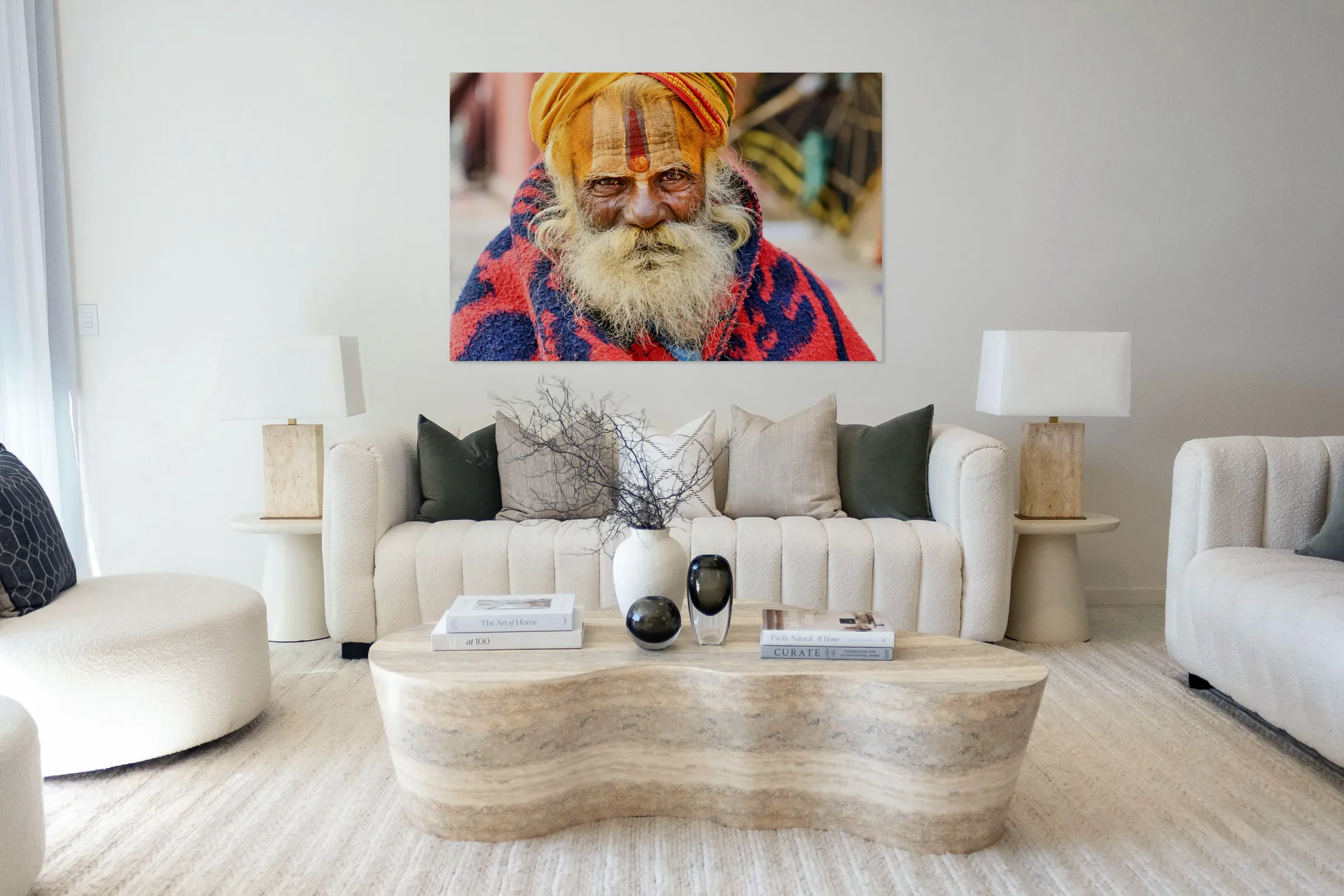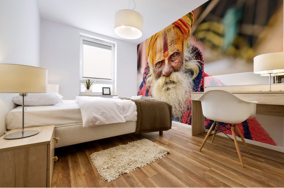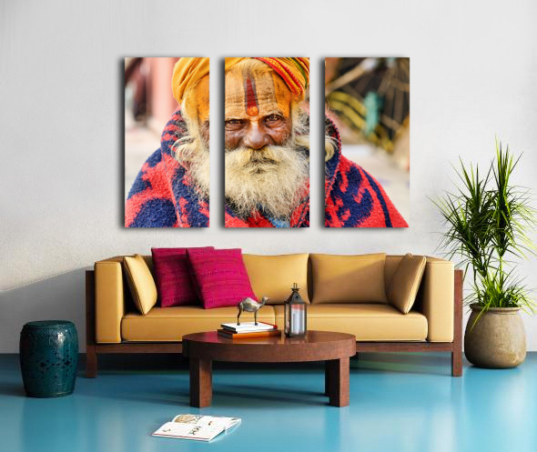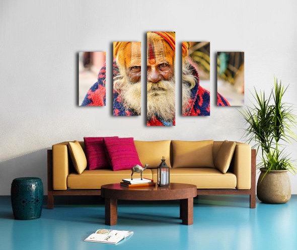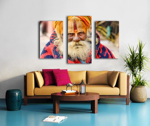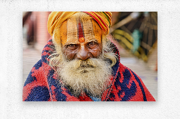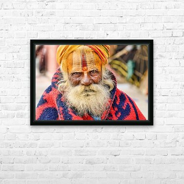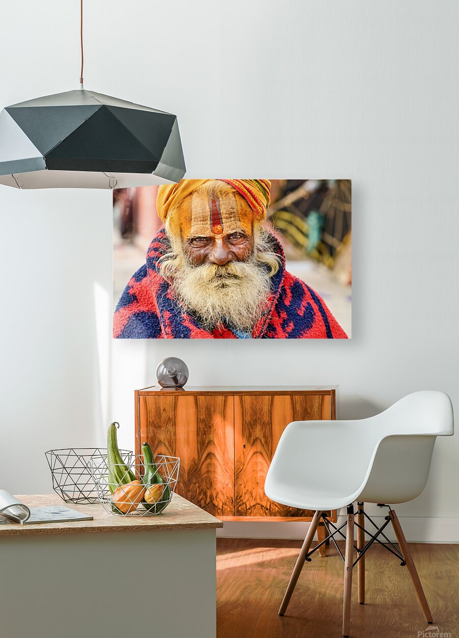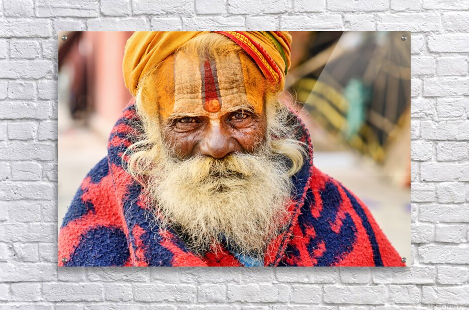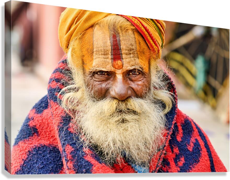 Get this artwork "Old holy man in Varanasi wearing bright colors in Uttar Pradesh" in a framed print.