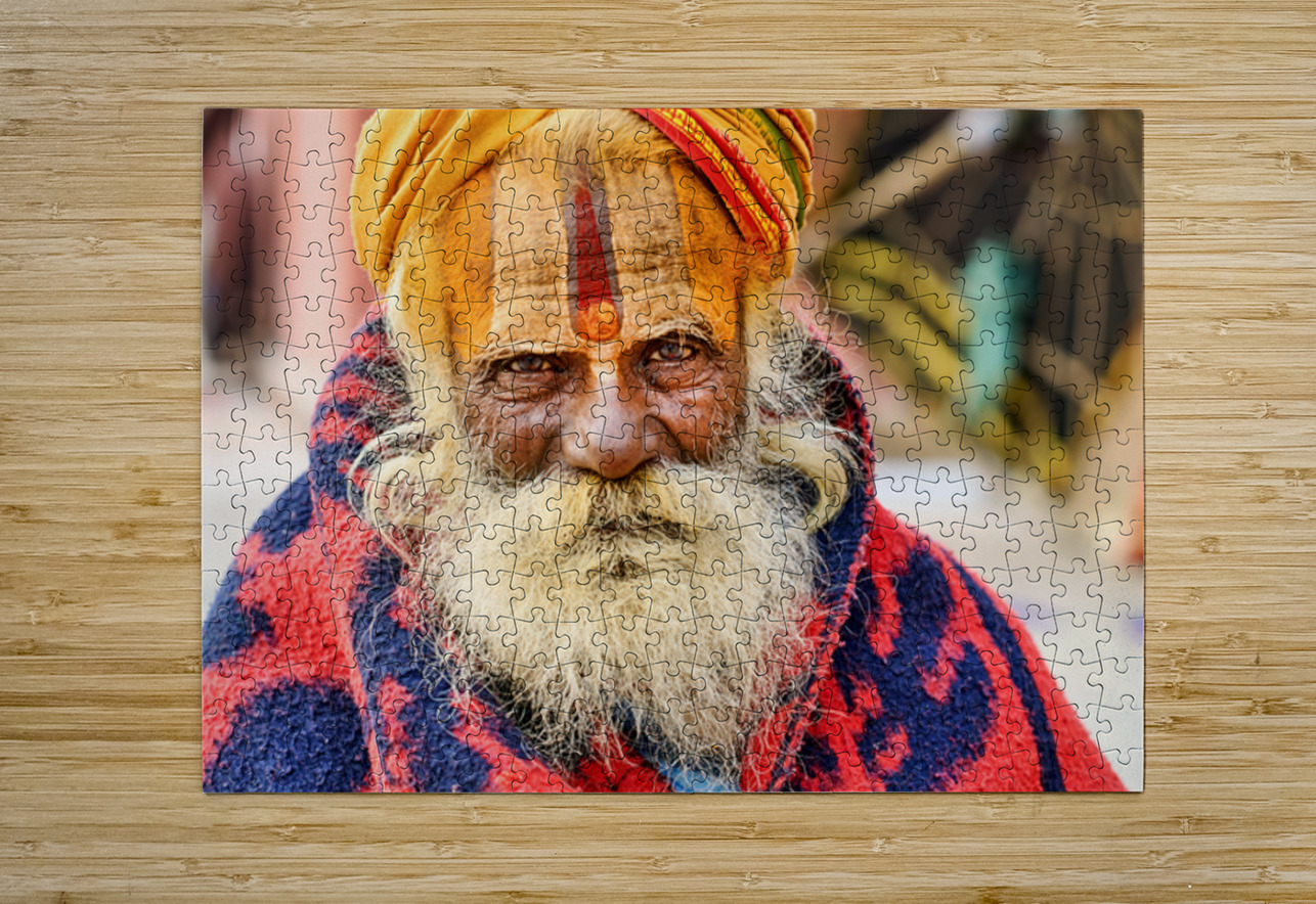 Old holy man in Varanasi wearing bright colors in Uttar Pradesh Marco Brivio Puzzle