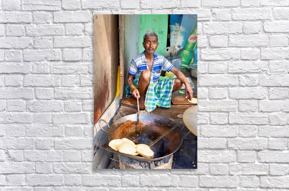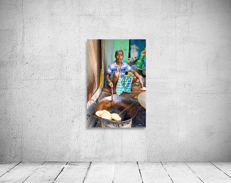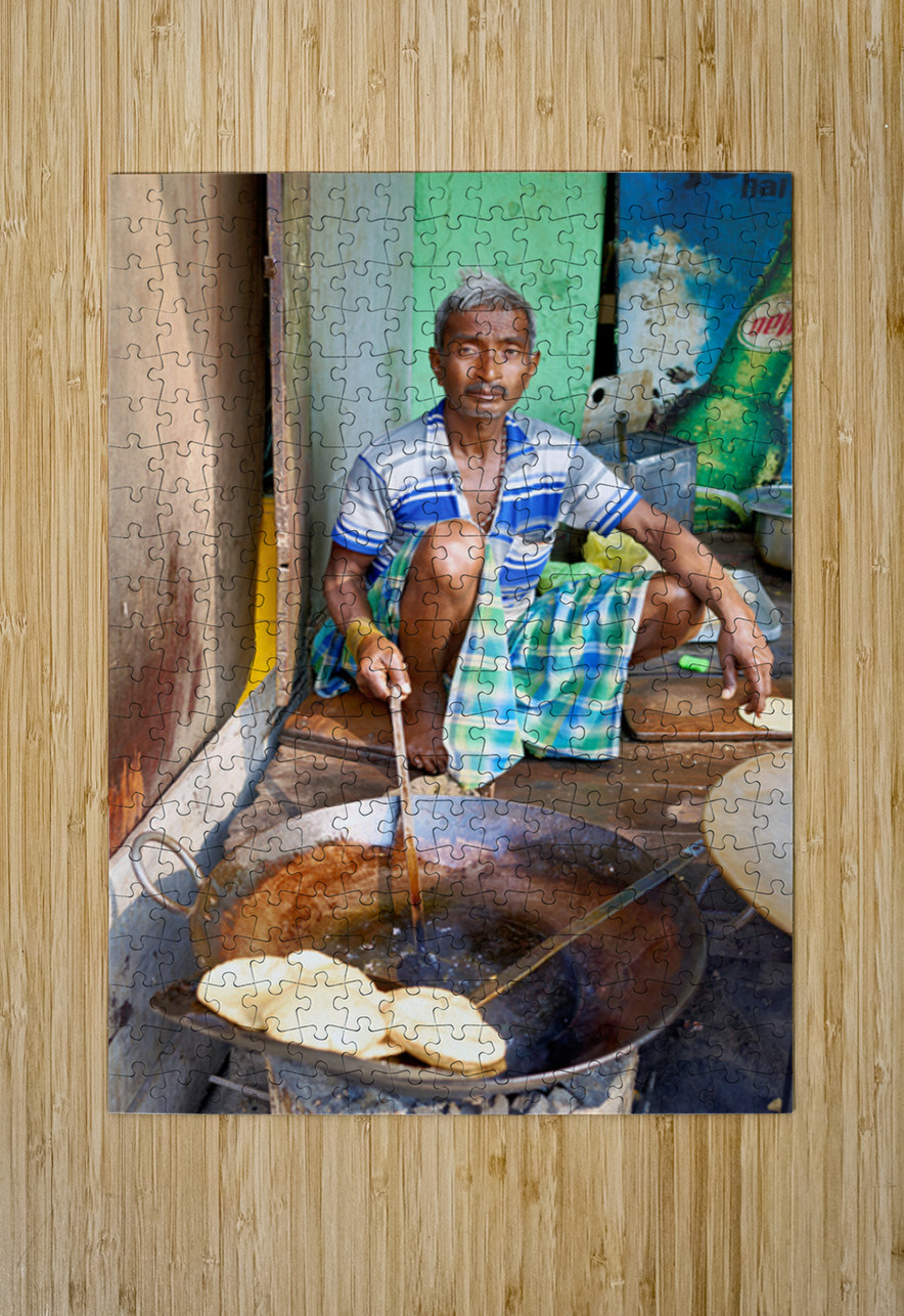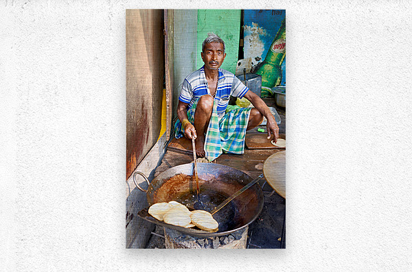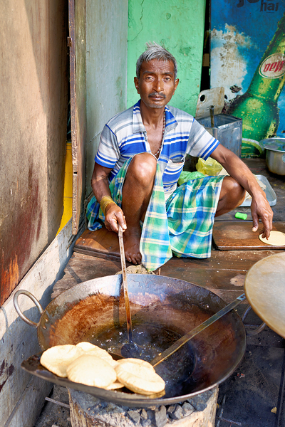 A man sits on the ground cooking sweets in a large pan on a street in Varanasi. He focuses on his task while surrounded by other cooking tools.