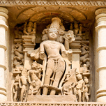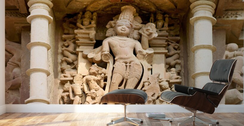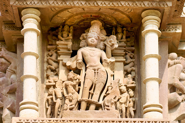 Visitors explore Khajuraho in Madhya Pradesh where ancient Hindu temples showcase detailed sculptures of love and life.