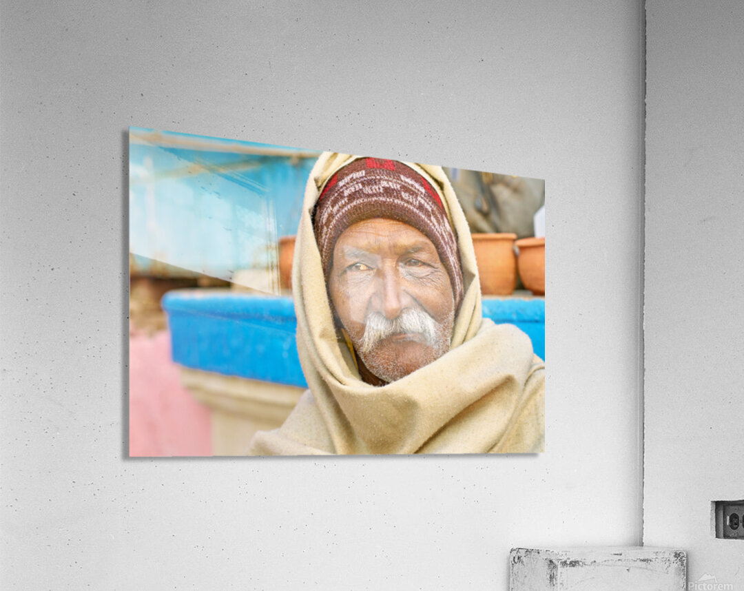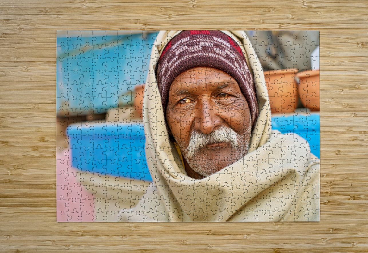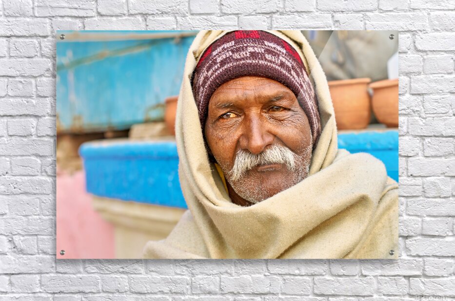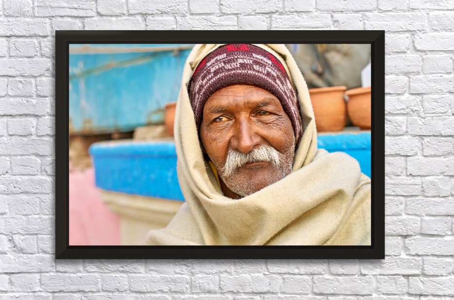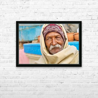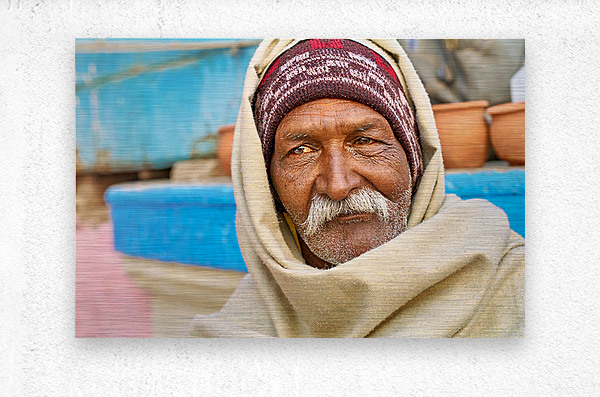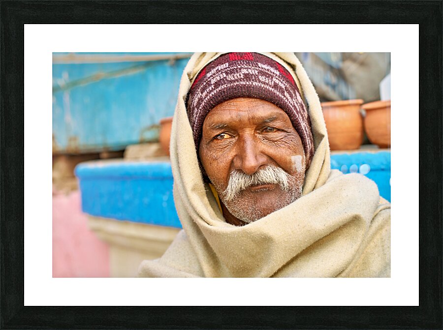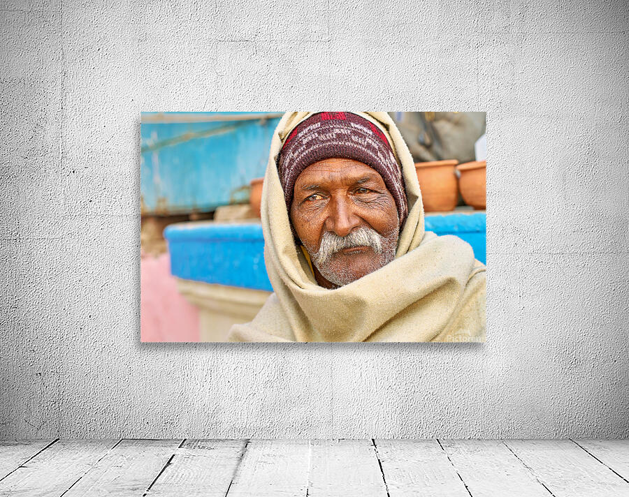 An old man sits quietly in Varanasi Uttar Pradesh. He wears a shawl and looks thoughtfully at the camera.