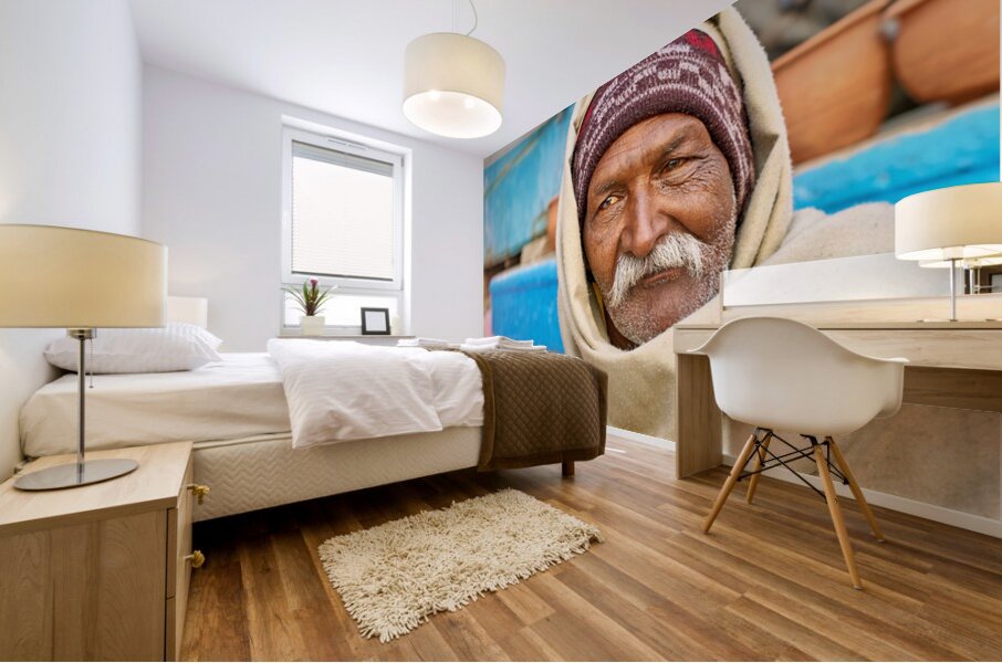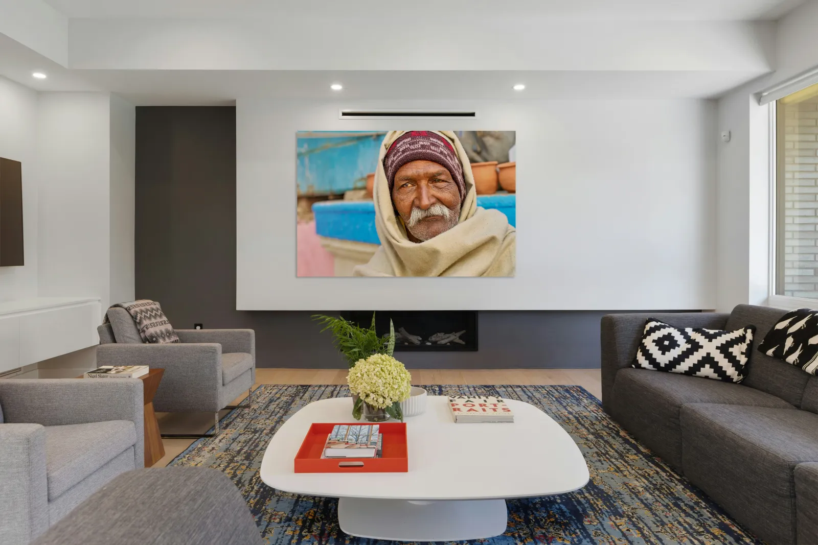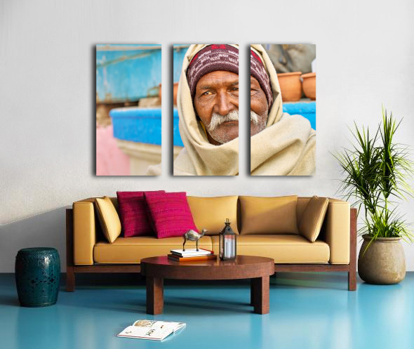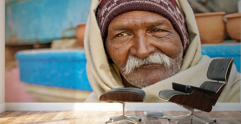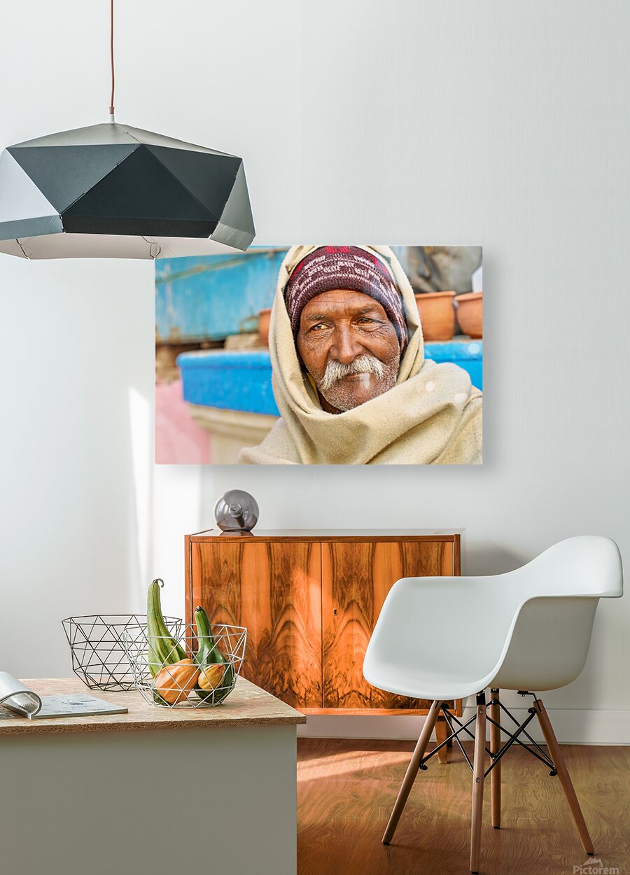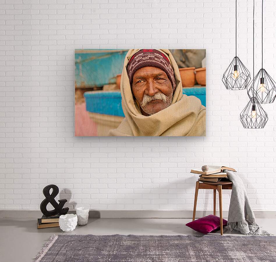 An old man sits quietly in Varanasi Uttar Pradesh. He wears a shawl and looks thoughtfully at the camera.