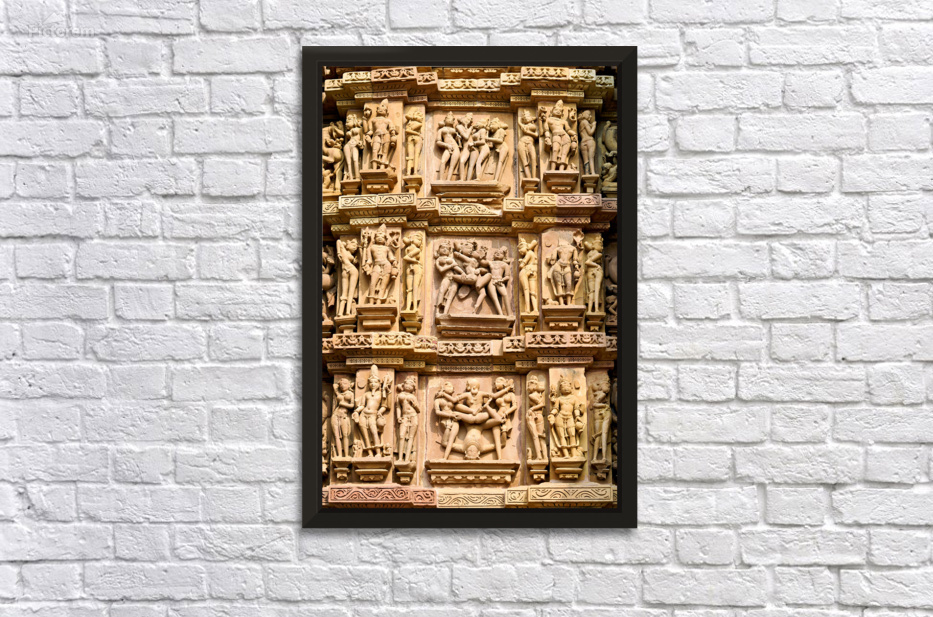 "Hindu erotic temples in Khajuraho Madhya Pradesh showcase sculp" in a framed print.