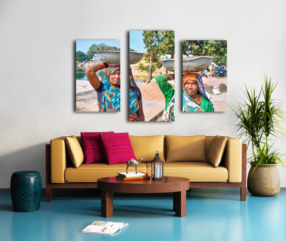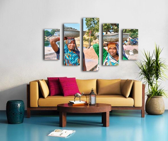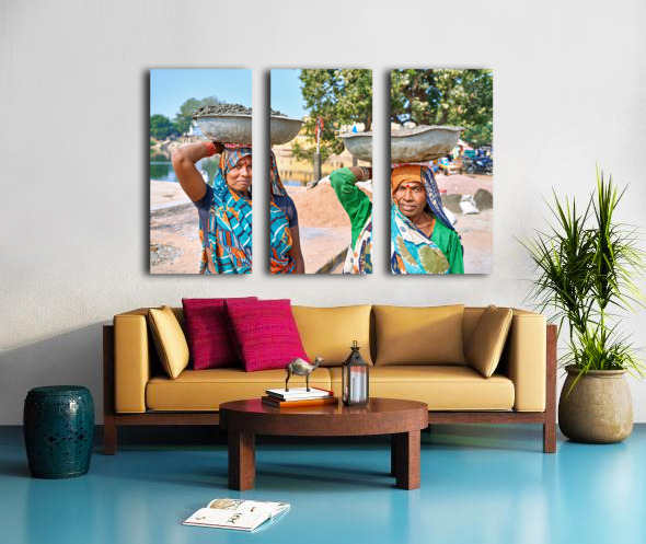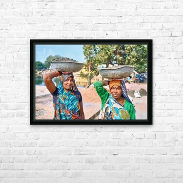 Get this artwork "Women carry materials in Varanasi near the river bank" in a framed print.
