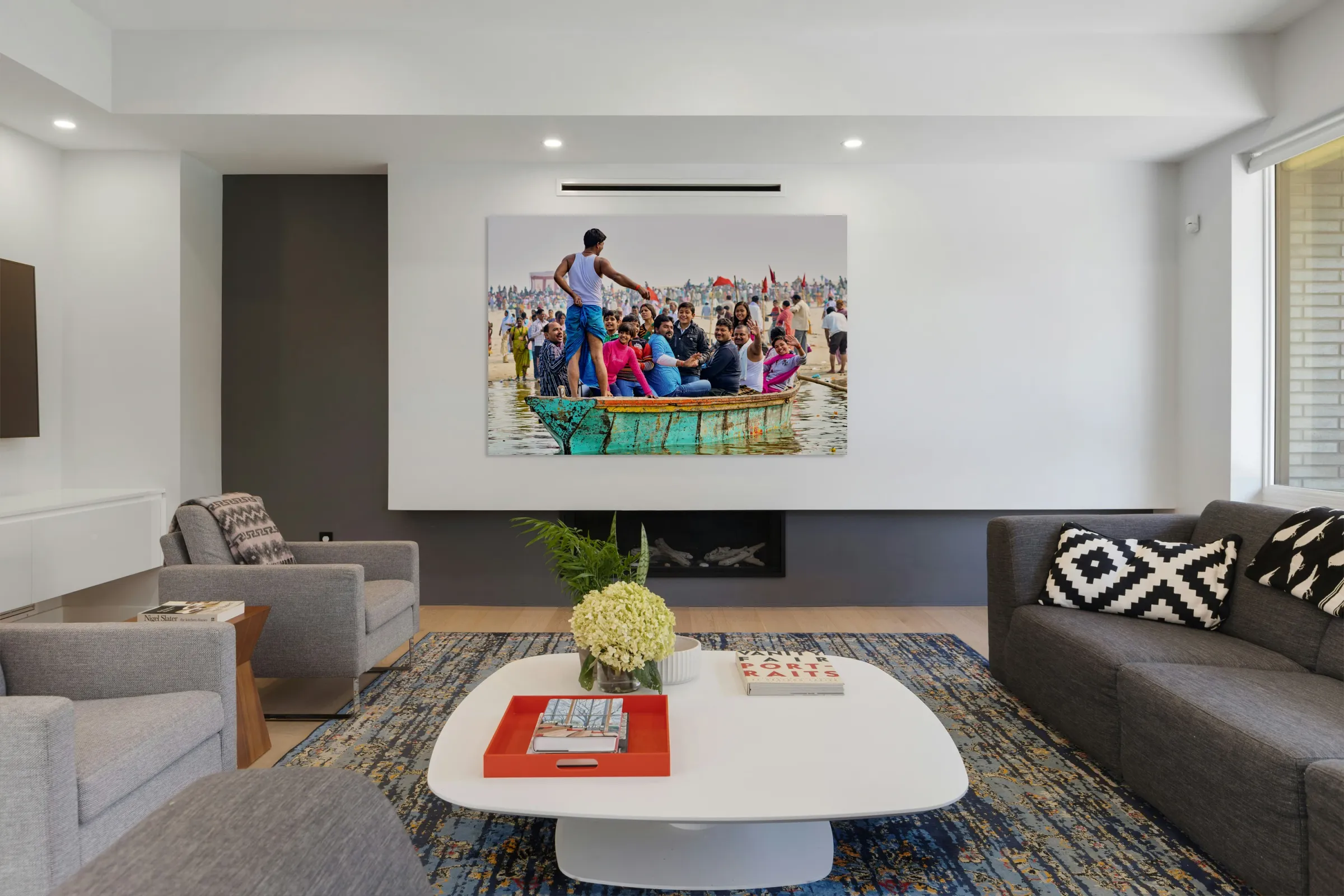 ABOUT THIS ARTWORK: PEOPLE SIT ON A BOAT ON THE GANGES RIVER