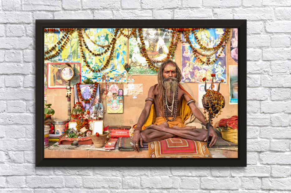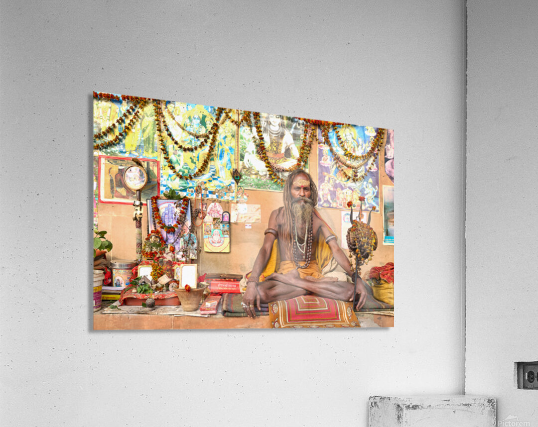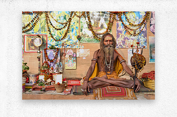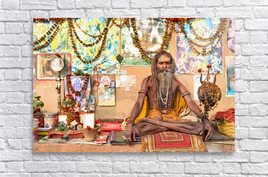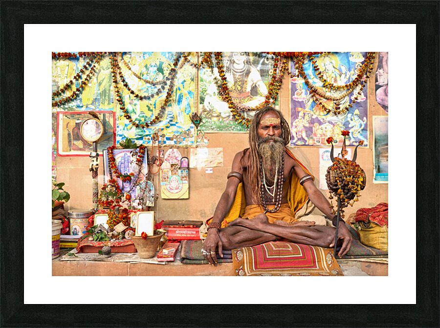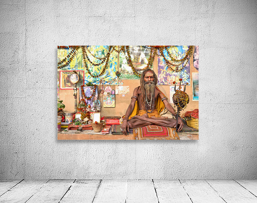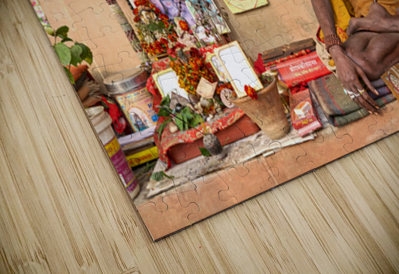 A sadhu sits quietly in Varanasi surrounded by religious items and flowers. Devotees visit the area to offer prayers and seek blessings.