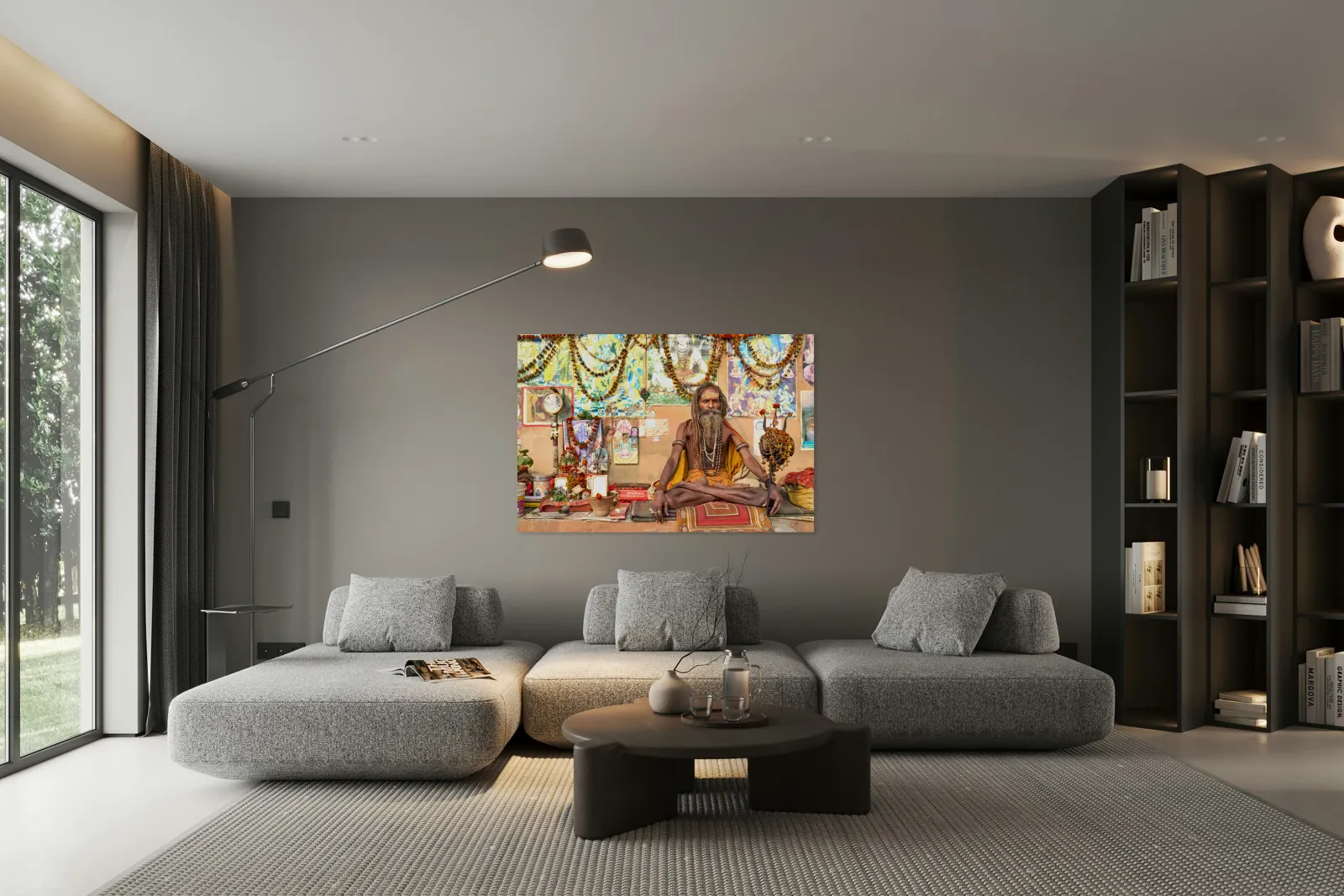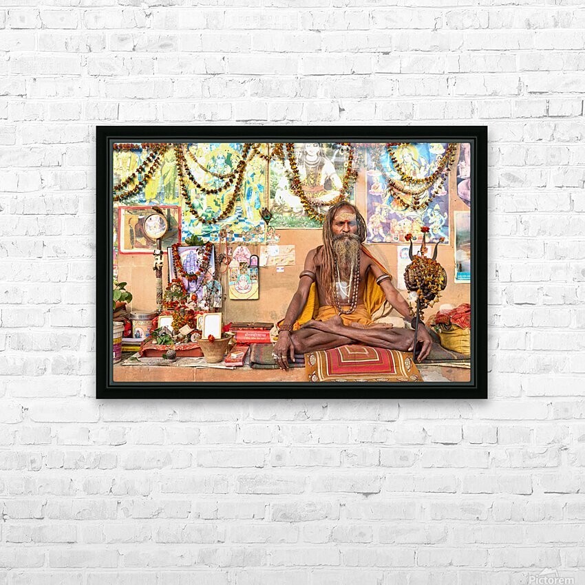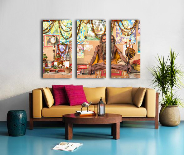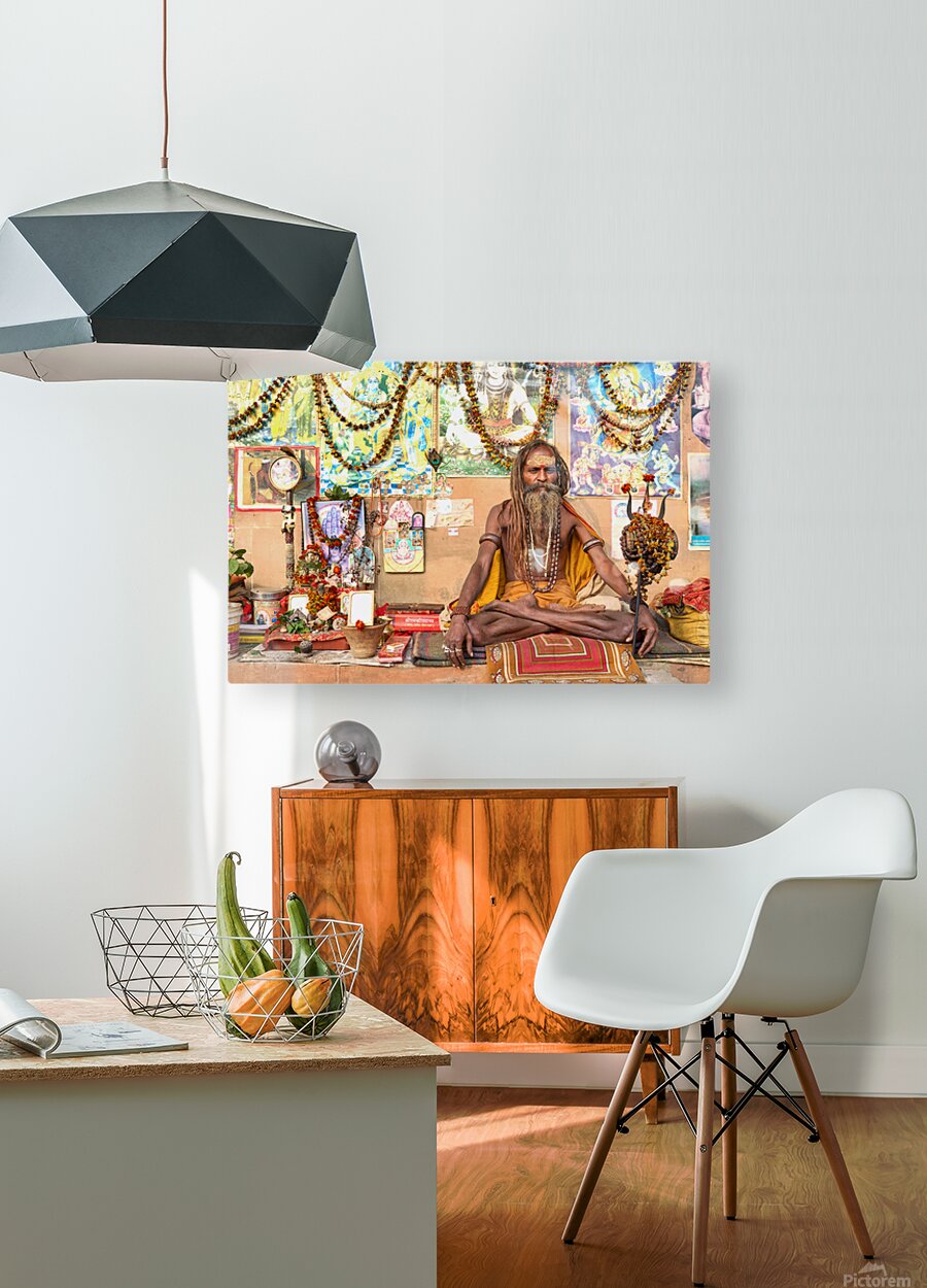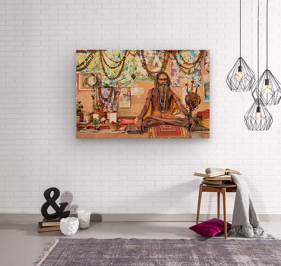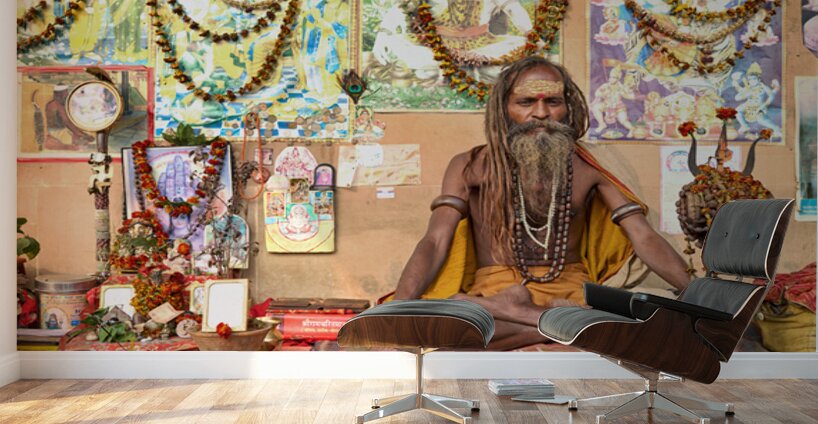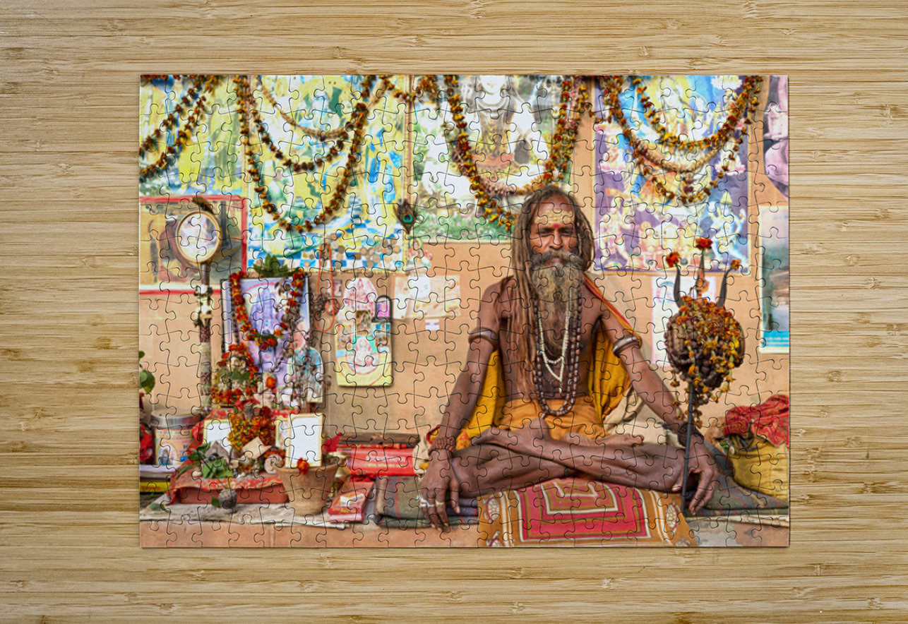 A sadhu sits quietly in Varanasi surrounded by religious items and flowers. Devotees visit the area to offer prayers and seek blessings.