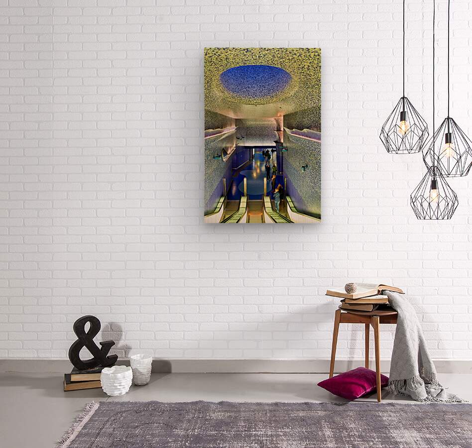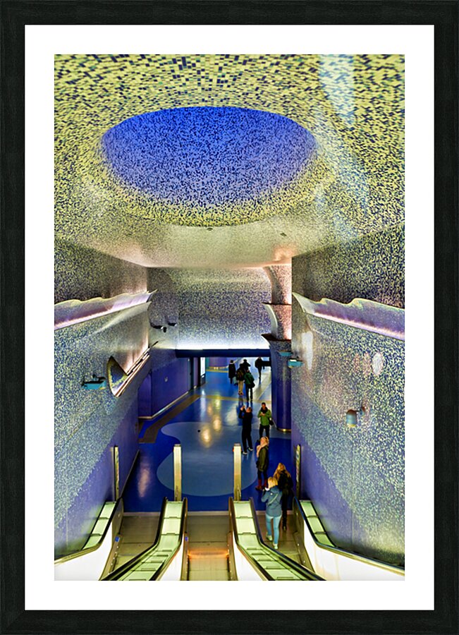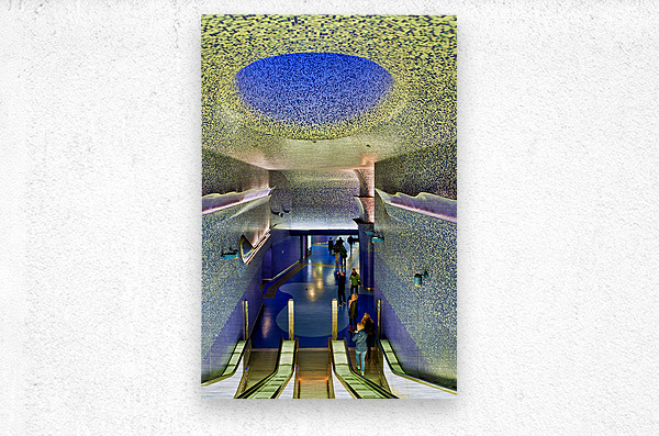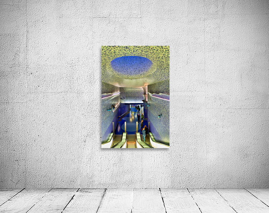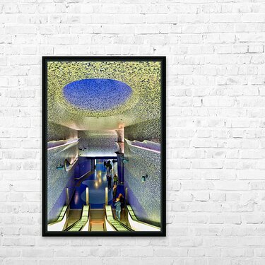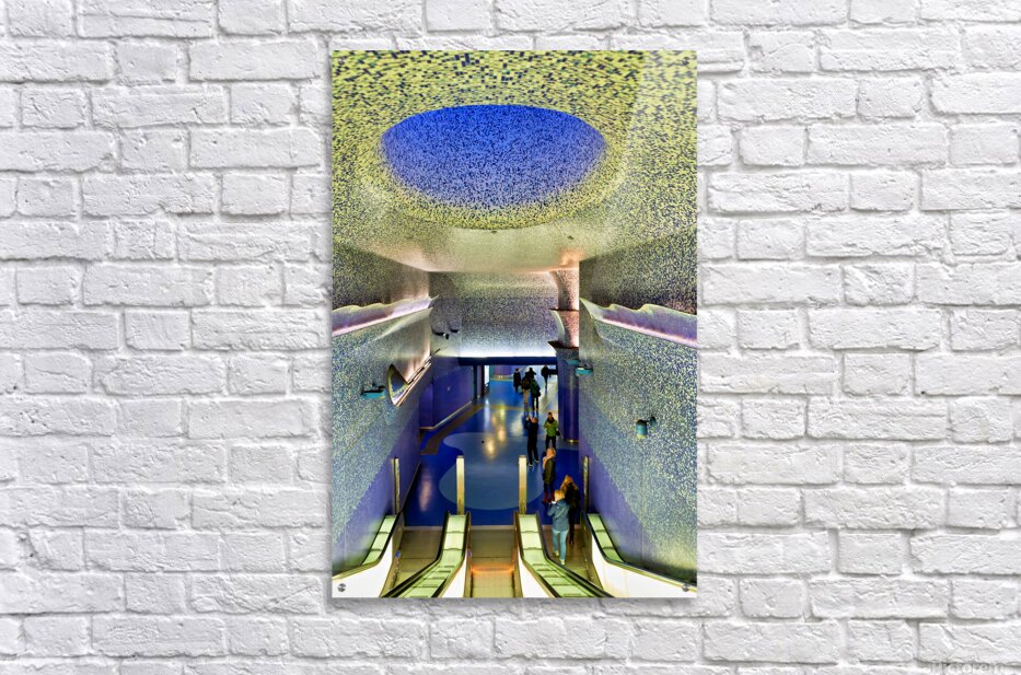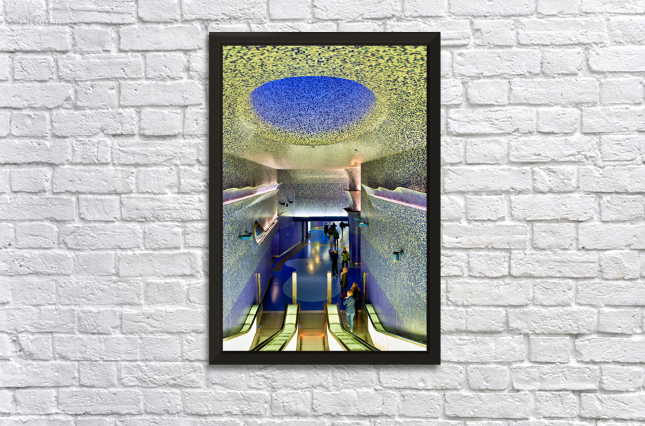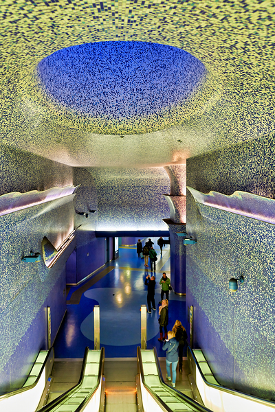 People walk down the escalators at Toledo station while looking at the blue ceiling and walls that create a colorful atmosphere.