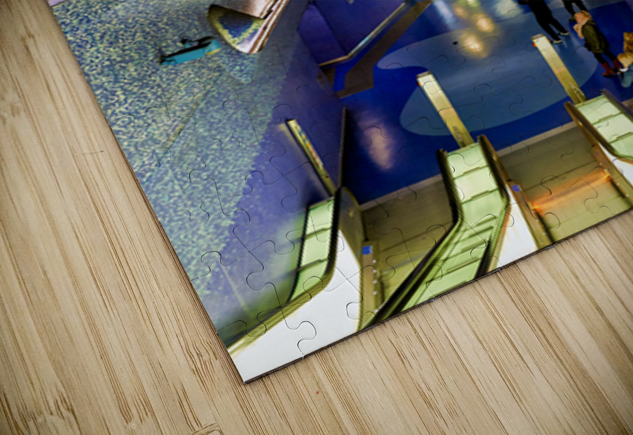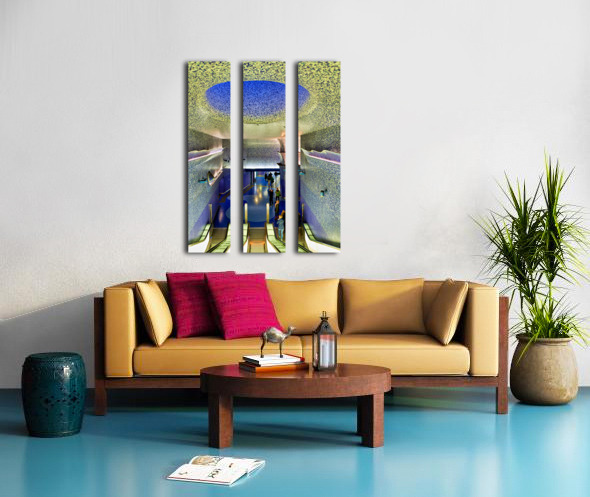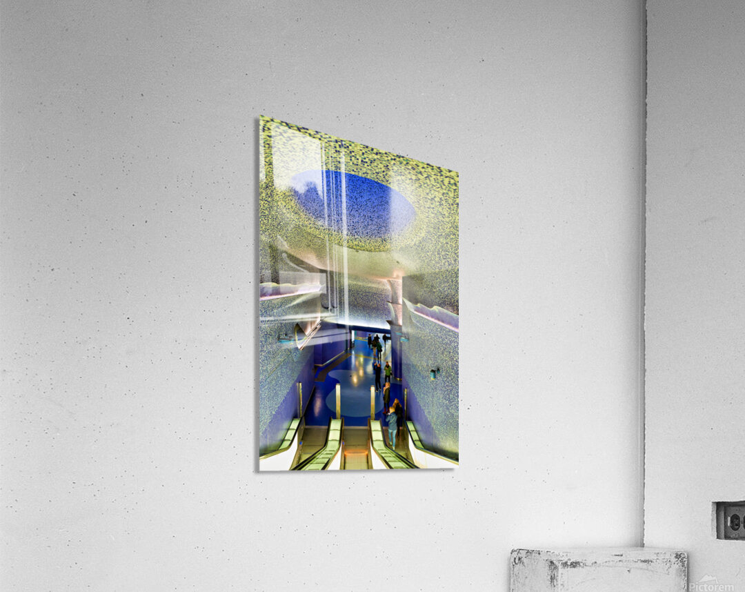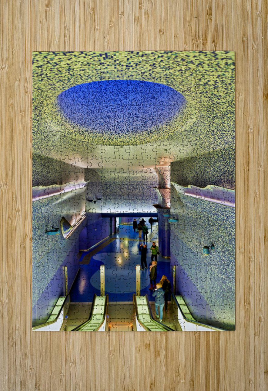 People walk down the escalators at Toledo station while looking at the blue ceiling and walls that create a colorful atmosphere.