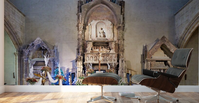 The altar of Santa Chiara Basilica Church in Naples shows the decorative setup and religious details that highlight the churchs history and art.