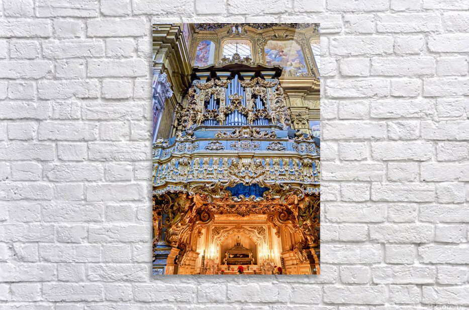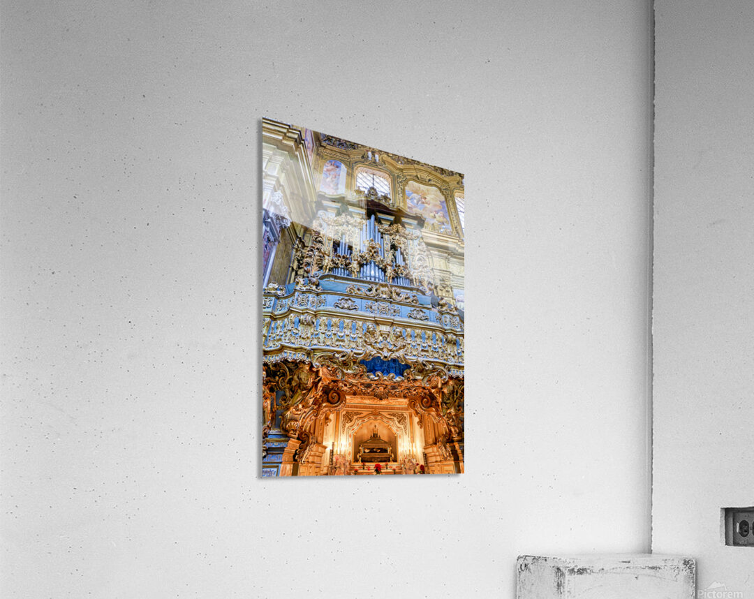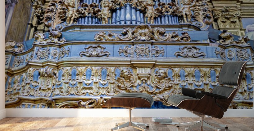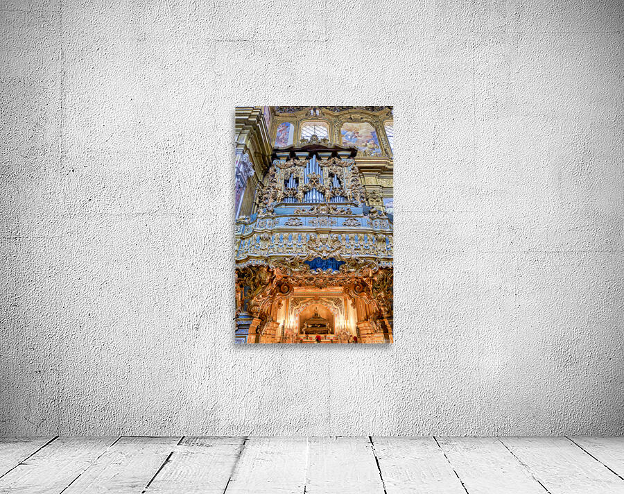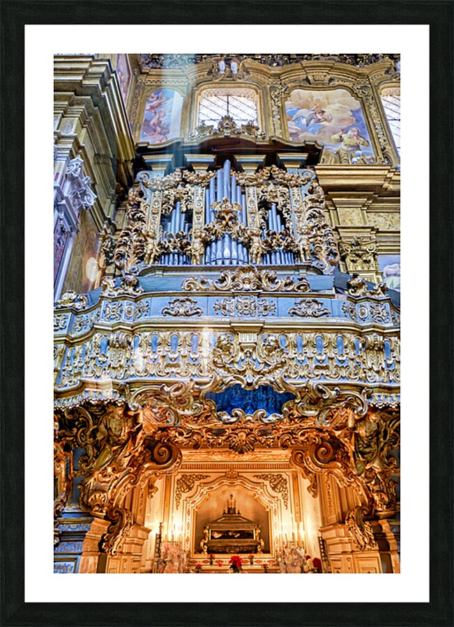 San Gregorio Armeno church displays a grand interior with an ornate altar and organ. Visitors admire the detailed decorations and architecture.
