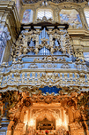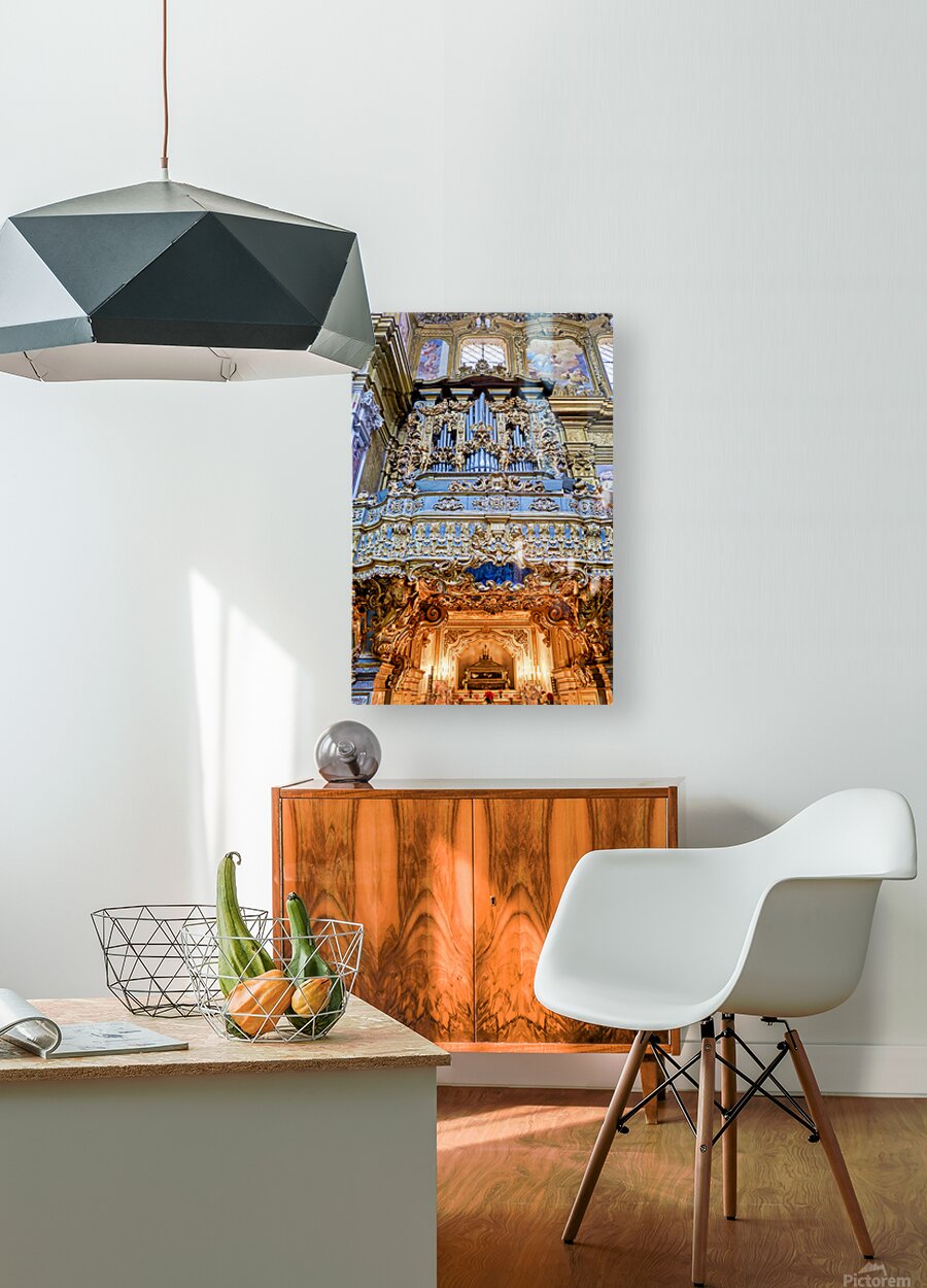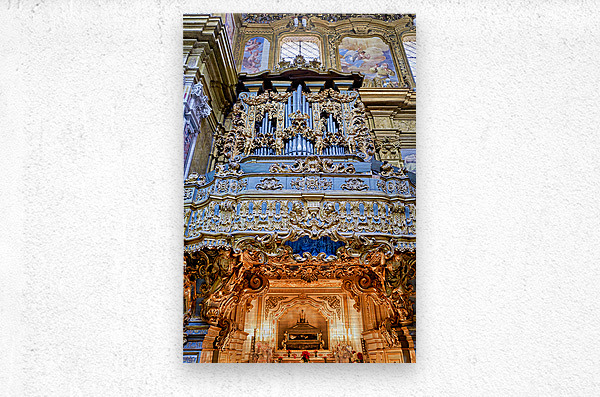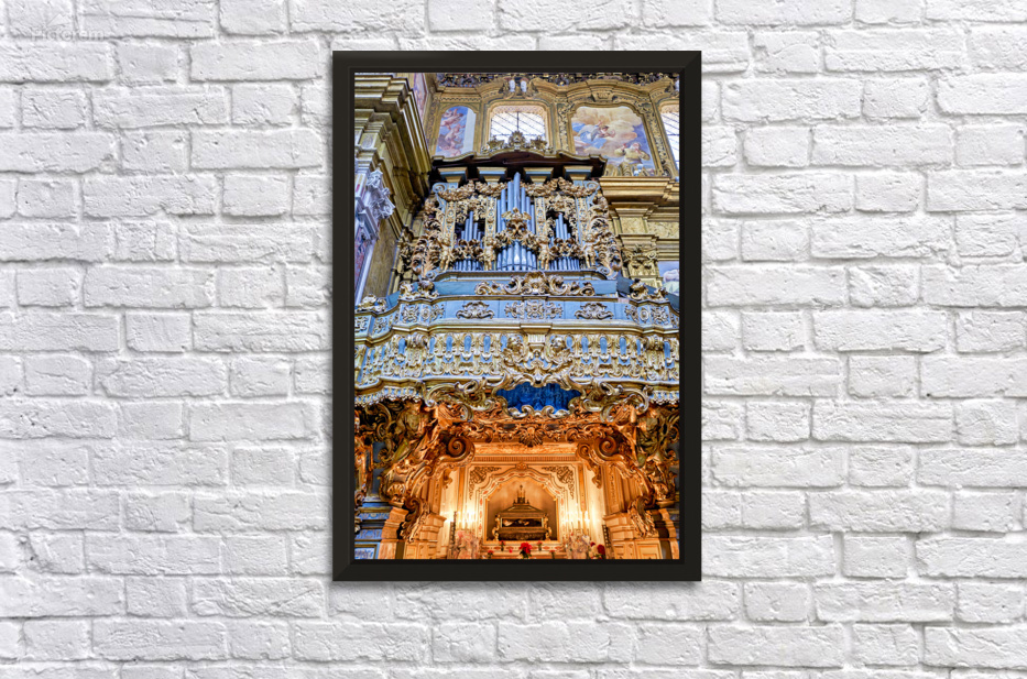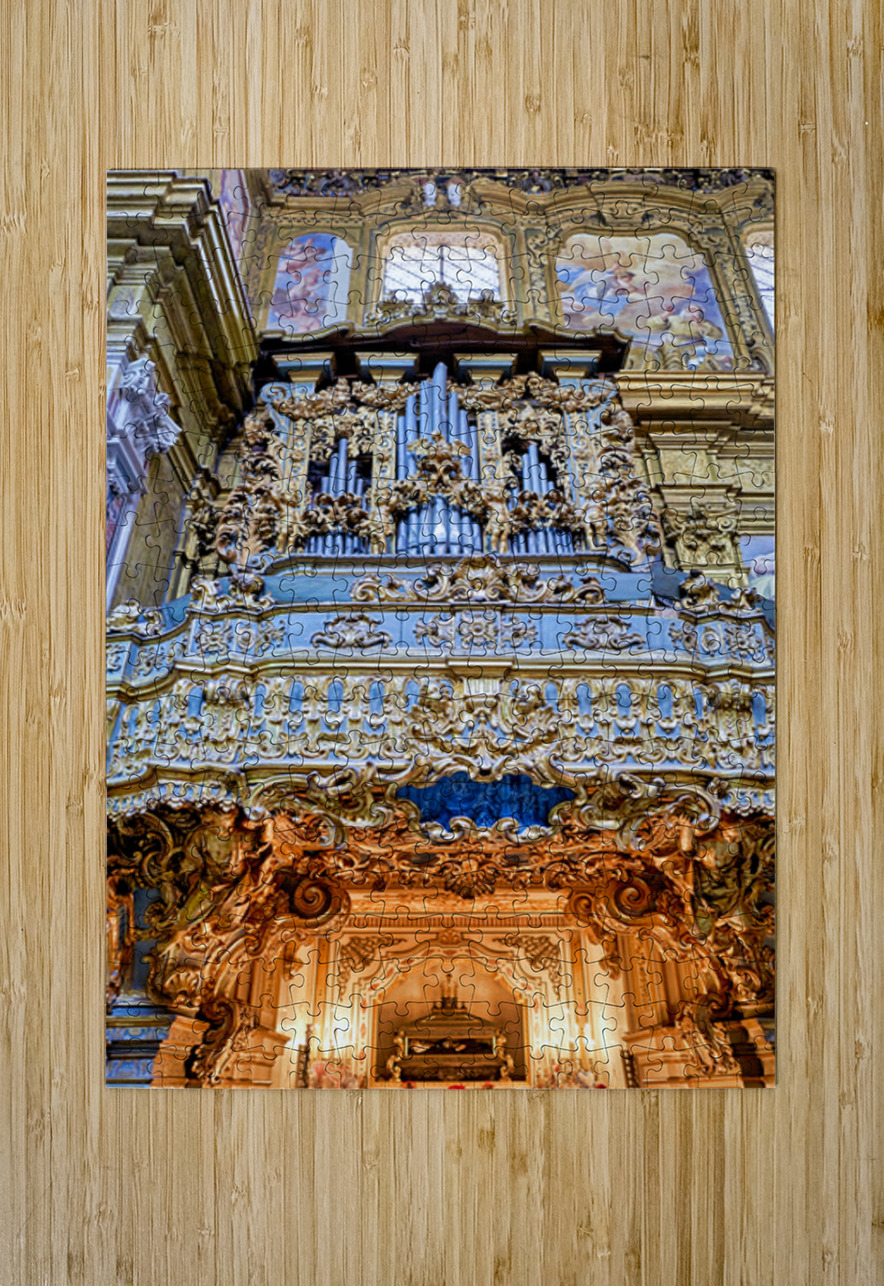 San Gregorio Armeno church displays a grand interior with an ornate altar and organ. Visitors admire the detailed decorations and architecture.
