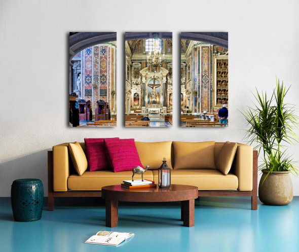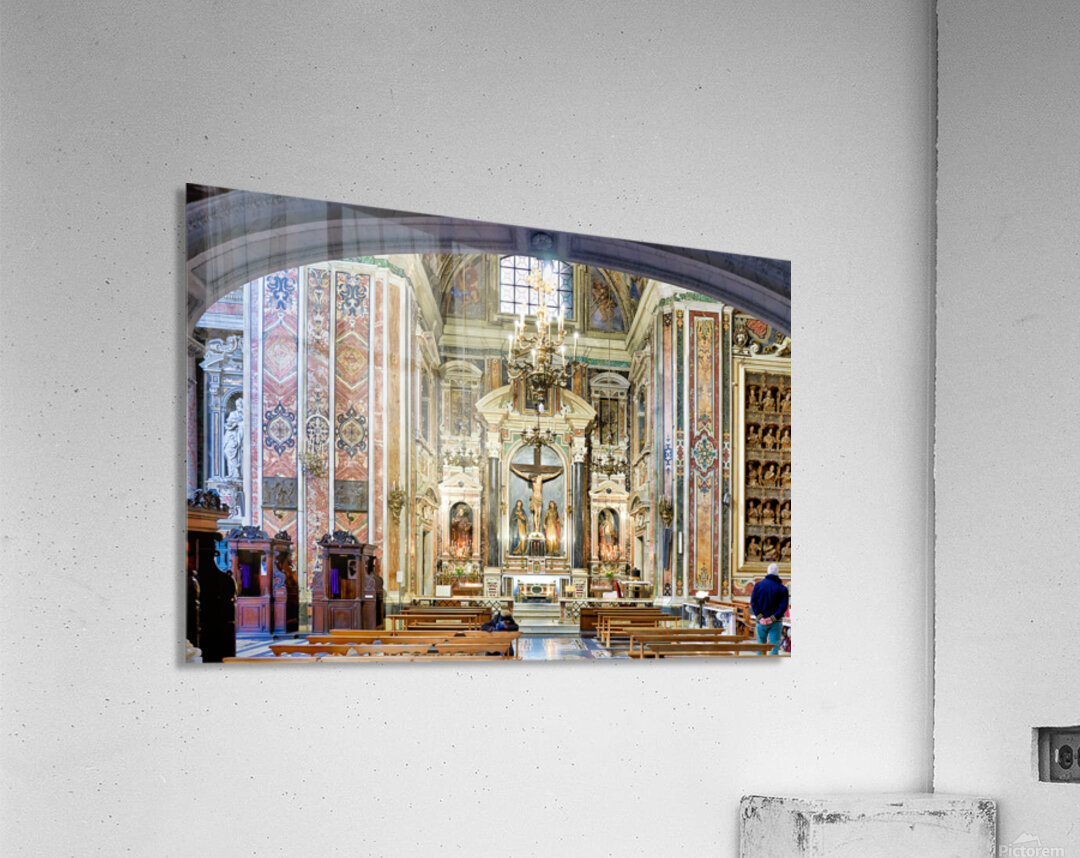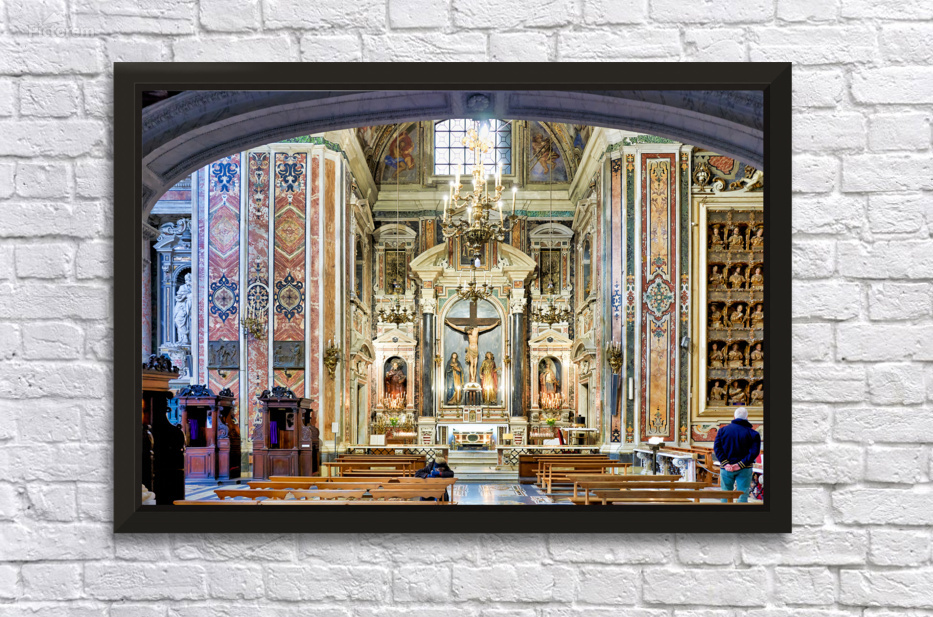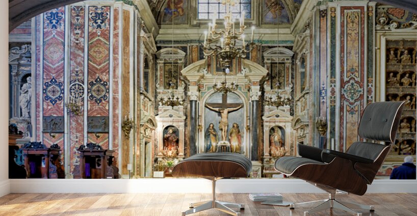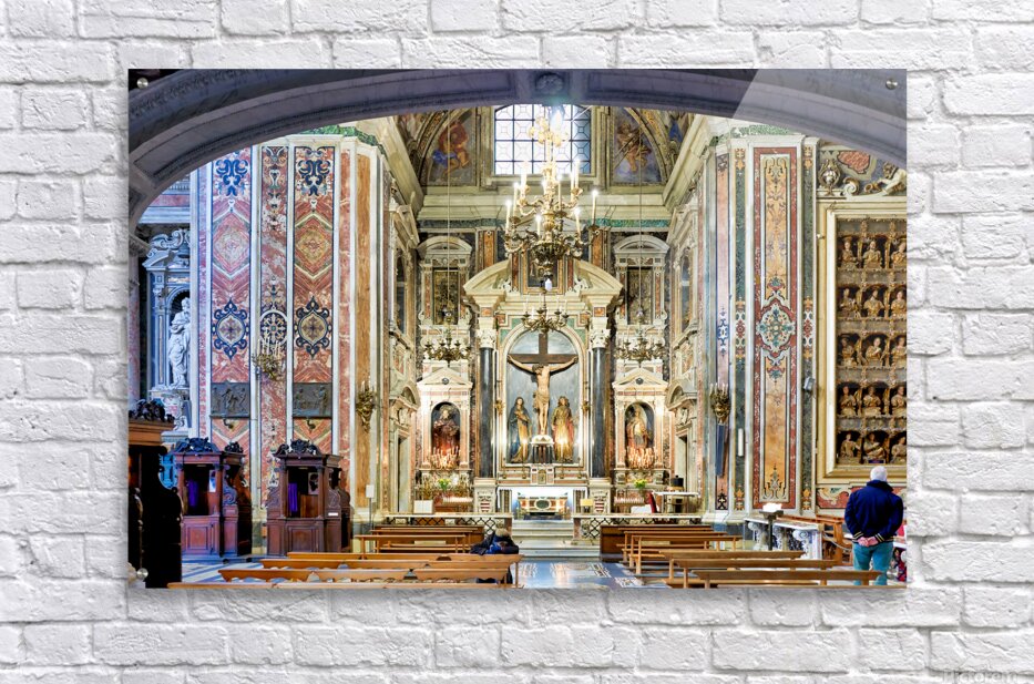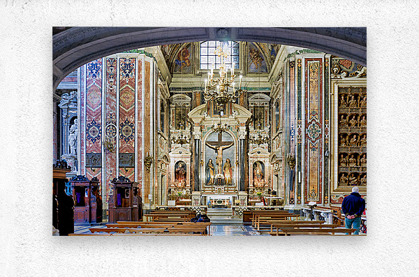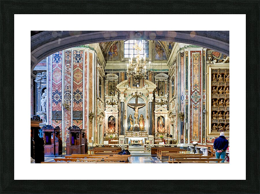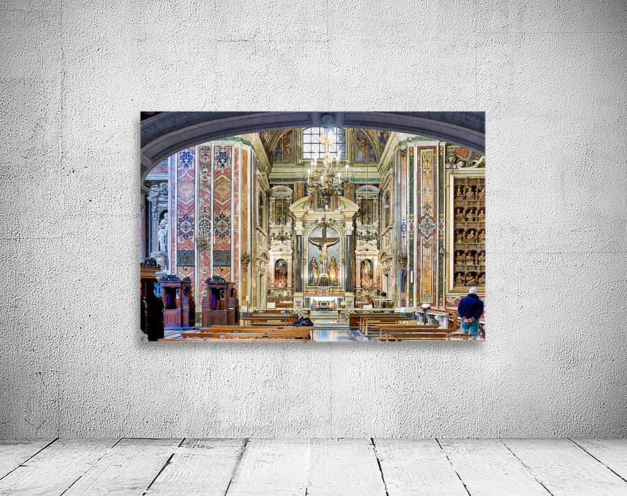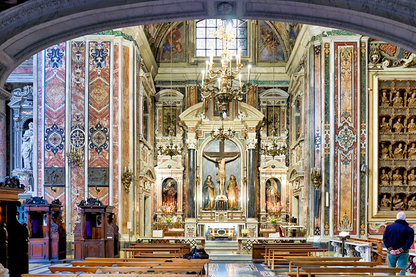 Visitors admire the detailed decorations and artwork inside Gesu Nuovo Church in Naples. The church is an example of baroque design and history.