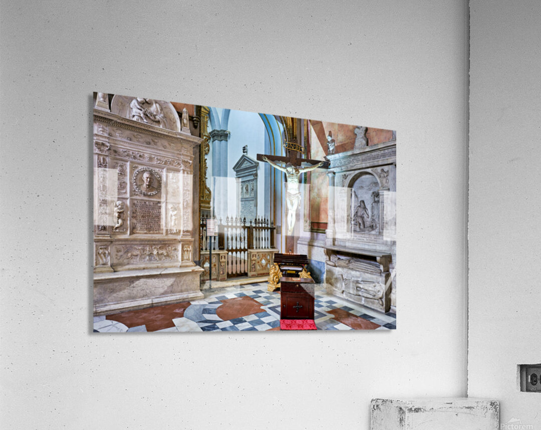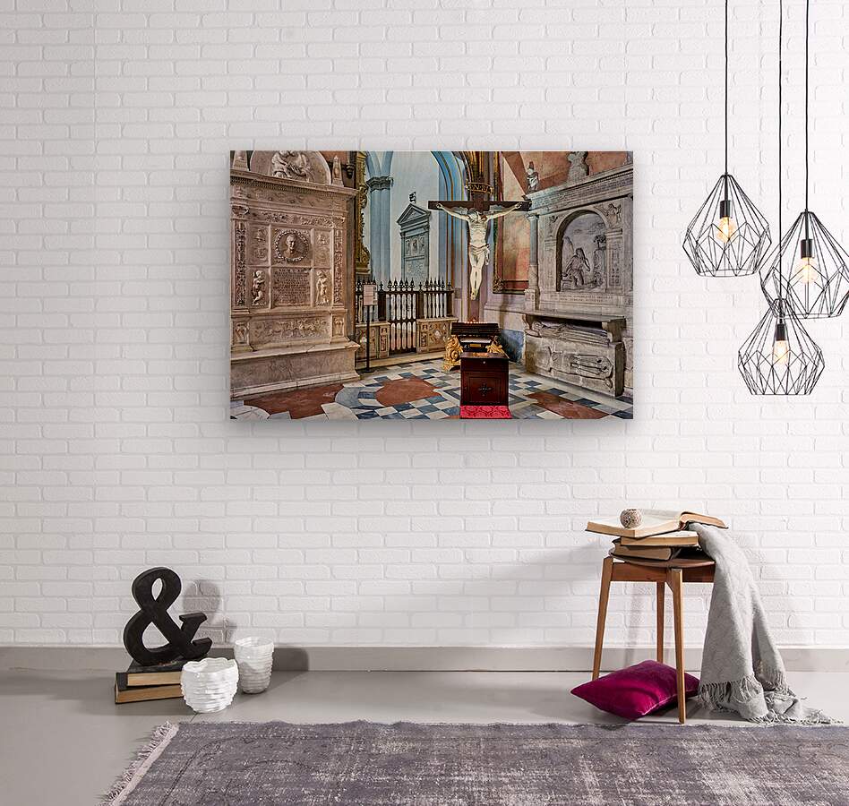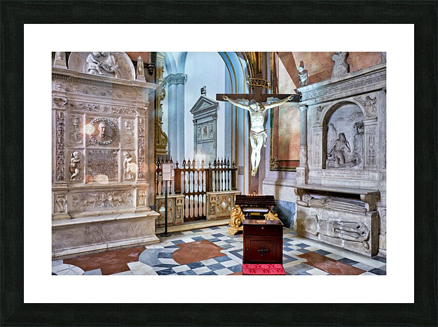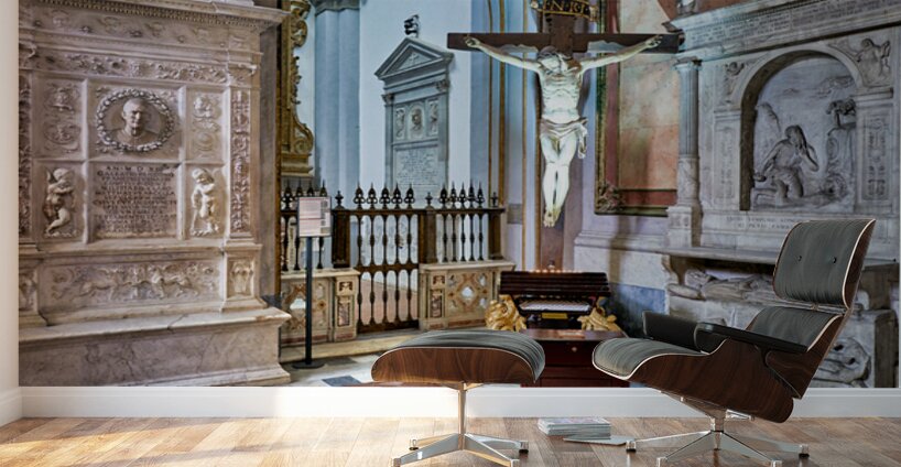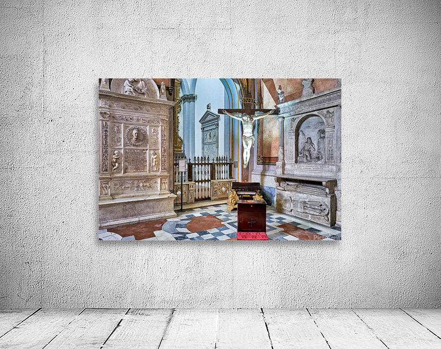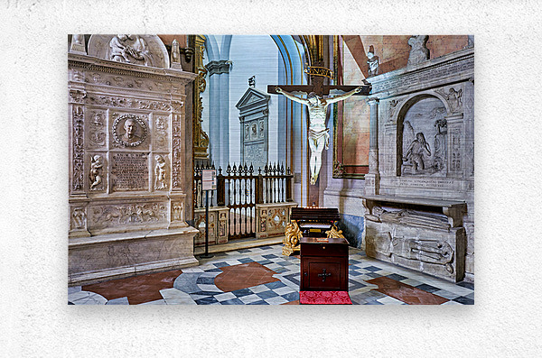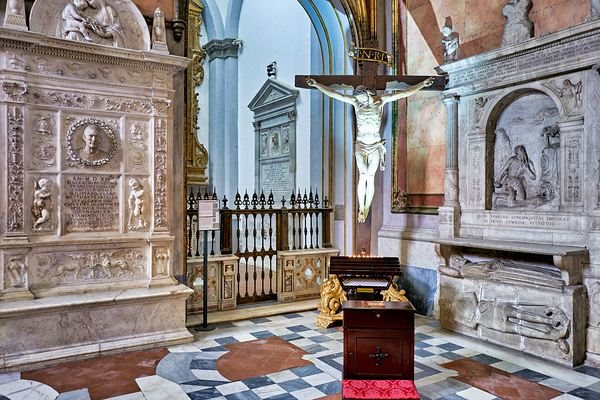 The altar area shows stone carvings and a crucifix in San Domenico Maggiore church a Gothic church in Naples Italy.
